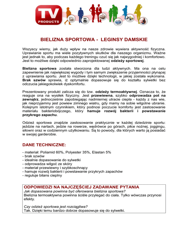 BIELIZNA SPORTOWA - LEGINSY DAMSKIE Wszyscy wiemy, jak duży wpływ na nasze zdrowie wywiera aktywność fizyczna. Uprawianie sportu ma wiele pozytywnych skutków dla naszego organizmu. Ważne jest jednak to, aby podczas każdego treningu czuć się jak najwygodniej i komfortowo. Jest to możliwe dzięki odpowiednio zaprojektowanej odzieży sportowej. Bielizna sportowa została stworzona dla ludzi aktywnych. Ma ona na celu zapewnienie jak największej wygody i tym samym zwiększenie przyjemności płynącej z uprawiania sportu. Jest to możliwe dzięki technologii, w jakiej została wykonana. Brak szwów sprawia, iż optymalnie dopasowuje się do kształtu sylwetki bez odczucia jakiegokolwiek dyskomfortu. Prezentowany produkt zalicza się do tzw. odzieży termoaktywnej. Oznacza to, że reaguje ona na wysiłek fizyczny. Jest przewiewna, szybko odprowadza pot na zewnątrz, jednocześnie zapobiegając nadmiernej utracie ciepła - każdy z nas wie, jak nieprzyjemny jest powiew zimnego wiatru, gdy mamy na sobie wilgotne ubranie. Kolejnym istotnym czynnikiem, który podnosi poczucie komfortu jest zastosowanie materiału bakteriobójczego, który hamuje rozwój bakterii i powstawanie przykrego zapachu. Odzież sportowa znajdzie zastosowanie praktycznie w każdej dziedzinie sportu: jeździe na nartach, jedzie na rowerze, wędrówce po górach, piłce nożnej, joggingu, siłowni oraz w codziennym użytkowaniu. Są to powody, dla których warto ją posiadać w swojej garderobie. DANE TECHNICZNE: - materiał: Poliamid 60%, Polyester 35%, Elastan 5% - brak szwów - idealnie dopasowanie do sylwetki - odprowadza wilgoć ze skóry - materiał przewiewny i szybkoschnący - hamuje rozwój bakterii i powstawanie przykrych zapachów - reguluje bilans cieplny ODPOWIEDZI NA NAJCZĘŚCIEJ ZADAWANE PYTANIA Jak dopasowana powinna być oferowana bielizna sportowa? Bielizna termoaktywna powinna ściśle przylegać do ciała. Tylko wówczas przynosi efekty. Czy odzież sportowa jest rozciągliwa? Tak. Dzięki temu bardzo dobrze dopasowuje się do sylwetki.