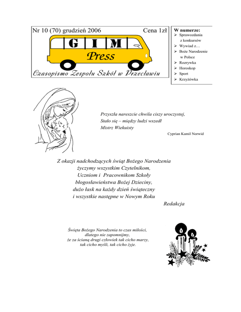 Nr 10 (70) grudzień 2006 Cena 1zł Cz as opis mo Ze społu Szkół w P rz e cławiu W numerze: Sprawozdania z konkursów Wywiad z… BoŜe Narodzenie w Polsce Rozrywka Horoskop Sport KrzyŜówka Przyszła nareszcie chwila ciszy uroczystej, Stało się – między ludzi wszedł Mistrz Wiekuisty Cyprian Kamil Norwid Z okazji nadchodzących świąt BoŜego Narodzenia Ŝyczymy wszystkim Czytelnikom, Uczniom i Pracownikom Szkoły błogosławieństwa BoŜej Dzieciny, duŜo łask na kaŜdy dzień świąteczny i wszystkie następne w Nowym Roku Redakcja Święta BoŜego Narodzenia to czas miłości, dlatego nie zapomnijmy, Ŝe za ścianą drugi człowiek tak cicho marzy, tak cicho myśli, tak cicho Ŝyje. Sprawozdania ze szkolnych etapów konkursów przedmiotowych 1 grudnia w konkursie z biologii startowało 5 uczniów. Najwięcej, bo 17p. zdobył Michał Harla z IIIb. Niestety, nikt nie przekroczył progu 60% punktów. 5 grudnia 19 uczniów rozwiązywali zadania z informatyki. Jednemu uczniowi Rafałowi Wilkowi IIIb brakło tylko 1 punktu, aby zakwalifikował się do eliminacji wojewódzkich. 7 listopada 2006 roku siedmioro uczniów zmagało się z zadaniami z chemii. Troje spośród nich uzyskało wynik powyŜej 60%. Są to: Sebastian Jaszcz IIIb Karolina DroŜdŜowska IIIb Sylwia Gawryś IIIb. 8 grudnia 2006 roku 22 uczniów rozwiązywało zadania z matematyki. 60% punktów moŜliwych do zdobycia uzyskali następujący uczniowie: Sebastian Jaszcz IIIb Agnieszka Motyl IIb Klaudia Strzelczyk IIIa Tomasz Kozioł IIb Sylwia Szewc IIIa Jan Wyduba IIIb Paulina Gancarczyk IIb Karolina DroŜdŜowska IIIb. 10 listopada 2006 roku odbyły konkurs z języka angielskiego. Prace pisało 31 uczniów. Próg powyŜej 60% przekroczyli następujący uczniowie: Katarzyna Misiewicz IIIa Monika Wenio IIa Iwona Zielińska IIIa Marta Bukowy IIIa Wieczerzak Justyna IIIb Dominika Kujawska IIIa Izabela Dudek IIIa 12 grudnia 2006 roku konkurs pisali uczniowie zainteresowani geografią. Siedmioro wykonywało zadania, ale nikt nie uzyskał wymaganej liczby punktów, która kwalifikowałaby ich do dalszej rywalizacji. Najwięcej punktów uzyskała Klaudia Strzelczyk. 14 grudnia 2006 roku 28 uczniów pisało zadania z języka polskiego. Okazało się, Ŝe 13 osób uzyskało wynik powyŜej 60% punktów moŜliwych do uzyskania. Są to: Dominika Kujawska IIIa Magdalena Strzelczyk IIIa Karolina DroŜdŜowska IIIb Natalia Nawalany IIa Monika Wenio IIa Sylwia Szewc IIIa Karolina Sędłak IIIa Sylwia DroŜdŜowska IIIg Izabela Dudek IIIa Klaudia Strzelczyk IIIa Katarzyna Misiewicz IIIa Magdalena Młynarczyk Ib. Sylwia Gawryś IIIb 17 listopada 2006 roku odbył się konkurs z języka niemieckiego. Z zadaniami zmagały się tylko trzy uczennice z klasy IIa. Niestety, nie otrzymały powyŜej 60% punktów, by móc walczyć w drugim etapie. 24 listopada 2006 roku 24 osoby pisały test z historii. Niestety nikt nie przekroczył progu 60% punktów moŜliwych do uzyskania. Najlepszy wynik uzyskali: Karolina DroŜdŜowska, Sebastian Jaszcz i Sebastian Bugaj. 28 listopada 2006 roku uczniowie rozwiązywali zadania z fizyki. Z 6 uczniów troje uzyskało wynik kwalifikujący ich do etapu wojewódzkiego. Są to: Sebastian Jaszcz IIIb Karolina DroŜdŜowska IIIb Klaudia Strzelczyk IIIa. Serdeczne gratulacje dla wszystkich tych, którzy pracowali, by zdobywać punkty w konkursach. Mamy nadzieję, Ŝe trud włoŜony w naukę się opłaci, jeśli nie wielkimi osiągnięciami , to swoją małą lub duŜą satysfakcją. Wywiad z panią dyrektor Barbarą Dybską Grudzień to chyba najlepszy miesiąc na wywiad z naszą panią Dyrektor, gdyŜ właśnie 4 grudnia obchodzi imieniny. My znamy panią Barbarę Dybską juŜ trzy lata i podziwiamy, zwłaszcza za anielską cierpliwość w stosunku do niektórych uczniów naszej szkoły. Chciałybyśmy jednak przybliŜyć sylwetkę pani Dyrektor tym wszystkim, którzy dopiero rozpoczęli naukę w gimnazjum lub liceum. Dla pani Dyrektor poniedziałek był dniem pełnym gości, mimo to znalazła dla nas chwilkę. Zadałyśmy kilka pytań, a odpowiedzi prezentujemy poniŜej. Skorzystałyśmy z okazji i zapytałyśmy niemal o wszystko. Oto, co usłyszałyśmy: -Główna cecha mojego charakteru... -Optymizm i wiara w ludzi. -Cechy, których szukam u męŜczyzn... -Poczucie humoru, bo większość męŜczyzn jest zasadniczych i powaŜnych. -U przyjaciół najbardziej cenię... -Lojalność. -Moja główna wada... -Lenistwo. -Moje ulubione zajęcie... -Praca w szkole. -Moje marzenie o szczęściu... -Trwałość. Szczęście szybko się kończy. -Dar natury, który chciałabym posiadać... -Muzykalność. Zawsze chciałam śpiewać, a głosu nie mam w ogóle. -Obecny stan mojego umysłu... -Lekko zakręcony. -Błędy, które najłatwiej wybaczam... -Wszystkie. Nie ma takiej rzeczy, której nie potrafiłabym wybaczyć. -Co wzbudza we mnie obsesyjny lęk... -Woda, od roku uczę się pływać. -Co byłoby dla mnie największym nieszczęściem... -Utrata marzeń. -Kim chciałabym być, gdybym nie była tym, kim jestem... -PodróŜnikiem. -Kiedy kłamię... -Kiedy jestem do tego zmuszona. -Słowa, których naduŜywam... -Nie mam takich. -Ulubieni bohaterowie literaccy... -Romeo i Julia. -Czego nie lubię ponad wszystko... -Fałszu i nieszczerości. -Moja dewiza -śyć tak, aby nie ranić innych. Z tej okazji zajrzałyśmy równieŜ do ksiąŜki Henryki Łuszczyńskiej Znaczenie imion i oto, co znalazłyśmy przy charakterystyce imienia Barbara. Barbara - to typ kobiety spokojnej, niezaleŜnej, pewnej siebie i do perfekcji szlachetnej. Zawsze pozostaje lojalna wobec przełoŜonych, jak i podwładnych. Lubi poznawać inne kraje, toteŜ duŜo czyta, a gdy ma szansę, podróŜuje. Jest wierna swym Ŝyciowym zasadom. Bardzo czuła na ludzką krzywdę. Ciągle poszukuje dobrych rozwiązań trudnych spraw Ŝyciowych. Lubi wolność, swobodę myślenia i działanie społeczne. Nic dodać, nic ująć – przecieŜ to portret naszej