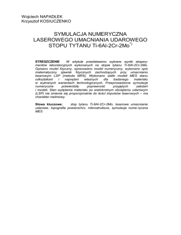 Wojciech NAPADŁEK Krzysztof KOSIUCZENKO SYMULACJA NUMERYCZNA LASEROWEGO UMACNIANIA UDAROWEGO STOPU TYTANU Ti-6Al-2Cr-2Mo*) STRESZCZENIE W artykule przedstawiono wybrane wyniki eksperymentów laboratoryjnych wykonanych na stopie tytanu Ti-6Al-2Cr-2Mo. Opisano model fizyczny, opracowano model numeryczny, wykonano opis matematyczny zjawisk fizycznych zachodzących przy umacnianiu laserowym LSP (metoda MRS). Wykonano siatki modeli MES stanu odkształceń i naprężeń własnych dla badanego materiału w wybranych wariantach technologicznych. Przeprowadzone symulacje numeryczne potwierdziły poprawność przyjętych założeń i modeli. Stan wytężenia materiału po wielokrotnym obciążeniu udarowym (LSP) nie zmienia się proporcjonalnie do ilości impulsów laserowych – ma charakter nieliniowy. Słowa kluczowe: stop tytanu Ti-6Al-2Cr-2Mo, laserowe umacnianie udarowe, topografia powierzchni, mikrostruktura, symulacja nume-ryczna MES
