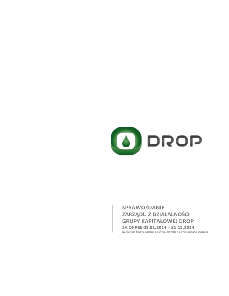 SPRAWOZDANIE ZARZĄDU Z DZIAŁALNOŚCI GRUPY KAPITAŁOWEJ DROP ZA OKRES 01.01.2014 – 31.12.2014 (wszystkie kwoty podana są w tys. złotych o ile nie podano inaczej) DROP S.A. SPRAWOZDANIE ZARZĄDU Z DZIAŁALNOŚCI GRUPY KAPITAŁOWEJ DROP ZA OKRES 01.01.2014 – 31.12.2014 r. (wszystkie kwoty podane są w tys. złotych o ile nie podano inaczej) Najważniejsze informacje dotyczące 2014 Finansowe (dane skonsolidowane) Przychody ze sprzedaży w tys. złotych 386 126 2014 Średnia cena miedzi w PLN/t 419 029 21 630 2013 2014 spadek przychodów ze sprzedaży o 7,9% Zysk (strata) na działalności operacyjnej w tys. złotych 2014 2013 23 130 2013 spadek średniej ceny miedzi w złotych o 6,5% Zysk (strata) netto w tys. złotych 2014 2013 -1 348 -1 946 -4 887 -3 548 wzrost straty na działalności operacyjnej o 82,3% wzrost straty netto o 262,5% 2 DROP S.A. SPRAWOZDANIE ZARZĄDU Z DZIAŁALNOŚCI GRUPY KAPITAŁOWEJ DROP ZA OKRES 01.01.2014 – 31.12.2014 r. (wszystkie kwoty podane są w tys. złotych o ile nie podano inaczej) List Prezesa Zarządu Szanowni Państwo, W 2014 r. niestety nie udało się spółce DROP S.A. osiągnąć dodatniego wyniku finansowego. Strata netto wynikała przede wszystkim ze szkodliwych (podjętych w złej wierze) działań organów podatkowych. W dniu 7 stycznia 2014 r. Dyrektor Izby Skarbowej w Warszawie wydał decyzję, w której utrzymał decyzję zabezpieczającą Naczelnika Drugiego Mazowieckiego Urzędu Skarbowego w Warszawie na 90 mln złotych. Dyrektor Izby Skarbowej w Warszawie podjął taką decyzję, mimo wniosku Naczelnika Drugiego Mazowieckiego Urzędu Skarbowego w Warszawie o uchylenie decyzji i przekazanie sprawy do ponownego rozpatrzenia. Dyrektor Izby Skarbowej w Warszawie podjął taką decyzję, mimo wiedzy o tym, że potencjalne zobowiązania podatkowe DROP S.A. wynoszą 29 mln złotych, a nie 75 mln złotych (kwota z wniosku Dyrektora Urzędu Kontroli Skarbowej w Bydgoszczy z 21 czerwca 2013 r.). W dniu 10 stycznia 2014 r. Naczelnik Drugiego Mazowieckiego Urzędu Skarbowego wezwał bank prowadzący rachunki DROP S.A. do blokady 90 mln złotych na tychże rachunkach. Urzędnicy organów podatkowych podjęli decyzje wobec DROP S.A. w złej wierze, ponieważ wiedzieli, że potencjalne, sporne zobowiązania podatkowe DROP S.A. wynikające z faktu, że jakoby spółka nie dochowała należytej staranności w relacjach z dostawcami są kilkukrotnie mniejsze od wnioskowanych decyzji zabezpieczających. Powyższe decyzje z początku roku przełożyły się w znaczący sposób na działalność DROP S.A. w kolejnych miesiącach. W 2015 r. będą rozpatrywane przez Wojewódzki Sąd Administracyjny w Warszawie błędne decyzje Dyrektora Urzędu Kontroli Skarbowej w Warszawie oraz Dyrektora Izby Skarbowej w Warszawie dotyczące rozliczeń podatku VAT za poszczególne miesiące 2009 i 2010 r. Wierzę, że niezawiśli sędziowie sądów administracyjnych rozstrzygną spory na korzyść DROP S.A. Trudno przecież akceptować sytuację, w której urzędnicy skarbowi zgodnie z instrukcją napisaną w Urzędzie Kontroli Skarbowej w Bydgoszczy wydają decyzję wymiarową bez spójnego uzasadnienia, aby zapewnić sobie 80% skuteczność. Dziękuję bardzo Zbigniew Chwedoruk Prezes Zarządu 3 DROP S.A. SPRAWOZDANIE ZARZĄDU Z DZIAŁALNOŚCI GRUPY KAPITAŁOWEJ DROP ZA OKRES 01.01.2014 – 31.12.2014 r. (wszystkie kwoty podane są w tys. złotych o ile nie podano inaczej) Informacje ogólne o DROP S.A. Siedziba: Warszawa Forma prawna: Spółka akcyjna DROP S.A. została utworzona i działa na podstawie przepisów prawa polskiego. Spółka Przepisy prawa, na podstawie których i została utworzona na podstawie przepisów Kodeksu Handlowego i działa zgodnie z zgodnie z którymi działa DROP S.A.: regulacją Kodeksu Spółek Handlowych. DROP S.A. jako spółka publiczna działa na podstawie regulacji dotyczących funkcjonowania rynku kapitałowego Kraj: Polska ul. Syta 114Z/1 Adres: 02-987 Warszawa Telefon: +48 (22) 885-14-21 Fax: +48 (22) 885-14-22 Poczta elektroniczna: [email protected] Strona internetowa: www.drop-sa.pl Spółka została wpisana do rejestru handlowego prowadzonego przez Sąd Rejonowy dla m. st. Warszawy, Wydział XVI Gospodarczy Rejestrowy w dniu 16 listopada 2000 r. pod numerem RHB 62794 jako DROP Spółka z ograniczoną odpowiedzialnością z siedzibą w Warszawie. W dniu 16 kwietnia 2004 r. Postanowieniem Sądu Rejonowego dla m. st. Warszawy, XIX Wydział Gospodarczy Krajowego Rejestru Sądowego, Spółka została wpisana do rejestru przedsiębiorców Krajowego Rejestru Sądowego, pod numerem KRS 0000203813 jako DROP Spółka z ograniczoną odpowiedzialnością z siedzibą w Warszawie. W dniu 29 grudnia 2000 r. Drugi Urząd Skarbowy dla Warszawy Śródmieścia podjął decyzję w sprawie nadania numeru identyfikacji podatkowej, Spółce został nadany następujący Numer Identyfikacji Podatkowej: NIP 526-24-99-339. W dniu 22 listopada 2000 r. został nadany numer identyfikacyjny REGON przez Główny Urząd Statystyczny w Warszawie. Krajowy Rejestr Urzędowy Podmiotów Gospodarki Narodowej przy Głównym Urzędzie Statystycznym w Warszawie nadał następujący numer REGON 016896001. W dniu 6 lipca 2007 r. Postanowieniem Sądu Rejonowego dla m. st. Warszawy, XII Wydział Gospodarczy Krajowego Rejestru Sądowego, zarejestrowane zostało przekształcenie Spółki w spółkę akcyjną i została ona wpisana do rejestru przedsiębiorców Krajowego Rejestru Sądowego, pod numerem KRS 284461 jako DROP Spółka Akcyjna. Akcjonariusze na dzień 31 grudnia 2014r. Akcjonariusz PE-INVEST Sp. Z o.o. Liczba akcji % udział w strukturze akcjonariatu % udział w liczbie głosów na Walnym Zgromadzeniu 4 489 854 76,52% 76,52% DROP S.A. 580 000 9,88% 9,88% Pozostali 797 849 13,60% 13,60% 5 867 703 100,00% 100,00% Razem 4 SPRAWOZDANIE ZARZĄDU Z DZIAŁALNOŚCI GRUPY KAPITAŁOWEJ DROP ZA OKRES 01.01.2014 – 31.12.2014 r. DROP S.A. (wszystkie kwoty podane są w tys