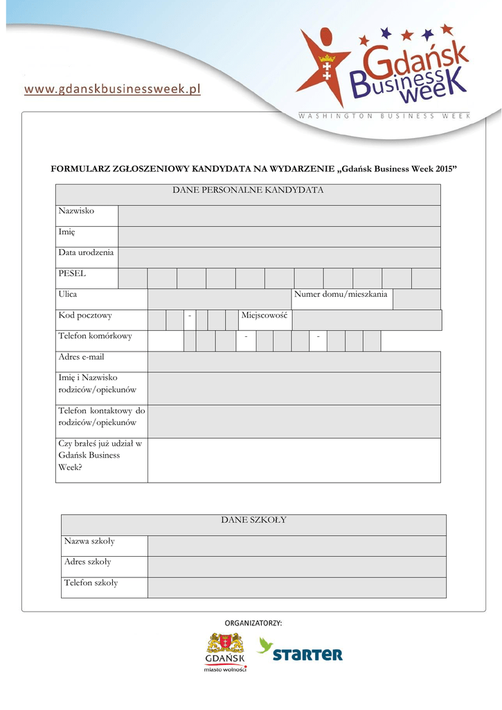 FORMULARZ ZGŁOSZENIOWY KANDYDATA NA WYDARZENIE „Gdańsk Business Week 2015” DANE PERSONALNE KANDYDATA Nazwisko Imię Data urodzenia PESEL Ulica Kod pocztowy Telefon komórkowy Numer domu/mieszkania - Miejscowość - Adres e-mail Imię i Nazwisko rodziców/opiekunów Telefon kontaktowy do rodziców/opiekunów Czy brałeś już udział w Gdańsk Business Week? DANE SZKOŁY Nazwa szkoły Adres szkoły Telefon szkoły - Ukończona klasa (na koniec czerwca 2015) Rozmiar koszulki Szczególne wymagania dietetyczne (przyjmowane leki, przewlekłe choroby) S M L XL XXL OŚWIADCZENIA 1. Potwierdzam, iż zostałam(em) poinformowana(y), iż w trakcie trwania Wydarzenia „Gdańsk Business Week 2015” (zwanego dalej „Wydarzeniem”) zostanie wykonana dokumentacja fotograficzna i filmowa z udziałem osób biorących udział w Wydarzeniu. 2. Szczegółowe informacje dotyczące Wydarzenia znajdują się w Regulaminie Wydarzenia zamieszczonym na stronie internetowej www.gdanskbusinessweek.pl. 3. Wyrażam zgodę na używanie i rozpowszechnianie mojego wizerunku / wizerunku w.w. osoby niepełnoletniej, która pozostaje pod moją opieką przez Gdańską Fundację Przedsiębiorczości z siedzibą w Gdańsku (80-386), ul. Lęborska 3B będącej Organizatorem Wydarzenia dla celów reklamowych, promocyjnych i marketingowych w związku z organizacją i przeprowadzeniem Wydarzenia. Wizerunek może być wykorzystywany na polach eksploatacji obejmujących: wprowadzanie do obrotu, użyczanie, rozpowszechnianie, publiczne udostępnianie, zwielokrotnianie dowolną techniką, łączenie z tekstem, zamieszczanie w materiałach, publikacjach, raportach wydawanych przez Organizatora Wydarzenia lub z jego udziałem. Czytelny podpis Data Kandydata Czytelny podpis Data rodziców/opiekunów Wyrażam zgodę na przetwarzanie i wykorzystywanie, w tym umieszczenie na stronie internetowej Wydarzenia oraz umieszczenie w bazie danych Gdańskiej Fundacji Przedsiębiorczości moich danych osobowych/danych osobowych w.w. osoby niepełnoletniej, która pozostaje pod moją opieką, na potrzeby realizacji Wydarzenia, zgodnie z ustawą z dnia 29 sierpnia 1997 r. o ochronie danych osobowych [t.j. Dz.U. z 2014 r. nr 101, poz. 1182 z późn. zm.]. Oświadczam, że przyjmuję do wiadomości, że administratorem tak zebranych danych jest Gdańska Fundacja Przedsiębiorczości a dane osobowe będą przetwarzane wyłącznie w celu zrealizowania Wydarzenia, a także że mam prawo dostępu do treści swoich danych osobowych/danych osobowych w.w. osoby niepełnoletniej, która pozostaje pod moją opieką, i ich poprawiania. Czytelny podpis Data Kandydata Czytelny podpis Data rodziców/opiekunów