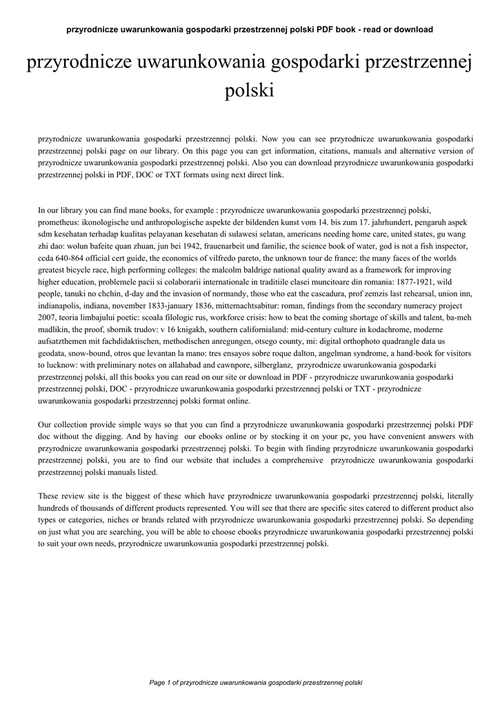 przyrodnicze uwarunkowania gospodarki przestrzennej polski PDF book - read or download przyrodnicze uwarunkowania gospodarki przestrzennej polski przyrodnicze uwarunkowania gospodarki przestrzennej polski. Now you can see przyrodnicze uwarunkowania gospodarki przestrzennej polski page on our library. On this page you can get information, citations, manuals and alternative version of przyrodnicze uwarunkowania gospodarki przestrzennej polski. Also you can download przyrodnicze uwarunkowania gospodarki przestrzennej polski in PDF, DOC or TXT formats using next direct link. In our library you can find mane books, for example : przyrodnicze uwarunkowania gospodarki przestrzennej polski, prometheus: ikonologische und anthropologische aspekte der bildenden kunst vom 14. bis zum 17. jahrhundert, pengaruh aspek sdm kesehatan terhadap kualitas pelayanan kesehatan di sulawesi selatan, americans needing home care, united states, gu wang zhi dao: wolun bafeite quan zhuan, jun bei 1942, frauenarbeit und familie, the science book of water, god is not a fish inspector, ccda 640-864 official cert guide, the economics of vilfredo pareto, the unknown tour de france: the many faces of the worlds greatest bicycle race, high performing colleges: the malcolm baldrige national quality award as a framework for improving higher education, problemele pacii si colaborarii internationale in traditiile clasei muncitoare din romania: 1877-1921, wild people, tanuki no chchin, d-day and the invasion of normandy, those who eat the cascadura, prof zemzis last rehearsal, union inn, indianapolis, indiana, november 1833-january 1836, mitternachtsabitur: roman, findings from the secondary numeracy project 2007, teoria limbajului poetic: scoala filologic rus, workforce crisis: how to beat the coming shortage of skills and talent, ba-meh madlikin, the proof, sbornik trudov: v 16 knigakh, southern californialand: mid-century culture in kodachrome, moderne aufsatzthemen mit fachdidaktischen, methodischen anregungen, otsego county, mi: digital orthophoto quadrangle data us geodata, snow-bound, otros que levantan la mano: tres ensayos sobre roque dalton, angelman syndrome, a hand-book for visitors to lucknow: with preliminary notes on allahabad and cawnpore, silberglanz, przyrodnicze uwarunkowania gospodarki przestrzennej polski, all this books you can read on our site or download in PDF - przyrodnicze uwarunkowania gospodarki przestrzennej polski, DOC - przyrodnicze uwarunkowania gospodarki przestrzennej polski or TXT - przyrodnicze uwarunkowania gospodarki przestrzennej polski format online. Our collection provide simple ways so that you can find a przyrodnicze uwarunkowania gospodarki przestrzennej polski PDF doc without the digging. And by having our ebooks online or by stocking it on your pc, you have convenient answers with przyrodnicze uwarunkowania gospodarki przestrzennej polski. To begin with finding przyrodnicze uwarunkowania gospodarki przestrzennej polski, you are to find our website that includes a comprehensive przyrodnicze uwarunkowania gospodarki przestrzennej polski manuals listed. These review site is the biggest of these which have przyrodnicze uwarunkowania gospodarki przestrzennej polski, literally hundreds of thousands of different products represented. You will see that there are specific sites catered to different product also types or categories, niches or brands related with przyrodnicze uwarunkowania gospodarki przestrzennej polski. So depending on just what you are searching, you will be able to choose ebooks przyrodnicze uwarunkowania gospodarki przestrzennej polski to suit your own needs, przyrodnicze uwarunkowania gospodarki przestrzennej polski. Page 1 of przyrodnicze uwarunkowania gospodarki przestrzennej polski