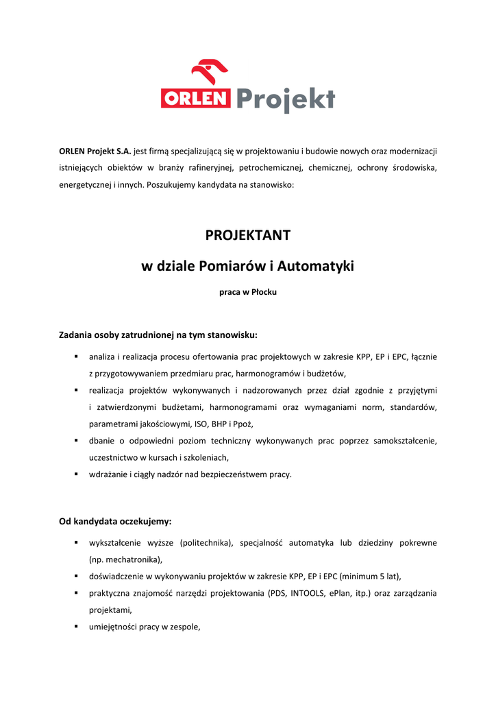 ORLEN Projekt S.A. jest firmą specjalizującą się w projektowaniu i budowie nowych oraz modernizacji istniejących obiektów w branży rafineryjnej, petrochemicznej, chemicznej, ochrony środowiska, energetycznej i innych. Poszukujemy kandydata na stanowisko: PROJEKTANT w dziale Pomiarów i Automatyki praca w Płocku Zadania osoby zatrudnionej na tym stanowisku: analiza i realizacja procesu ofertowania prac projektowych w zakresie KPP, EP i EPC, łącznie z przygotowywaniem przedmiaru prac, harmonogramów i budżetów, realizacja projektów wykonywanych i nadzorowanych przez dział zgodnie z przyjętymi i zatwierdzonymi budżetami, harmonogramami oraz wymaganiami norm, standardów, parametrami jakościowymi, ISO, BHP i Ppoż, dbanie o odpowiedni poziom techniczny wykonywanych prac poprzez samokształcenie, uczestnictwo w kursach i szkoleniach, wdrażanie i ciągły nadzór nad bezpieczeństwem pracy. Od kandydata oczekujemy: wykształcenie wyższe (politechnika), specjalność automatyka lub dziedziny pokrewne (np. mechatronika), doświadczenie w wykonywaniu projektów w zakresie KPP, EP i EPC (minimum 5 lat), praktyczna znajomość narzędzi projektowania (PDS, INTOOLS, ePlan, itp.) oraz zarządzania projektami, umiejętności pracy w zespole, znajomość języka angielskiego w mowie i piśmie pozwalająca na swobodną komunikację w zakresie technicznym, mobilność (delegacje, praca poza biurem - budowa i rozruch instalacji) w zakresie wymaganym realizowanymi zadaniami, prawo jazdy kat. B, w CV proszę podać listę referencyjną zrealizowanych tematów (uczestnictwo, pełnione funkcje itp.). Oferujemy: stabilne zatrudnienie w spółce o ugruntowanej pozycji rynkowej i finansowej, pracę w dynamicznym i profesjonalnym środowisku realizującym ambitne i ciekawe projekty, możliwość samorozwoju zawodowego, warunki zatrudnienia i wynagrodzenia adekwatne do osiągnięć i zaangażowania. Zainteresowanych prosimy o przesłanie CV oraz listu motywacyjnego na adres: [email protected] Informujemy, że skontaktujemy się tylko z wybranymi osobami. W CV prosimy o dopisanie następującej klauzuli: „Wyrażam zgodę na przetwarzanie moich danych osobowych zawartych w ofercie pracy dla potrzeb niezbędnych do realizacji procesu rekrutacji (zgodnie z Ustawą z dnia 29.08.97r. o Ochronie Danych osobowych Dz.U.Nr.133 poz. 833)”.