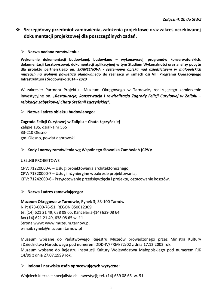 Załącznik 2b do SIWZ Szczegółowy przedmiot zamówienia, założenia projektowe oraz zakres oczekiwanej dokumentacji projektowej dla poszczególnych zadań. Nazwa nadana zamówieniu: Wykonanie dokumentacji budowlanej, budowlano – wykonawczej, programów konserwatorskich, dokumentacji kosztorysowej, dokumentacji aplikacyjnej w tym Studium Wykonalności oraz analizy popytu dla projektu partnerskiego pn. SKANSENOVA - systemowa opieka nad dziedzictwem w małopolskich muzeach na wolnym powietrzu planowanego do realizacji w ramach osi VIII Programu Operacyjnego Infrastruktura i Środowisko 2014 - 2020 W zakresie: Partnera Projektu –Muzeum Okręgowego w Tarnowie, realizującego zamierzenie inwestycyjne pn. „Restauracja, konserwacja i rewitalizacja Zagrody Felicji Curyłowej w Zalipiu – relokacja zabytkowej Chaty Stefanii Łączyńskiej”. Nazwa i adres obiektu budowlanego: Zagroda Felicji Curyłowej w Zalipiu – Chata Łączyńskiej Zalipie 135, działka nr 555 33-210 Olesno gm. Olesno, powiat dąbrowski Kody i nazwy zamówienia wg Wspólnego Słownika Zamówień (CPV): USŁUGI PROJEKTOWE CPV: 71220000-6 – Usługi projektowania architektonicznego; CPV: 71320000-7 – Usługi inżynieryjne w zakresie projektowania, CPV: 71242000-6 - Przygotowanie przedsięwzięcia i projektu, oszacowanie kosztów. Nazwa i adres zamawiającego: Muzeum Okręgowe w Tarnowie, Rynek 3; 33-100 Tarnów NIP: 873-000-76-51, REGON 850012309 tel.(14) 621 21 49, 638 08 65, Kancelaria-(14) 639 08 64 fax (14) 621 21 49, 638 08 65 w. 11 Strona www: www.muzeum.tarnow.pl, e-mail: [email protected] Muzeum wpisane do Państwowego Rejestru Muzeów prowadzonego przez Ministra Kultury i Dziedzictwa Narodowego pod numerem DDD-IV/PRM/72/02 z dnia 17.12.2002 rok. Muzeum wpisane do Rejestru Instytucji Kultury Województwa Małopolskiego pod numerem RIK 14/99 z dnia 27.07.1999 rok. Imiona i nazwiska osób opracowujących wytyczne: Wojciech Kiecka – specjalista ds. inwestycji; tel. (14) 639 08 65 w. 51 1 1. Opis ogólny przedmiotu zamówienia: 1.1. Lokalizacja Województwo małopolskie, powiat dąbrowski, gm. Olesno – miejscowość Zalipie 135; działka nr 555 (obecnie lokalizacja – Zalipie 62; działka nr 408). 1.2. Stan własności Budynek przeznaczony do translokacji - tzw. chata Łączyńskiej - własność Muzeum Okręgowego – nabycie od osoby fizycznej w 2016 roku, wpis do inwentarza muzealiów MOT pod nr MT-E-BL/2. Działka nr 555 w Zalipiu - wieczyste użytkowanie gruntu do dn. 14.04.2091 r.- decyzja Wojewody MałopolskiegoGG.VIII.7723/IV/1/4/01/DG z dn. 8.02.2001 r.; 1.3. Ogólna charakterystyka lokalizacji W chwili obecnej przedmiotowy obiekt znajduje się w Zalipiu (nr 62) na działce nr 408 i planuje się jego translokację na teren Zagrody Felicji Curyłowej MOT. Działka, na której znajduje się Zagroda położona jest równolegle wzdłuż drogi w formie zwężającego się ku północy klina. Zagrodę stanowi kompleks budynków: dom mieszkalny, obora, stodoła, bróg oraz chata biedniacka. Budynki zagrody usytuowane są w południowej części działki w układzie litery U – obora równolegle do drogi, od południa dom mieszkalny, a od północy stodoła. Za stodołą zlokalizowany jest bróg, a dalej za nim – chata biedniacka. Teren od strony drogi częściowo ogrodzony płotem drewnianym, którego obecny stan techniczny nie nadaje się do remontu. Dojścia do obiektów nieutwardzone (ścieżki gruntowe). Planuje się zlokalizowanie chaty Łączyńskiej pomiędzy stodołą a chatą biedniacką, co wymaga jednak przeniesienia istniejącego brogu oraz szamba wybieralnego (wraz z odcinkiem kanalizacji). Planowana inwestycja zlokalizowana jest na terenie nie objętym miejscowym planem zagospodarowania przestrzennego, obiekty wraz z gruntem podlegają ochronie konserwatorskiej wpis do Rejestru Zabytków nr A-124 z 07.06.1977 roku. 1.4. Ogólna charakterystyka obiektu dom mieszkalny jednotraktowy - wzniesiony w 1886 roku, eksponat kubaturowy zakupiony w 2016 roku przez MOT. Przedmiotowy budynek jest chałupą drewnianą szeroko frontową o asymetrycznym układzie jednotraktowym wybudowaną w 1886 roku. Budynek parterowy niepodpiwniczony ze strychem nieużytkowym. Bryła budynku o regularnym kształcie, z dachem dwuspadowym. 1.5. Charakterystyczne parametry określające wielkość obiektu 1.5.1. Budynek mieszkalny: 2 powierzchnia zabudowy 80,60 m2 powierzchnia użytkowa 73,50 m2 kubatura budynku 298,22 m3 liczba kondygnacji jedna nadziemna 1.5.2. Ogrodzenie: długość około 260,00 mb 1.5.3. Działka nr 555: powierzchnia działki 1.631,64 m2 powierzchnia zabudowy istniejących obiektów - 301,16 m2 zieleń 1.330,48 m2 1.6. Ogólna ocena stanu technicznego obiektu dom mieszkalny - ogólny stan konstrukcyjny zadowalający, elewacja zewnętrzna nosi ślady licznych zniekształceń, odwarstwień i złuszczeń, stolarka okienna i drzwiowa - zły stan techniczny (częściowe braki ). W drewnianych elementach stropu i ścian występują szkodniki. Wewnątrz piece – popękane. Malatury zewnętrzne i wewnętrzne (ściany, sufity, stolarka) w złym stanie technicznym. 1.7. Charakterystyka planowanych robót konserwatorskich, budowlanych, remontowych i instalacyjnych a) chata Łączyńskiej: ostrożne rozebranie istniejącej chaty wg ponumerowanych elementów; przewiezienie wszystkich elementów działkę nr 555 do Zagrody Felicji Curyłowej; odkrywki – elementy budynku do wykonania opinii mykologicznej; wykonanie fundamentu chaty; montaż ścian chaty z belek drewnianych; wymiana skorodowanych elementów nie nadających się do ponownego zamontowania na nowe oraz impregnacja, konserwacja i malowanie, dodatkowo impregnacja środkiem grzybobójczym i owadobójczym; montaż stropu i konstrukcji dachu chaty; wymiana skorodowanych elementów nie nadających się do ponownego zamontowania na nowe oraz impregnacja, konserwacja i malowanie, dodatkowo impregnacja środkiem grzybobójczym i owadobójczym; krycie dach