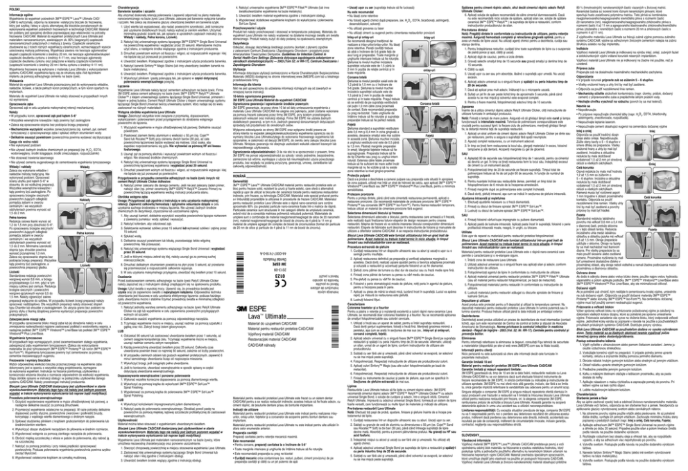 4. Nałożyć uniwersalne wypełnienie 3M™ ESPE™ Filtek™ Ultimate (lub inne światłoutwardzalne wypełnienie na bazie metakrylu). 5. Utwardzić światłem materiał wypełnienia zgodnie z instrukcjami obsługi. 6. Wypolerować dodatkowe wypełnienie krążkami do wykańczania i polerowania Sof-Lex Spiral. Przechowywanie i użycie Produkt ten należy przechowywać i stosować w temperaturze pokojowej. Materiału do wypełnień Lava Ultimate nie należy wystawiać na działanie mocnego światła ani światła słonecznego. Produkt należy zużyć do daty podanej na opakowaniu zewnętrznym. Dezynfekcja Odkażać, stosując dezynfekcję średniego poziomu (kontakt z płynem) zgodnie z zaleceniami Centrum Zwalczania i Zapobiegania Chorobom i przyjętymi przez Amerykańskie Towarzystwo Dentystów. Guidelines for Infection Control in Dental Health-Care Settings (Zalecenia dotyczące zapobiegania zakażeniom w ośrodkach stomatologicznych) — 2003 (Tom 52; nr RR-17), Centrum Zwalczania i Zapobiegania Chorobom Utylizacja Informacje dotyczące utylizacji zamieszczono w Karcie Charakterystyki Bezpieczeństwa Materiału (MSDS) dostępnej na stronie internetowej www.3MESPE.com lub u lokalnego przedstawiciela firmy. Informacja dla klienta Nikt nie jest upoważniony do udzielania informacji różniących się od zawartych w niniejszej karcie instrukcji. 10-letnia ograniczona gwarancja 3M ESPE Lava Ultimate Materiał do wypełnień CAD/CAM Ograniczona gwarancja i ograniczenie środków prawnych: 3M ESPE gwarantuje, że przez okres 10 lat od daty umieszczenia wypełnienia z materiału Lava Ultimate CAD/CAM nie ulegnie ono pęknięciu, jeżeli zostanie wykonane za pomocą frezarki zalecanej przez firmę 3M ESPE, przy ścisłym przestrzeganiu zalecanych wskazań oraz instrukcji obsługi. Firma 3M ESPE nie udziela żadnych dodatkowych gwarancji, w tym m.in. żadnych gwarancji dorozumianych dotyczących sprzedaży lub przydatności do określonych celów. Wyłączne zobowiązanie ze strony 3M ESPE oraz wyłączne środki prawne ze strony klienta na wypadek jakiegokolwiekuszkodzenia wypełnienia ogranicza się do wymiany bloczka Lava Ultimateużytego do wykonania frezowanego wypełnienia lub opcjonalnie, w zależności od decyzji 3M ESPE, do zwrotu ceny zakupu bloczka Lava Ultimate. Niniejsza gwarancja nie obejmuje uszkodzeń wskutek zdarzeń losowych lub nieprawidłowego użytkowania. Ograniczenie odpowiedzialności: O ile nie stoi to w sprzeczności z prawem, firma 3M ESPE nie ponosi odpowiedzialności za szkody i straty pośrednie, bezpośrednie, zamierzone lub wtórne, wynikające z użycia lub nieumiejętności użycia powyższego produktu, bez względu na podaną przyczynę, gwarancję, umowę, zaniedbanie lub całkowitą odpowiedzialność. Română Generalităţi 3M™ ESPE™ Lava™ Ultimate CAD/CAM material pentru restaurări protetice este un bloc pentru frezare solid, rezistent la uzură şi foarte estetic, care oferă o alternativă rapidă şi uşor de utilizat la blocurile din ceramică folosite pentru realizarea restaurărilor indirecte, prin frezare, cu tehnologia CAD/CAM. Materialul este special prelucrat pentru a-i îmbunătăţi proprietăţile la utilizarea în procedurile de frezare CAD/CAM. Materialul pentru restaurări protetice Lava Ultimate este o răşină nano-ceramică care conţine aproximativ 80% (ca greutate) particule nano-ceramice fixate într-o matrice de răşină. Particulele ceramice sunt structurate în trei categorii diferite de umplutură ceramică, având rolul de a consolida matricea polimerică reticulară puternică. Materialele de umplere sunt o combinaţie de material neaglomerat/neagregat de silice de 20 nanometri (nm), material neaglomerat/neagregat de bioxid de zirconiu de 4 până la 11 nm şi material de umplere agregat din complex de bioxid de zirconiu/silice (format din particule de 20 nm de silice şi particule de 4 până la 11 nm de bioxid de zirconiu). Instrukcja użycia Instrucţiuni de utilizare Návod na použitie Navodila za uporabo Návod k použití Informacje ogólne Wypełnienie do wypełnień pośrednich 3M™ ESPE™ Lava™ Ultimate CAD/ CAM to wytrzymały, odporny na ścieranie i estetyczny bloczek do frezowania, który jest szybką i łatwą w użyciu alternatywą dla bloczków porcelanowych do wykonywania wypełnień pośrednich frezowanych w technologii CAD/CAM. Materiał ten poddany jest specjalnej obróbce poprawiającej jego właściwości na potrzeby frezowania CAD/CAM. Materiał do wypełnień protetycznych Lava Ultimate jest materiałem nanoceramicznym, zawierającym ok. 80% (wagowych) cząsteczek nanoceramicznych połączonych z matrycą z żywicy. Cząsteczki ceramiczne zbudowane są z trzech różnych wypełniaczy ceramicznych, wzmacniających wysoce usieciowaną matrycę polimerową. Wypełniacz zawiera nie tworzące aglomeratów/ skupień cząsteczki krzemionki o średnicy 20 nm, nie tworzące aglomeratów/skupień cząsteczki dwutlenku cyrkonu o średnicy 4–11 nm, oraz tworzące aglomeraty cząsteczki dwutlenku cyrkonu oraz połączone w klastry cząsteczki krzemionki (cząsteczki krzemionki o średnicy 20 nm i tlenku cyrkonu o średnicy 4–11 nm). Wypełnienia frezowane są wykonane z materiału Lava Ultimate z wykorzystaniem systemu CAD/CAM; wypełnienia łączy się ze strukturą zęba i/lub łącznikami implantu za pomocą adhezyjnego cementu na bazie żywic. Wskazania Materiał do wypełnień Lava Ultimate przeznaczony jest do wykonywania wkładów, nakładów, licówek, a także pełnych koron protetycznych, w tym koron opartych na implantach. Materiału do wypełnień Lava Ultimate nie należy stosować w przypadkach innych niż wymienione. Opracowanie zęba Opracować ząb w celu uzyskania maksymalnej retencji mechanicznej. Należy • W przypadku koron, opracować ząb pod kątem 5–6° • Wszystkie wewnętrzne krawędzie i kąty powinny być zaokrąglone • Zaleca się opracowanie stopnia bez podcięc