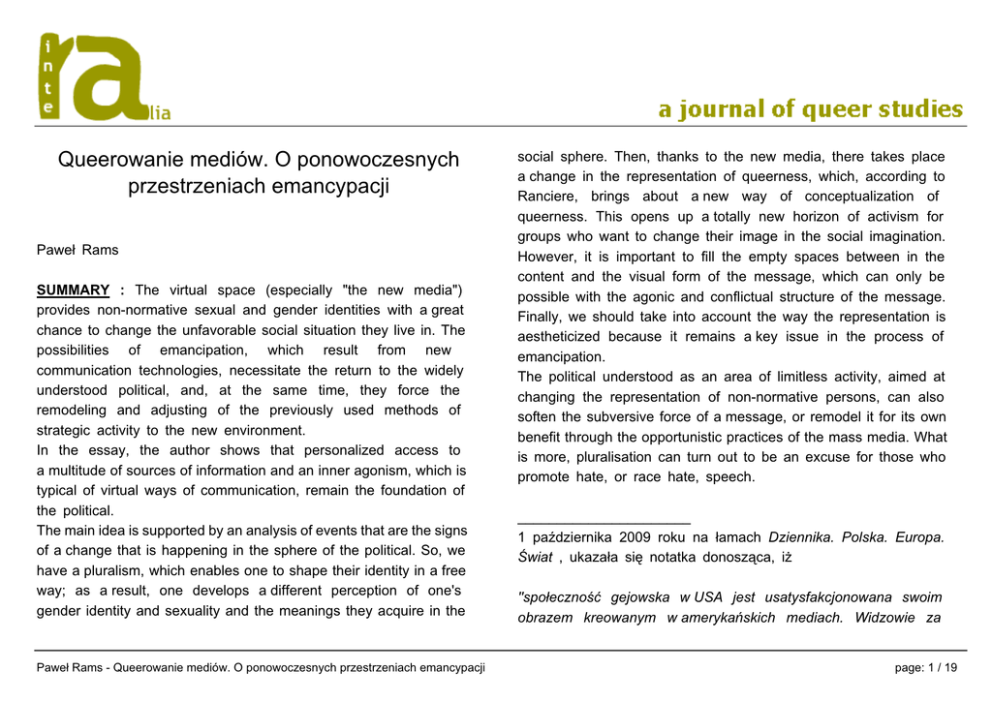 Queerowanie mediów. O ponowoczesnych przestrzeniach emancypacji Paweł Rams SUMMARY : The virtual space (especially "the new media") provides non-normative sexual and gender identities with a great chance to change the unfavorable social situation they live in. The possibilities of emancipation, which result from new communication technologies, necessitate the return to the widely understood political, and, at the same time, they force the remodeling and adjusting of the previously used methods of strategic activity to the new environment. In the essay, the author shows that personalized access to a multitude of sources of information and an inner agonism, which is typical of virtual ways of communication, remain the foundation of the political. The main idea is supported by an analysis of events that are the signs of a change that is happening in the sphere of the political. So, we have a pluralism, which enables one to shape their identity in a free way; as a result, one develops a different perception of one's gender identity and sexuality and the meanings they acquire in the Paweł Rams - Queerowanie mediów. O ponowoczesnych przestrzeniach emancypacji social sphere. Then, thanks to the new media, there takes place a change in the representation of queerness, which, according to Ranciere, brings about a new way of conceptualization of queerness. This opens up a totally new horizon of activism for groups who want to change their image in the social imagination. However, it is important to fill the empty spaces between in the content and the visual form of the message, which can only be possible with the agonic and conflictual structure of the message. Finally, we should take into account the way the representation is aestheticized because it remains a key issue in the process of emancipation. The political understood as an area of limitless activity, aimed at changing the representation of non-normative persons, can also soften the subversive force of a message, or remodel it for its own benefit through the opportunistic practices of the mass media. What is more, pluralisation can turn out to be an excuse for those who promote hate, or race hate, speech. ______________________ 1 października 2009 roku na łamach Dziennika. Polska. Europa. Świat , ukazała się notatka donosząca, iż ''społeczność gejowska w USA jest usatysfakcjonowana swoim obrazem kreowanym w amerykańskich mediach. Widzowie za page: 1 / 19 Oceanem coraz częściej na przykład widzą w filmach i serialach osoby homoseksualne w niestereotypowych rolach [...]. Według raportu opublikowanego przez Gejowsko-lesbijskie Przymierze Przeciw Zniesławianiu (Gay and Lesbian Alliance Against Defamation) w telewizji w rozmaitych rolach pojawiają się 44 postaci orientacji homoseksualnej[1].'' Wiadomość ta zapewne nie wzbudziła w czytelnikach większego zainteresowania ani zdziwienia. Nawet gdyby przyjąć, iż w społeczeństwie odsetek osób o nienormatywnej tożsamości seksualnej waha się między 7 a 10 procent, jak powszechnie się przyjmuje, liczba bohaterów serialowych o takich skłonnościach byłaby nieproporcjonalnie mała w stosunku do rzeczywistego stanu rzeczy. Dużo do życzenia pozostawiałoby także ukazanie wpływu na przebieg wydarzeń dotyczących osób nieheterosekualnych. Informacja powyższa nabiera odmiennego znaczenia w momencie, gdy weźmiemy pod uwagę zmianę jakościową i ilościową, jaka dokonała się na przestrzeni półwiecza w amerykańskich głównonurtowych mediach. Jak podaje Roger Streitmatter, do 1950 roku nie pojawiały się w nich wzmianki o osobach homoseksualnych, a jeżeli nawet takowe występowały, to były one maskowane wymyślnymi eufemizmami. Przełomem okazał się rok 1950, kiedy coraz częściej na łamach Paweł Rams - Queerowanie mediów. O ponowoczesnych przestrzeniach emancypacji największych dzienników oraz lokalnych czasopism pojawiały się informacje o społeczności gejowskiej. Podkreślić należy, iż doniesienia te dotyczyły głównie przestępstw oraz ekscesów z ich udziałem. Media przez pierwszych kilkadziesiąt lat kreowały negatywny wizerunek osób homoseksualnych, przypisując im skłonności do przestępstw, zniewieściałość czy rozchwianie emocjonalne. Wielu redaktorów wręcz ścigało się w informowaniu o nowych wydarzeniach, niejednokrotnie wykazując się przy tym ogromną inwencją językową w określaniu osób o nienormatywnej tożsamości. W tym samym czasie do powszechnego użytku weszły takie zwroty jak "perwert", czy "mężczyzna lubiący innych mężczyzn". Rodger Streimatter w swojej książce From "perverts" to "fab five". The Media's Changing Depiction of Gay Men and Lesbians śledzi zmiany, jakie zachodziły w amerykańskich mediach od lat 50. ubiegłego wieku do początków obecnego stulecia[2]. Wskazuje na ogromną zmianę, jaka miała miejsce nie tylko w sposobie informowania o gejach i lesbijkach, ale także w sposobie kreowania wizerunku osób homoseksualnych w mediach, począwszy od wzmianek prasowych, na reality show kończąc. W tym kontekście zadowolenie gejów i lesbijek ze swojego medialnego wizerunku wydaje się uzasadnione i prawomocne. Zagadnienie, które będzie mnie tutaj interesowało, dotyczy zmian, które doprowadziły do tego, iż na tak niewielkiej przestrzeni czasu, page: 2 / 19 której ramy stanowią lata 1950 - 2009 dokonała się radykalna zmiana w jakościowym i ilościowym sposobie reprezentacji osób homoseksualnych w mediach. Judith Roof definiując pojęcie "media" zauważa, iż telewizja, kino czy internet stanowią ogromną siłę polityczną i społeczną, dzięki której możliwy staje się zindywidualizowany sposób postrzegania i kreowania świata[3]. Podkreśla także, iż masowe środki komunikacji mają większy wpływ na budowanie świadomości oraz tożsamości młodszych pokoleń odbiorców niż kultura wysoka rozpowszechniana tradycyjnymi kanałami. Nowe media definiuje ona w
