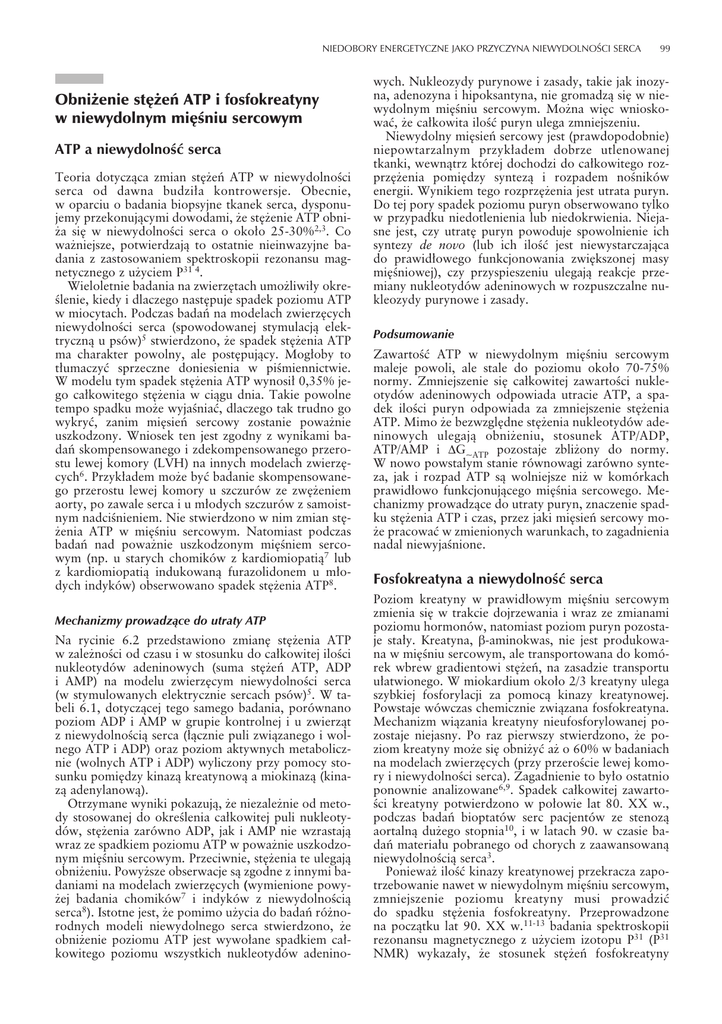 NIEDOBORY ENERGETYCZNE JAKO PRZYCZYNA NIEWYDOLNOŚCI SERCA Obniżenie stężeń ATP i fosfokreatyny w niewydolnym mięśniu sercowym ATP a niewydolność serca Teoria dotycząca zmian stężeń ATP w niewydolności serca od dawna budziła kontrowersje. Obecnie, w oparciu o badania biopsyjne tkanek serca, dysponujemy przekonującymi dowodami, że stężenie ATP obniża się w niewydolności serca o około 25-30%2,3. Co ważniejsze, potwierdzają to ostatnie nieinwazyjne badania z zastosowaniem spektroskopii rezonansu magnetycznego z użyciem P31 4. Wieloletnie badania na zwierzętach umożliwiły określenie, kiedy i dlaczego następuje spadek poziomu ATP w miocytach. Podczas badań na modelach zwierzęcych niewydolności serca (spowodowanej stymulacją elektryczną u psów)5 stwierdzono, że spadek stężenia ATP ma charakter powolny, ale postępujący. Mogłoby to tłumaczyć sprzeczne doniesienia w piśmiennictwie. W modelu tym spadek stężenia ATP wynosił 0,35% jego całkowitego stężenia w ciągu dnia. Takie powolne tempo spadku może wyjaśniać, dlaczego tak trudno go wykryć, zanim mięsień sercowy zostanie poważnie uszkodzony. Wniosek ten jest zgodny z wynikami badań skompensowanego i zdekompensowanego przerostu lewej komory (LVH) na innych modelach zwierzęcych6. Przykładem może być badanie skompensowanego przerostu lewej komory u szczurów ze zwężeniem aorty, po zawale serca i u młodych szczurów z samoistnym nadciśnieniem. Nie stwierdzono w nim zmian stężenia ATP w mięśniu sercowym. Natomiast podczas badań nad poważnie uszkodzonym mięśniem sercowym (np. u starych chomików z kardiomiopatią7 lub z kardiomiopatią indukowaną furazolidonem u młodych indyków) obserwowano spadek stężenia ATP8. Mechanizmy prowadzące do utraty ATP Na rycinie 6.2 przedstawiono zmianę stężenia ATP w zależności od czasu i w stosunku do całkowitej ilości nukleotydów adeninowych (suma stężeń ATP, ADP i AMP) na modelu zwierzęcym niewydolności serca (w stymulowanych elektrycznie sercach psów)5. W tabeli 6.1, dotyczącej tego samego badania, porównano poziom ADP i AMP w grupie kontrolnej i u zwierząt z niewydolnością serca (łącznie puli związanego i wolnego ATP i ADP) oraz poziom aktywnych metabolicznie (wolnych ATP i ADP) wyliczony przy pomocy stosunku pomiędzy kinazą kreatynową a miokinazą (kinazą adenylanową). Otrzymane wyniki pokazują, że niezależnie od metody stosowanej do określenia całkowitej puli nukleotydów, stężenia zarówno ADP, jak i AMP nie wzrastają wraz ze spadkiem poziomu ATP w poważnie uszkodzonym mięśniu sercowym. Przeciwnie, stężenia te ulegają obniżeniu. Powyższe obserwacje są zgodne z innymi badaniami na modelach zwierzęcych (wymienione powyżej badania chomików7 i indyków z niewydolnością serca8). Istotne jest, że pomimo użycia do badań różnorodnych modeli niewydolnego serca stwierdzono, że obniżenie poziomu ATP jest wywołane spadkiem całkowitego poziomu wszystkich nukleotydów adenino- 99 wych. Nukleozydy purynowe i zasady, takie jak inozyna, adenozyna i hipoksantyna, nie gromadzą się w niewydolnym mięśniu sercowym. Można więc wnioskować, że całkowita ilość puryn ulega zmniejszeniu. Niewydolny mięsień sercowy jest (prawdopodobnie) niepowtarzalnym przykładem dobrze utlenowanej tkanki, wewnątrz której dochodzi do całkowitego rozprzężenia pomiędzy syntezą i rozpadem nośników energii. Wynikiem tego rozprzężenia jest utrata puryn. Do tej pory spadek poziomu puryn obserwowano tylko w przypadku niedotlenienia lub niedokrwienia. Niejasne jest, czy utratę puryn powoduje spowolnienie ich syntezy de novo (lub ich ilość jest niewystarczająca do prawidłowego funkcjonowania zwiększonej masy mięśniowej), czy przyspieszeniu ulegają reakcje przemiany nukleotydów adeninowych w rozpuszczalne nukleozydy purynowe i zasady. Podsumowanie Zawartość ATP w niewydolnym mięśniu sercowym maleje powoli, ale stale do poziomu około 70-75% normy. Zmniejszenie się całkowitej zawartości nukleotydów adeninowych odpowiada utracie ATP, a spadek ilości puryn odpowiada za zmniejszenie stężenia ATP. Mimo że bezwzględne stężenia nukleotydów adeninowych ulegają obniżeniu, stosunek ATP/ADP, ATP/AMP i ΔG~ATP pozostaje zbliżony do normy. W nowo powstałym stanie równowagi zarówno synteza, jak i rozpad ATP są wolniejsze niż w komórkach prawidłowo funkcjonującego mięśnia sercowego. Mechanizmy prowadzące do utraty puryn, znaczenie spadku stężenia ATP i czas, przez jaki mięsień sercowy może pracować w zmienionych warunkach, to zagadnienia nadal niewyjaśnione. Fosfokreatyna a niewydolność serca Poziom kreatyny w prawidłowym mięśniu sercowym zmienia się w trakcie dojrzewania i wraz ze zmianami poziomu hormonów, natomiast poziom puryn pozostaje stały. Kreatyna, β-aminokwas, nie jest produkowana w mięśniu sercowym, ale transportowana do komórek wbrew gradientowi stężeń, na zasadzie transportu ułatwionego. W miokardium około 2/3 kreatyny ulega szybkiej fosforylacji za pomocą kinazy kreatynowej. Powstaje wówczas chemicznie związana fosfokreatyna. Mechanizm wiązania kreatyny nieufosforylowanej pozostaje niejasny. Po raz pierwszy stwierdzono, że poziom kreatyny może się obniżyć aż o 60% w badaniach na modelach zwierzęcych (przy przeroście lewej komory i niewydolności serca). Zagadnienie to było ostatnio ponownie analizowane6,9. Spadek całkowitej zawartości kreatyny potwierdzono w połowie lat 80. XX w., podczas badań bioptatów serc pacjentów ze stenozą aortalną dużego stopnia10, i w latach 90. w czasie badań materiału pobranego od chorych z zaawansowaną niewydolnością serca3. Ponieważ ilość kinazy kreatynowej przekracza zapotrzebowanie nawet w niewydolnym mięśniu sercowym, zmniejszenie poziomu kreatyny musi prowadzić do spadku stężenia fosfokreatyny. Przeprowadzone na początku lat 90. XX w.11-13 badania spektroskopii rezonansu magnet
