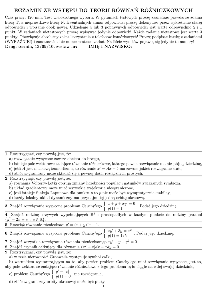 EGZAMIN ZE WSTĘPU DO TEORII RÓWNAŃ RÓŻNICZKOWYCH