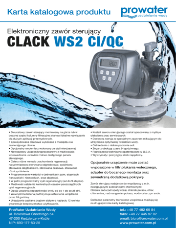 Karta katalogowa produktu Elektroniczny zawór sterujący CLACK WS2 CI/QC • Dwucalowy zawór sterujący montowany na górze lub w bocznej części kolumny filtracyjnej stanowi idealne rozwiązanie dla dużych aplikacji przemysłowych. • Epoksydowana obudowa wykonana z mosiądzu nie zawierającego ołowiu. • Opcjonalny wodomierz wykonany ze stali nierdzewnej. • Nowoczesny układ mikroprocesorowy z możliwością wprowadzania ustawień z łatwo dostępnego panelu sterującego. • Cztery różne metody uruchomienia regeneracji: natychmiastowa sterowana objętościowo, opóźniona sterowana objętościowo, sterowana czasowo, sterowana różnicą ciśnienia. • Programowanie wartości w jednostkach ppm, stopniach francuskich i niemieckich, oraz objętości. • W pełni programowalny cykl regeneracyjny (aż do 9 etapów). • Możliwość ustalenia konkretnych czasów poszczególnych cykli regeneracyjnych. • Opcja ustalenia częstotliwości cyklu od co 1 do co 28 dni. • Wewnętrzna bateria podtrzymuje ustawienia urządzenia przez 24 godziny. • Urządzenie zasilane prądem stałym o napięciu 12 woltów gwarantuje bezpieczeństwo użytkowania. ProWater Uzdatnianie Wody ul. Bolesława Chrobrego 54 47-200 Kędzierzyn–Koźle NIP: 693-177-83-25 • Kształt zaworu sterującego został opracowany z myślą o ułatwieniu prac serwisowych. • Dostępna wersja ze specjalnym zaworem miksującym do utrzymania optymalnej twardości wody. • Ostrzeżenie o niskim poziomie soli. • Zegar z obsługą czasu 24 godzinnego. • Rozwiązania techniczne opatentowane w U.S.A. • Wytrzymały i precyzyjny silnik napędowy. Opcjonalnie urządzenie może zostać wyposażone w filtr płukania wstecznego, adapter do bocznego montażu oraz zewnętrzną dodatkową pokrywę. Zawór sterujący nadaje się do współpracy z m.in. następującymi substancjami chemicznymi: Chlorek sodu (sól spożywcza), chlorek potasu, chlor, chloramina, nadmanganian potasu, wodorosiarczyn sodu. Dokładne parametry techniczne urządzenia znajdują się na drugiej stronie karty katalogowej. tel.: +48 77 482 69 84 faks: +48 77 445 97 02 email: [email protected] www.prowater.com.pl Karta katalogowa produktu Parametry techniczne urządzenia Przyłącza ......................................................................................................................................................... 2˝ żeński BSPT lub NPT Cykle................................................................................................................................................................ do 9 Materiał............................................................................................................................................................ Mosiądz bez dodatku ołowiu Regeneracja .................................................................................................................................................... downflow Wartości przepływu: Podczas pracy przy spadku ciśnienia 1 bar.................................................................................................... 28.4 m³/h Podczas płukania wstecznego przy spadku ciśnienia 1.7 bar........................................................................ 19.3 m³/h Cv podczas pracy ........................................................................................................................................... 32.3 Cv podczas płukania wstecznego................................................................................................................... 17.0 Ciśnienie pracy: Minimalne / maksymalne................................................................................................................................. 1.4 / 8.6 bar Temperatura pracy: Minimalne / maksymalne................................................................................................................................. 4ºC / 43ºC Wodomierz: Dokładność: .................................................................................................................................................... ±5% Zakres wartości przepływu:............................................................................................................................. 5.7 – 568 lpm Zakres objętości: ............................................................................................................................................. 0.02 – 5.700m³ Zakres licznika:................................................................................................................................................ 1 – 99.999m³ Wymiary i waga: Obudowa z 2˝ wejściem / wyjściem BSPT żeńskim:....................................................................................... 63mm OD Obudowa z 2˝ wejściem / wyjściem NPT żeńskim: ......................................................................................... 2,37˝ OD (2˝ NPS) Przyłącze kanalizacyjne (z adapterem):........................................................................................................... 1.5˝ NPT żeński (¾˝ NPT męski) Przyłącze solanki (z adapterem): ..................................................................................................................... wg instrukcji Podstawa montażowa:.................................................................................................................................... 4˝ – 8˝ UN, 6˝ przy mnt. bocznym Wysokość od góry zbiornika: .......................................................................................................................... 287mm Waga: .............................................................................................................................................................. 14kg Specyfikacja elektryki: Napięcie zasilające: ............................................................................