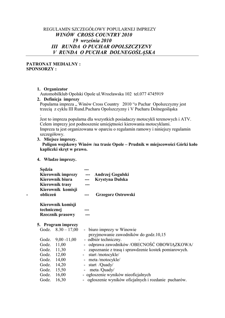 REGULAMIN SZCZEGÓŁOWY POPULARNEJ IMPREZY WINÓW CROSS COUNTRY 2010 19 września 2010 III RUNDA O PUCHAR OPOLSZCZYZNY V RUNDA O PUCHAR DOLNEGOŚLĄSKA PATRONAT MEDIALNY : SPONSORZY : 1. Organizator Automobilklub Opolski Opole ul.Wrocławska 102 tel.077 4745919 2. Definicja imprezy Popularna impreza „ Winów Cross Country 2010 “o Puchar Opolszczyzny jest trzecią z cyklu III Rund.Pucharu Opolszczyzny i V Pucharu Dolnegośląska . Jest to impreza popularna dla wszystkich posiadaczy motocykli terenowych i ATV. Celem imprezy jest podnoszenie umiejętności kierowania motocyklami. Impreza ta jest organizowana w oparciu o regulamin ramowy i niniejszy regulamin szczegółowy. 3. Miejsce imprezy. Poligon wojskowy Winów /na trasie Opole – Prudnik w miejscowości Górki koło kapliczki skręt w prawo. 4. Władze imprezy. - Sędzia Kierownik imprezy Kierownik biura Kierownik trasy Kierownik komisji obliczeń Kierownik komisji technicznej Rzecznik prasowy 5. Program imprezy Godz. 8.30 – 17,00 Godz. Godz. Godz. Godz. Godz. Godz. Godz. Godz. Godz. 9,00 -11,00 11,00 11,30 12,00 14,00 14,20 15,50 16,00 16,30 ----- Andrzej Gogulski --- Krystyna Dulska ----- Grzegorz Ostrowski ----- biuro imprezy w Winowie przyjmowanie zawodników do godz.10,15 - odbiór techniczny. - odprawa zawodników /OBECNOŚĆ OBOWIĄZKOWA/ - zapoznanie z trasą i sprawdzenie kostek pomiarowych. - start /motocykle/ - meta /motocykle/ - start /Quady/ - meta /Quady/ - ogłoszenie wyników nieoficjalnych - ogłoszenie wyników oficjalnych i rozdanie pucharów. 6. Uczestnicy i podział na klasy. Prawo do startu mają zawodnicy z licencją A i B uprawniającą do startów w rajdach enduro lub motocrossie oraz amatorzy bez licencji . Zawodnicy bez licencji zobowiązani są do wykupienia ubezpieczenia NNW . Uczestnicy bez licencji , którzy nie ukończyli 18 lat , muszą złożyć pisemną zgodę rodziców lub opiekunów prawnych na udział w zawodach. Zawodnik musi przedłożyć w biurze zawodów : - dowód tożsamości - certyfikat i właściwą licencję , ważną na rok 2010 (nie dotyczy amatorów). - aktualne badania lekarskie uprawniające do uczestnictwa w zawodach motocyklowych /lekarz obecny od godz.8,30 w biurze zawodów/ - zawodnicy z licencją muszą posiadać ważną książeczkę zdrowia . - wypełnioną kartę zgłoszenia - dowód wpłaty wpisowego Do startu będą dopuszczone motocykle i quady sprawne technicznie , których wyposażenie jest zgodne z wymaganiami RSM dla dyscypliny motocross lub enduro cross country. Motocykle biorące udział w imprezie nie muszą posiadać dowodu rejestracyjnego oraz osprzętu (oświetlenie , sygnalizacja ) wymaganego przepisami o ruchu drogowym. 7. PODZIAŁ NA KLASY Zawody rozgrywane będą w klasach : - klasa Junior - motocykle o poj. do 85 ccm 2T,150 ccm 4T wiek od 13 do 18 lat - klasa E1 – motocykle o poj. 150 ccm – 2T i do 250 ccm – 4T (uczestnicy bez licencji lub z licencją „B”) - klasa E2/E3 – motocykle o poj. powyżej 150 ccm – 2T i powyżej 250 ccm 4T ( uczestnicy bez licencji lub z licencją „B”) - klasa OTWARTA – uczestnicy z licencją „A”, bez podziału na klasy . Warunkiem utworzenia klasy jest udział w niej minimum 3 zawodników. W przypadku mniejszej ilości zawodnicy ci będą dołączeni do klasy wyższej I w niej klasyfikowani ,a punkty w niej zdobyte będą przeniesione do ich klasy Nie dotyczy klasy JUNIOR I LICENCJA .Klasa WETERAN zostaje dołączona Do klasy E 1. - klasa WETERAN- od 40-go roku życia (od rocznika 1969 ) - klasa QUAD A- 2 K - klasa QUAD B – 4K 8. CZAS TRWANIA WYŚCIGU - Bieg I – motocykle ( wspólny dla wszystkich klas ) 2 godziny – klasa E1 - klasa E2/E3 - klasa OTWARTA (licencja) . - klasa WETERAN 1 godzina – klasa JUNIOR Bieg II – Quady 1,5 godziny – klasa QUAD AiB 9. ZGŁOSZENIA Zgłoszenia przyjmowane będą w biurze Automobilklubu Opolskiego Opole ul. Wrocławska 102 lub w dniu imprezy w Biurze Imprezy na terenie poligonu „Winów” od godz. 8 30 do 10,15 .Zgłoszenia listowne i e-mailem aby zostały przyjęte , muszą wpłynąć na minimum na 2 dni przed rozpoczęciem zawodów , 17. 09 2010. Każdy uczestnik ma obowiązek czytelnego wypełnienia zgłoszenia do imprezy i wpłacenia wpisowego w kwocie : - 90 +10 zł każdy uczestnik /10 zł.za używanie transpondera / - 60 + 10 zł uczestnicy , którzy startują w klasie junior. - 70 + 10żł. członkowie Automobilklubu Opolskiego z opłaconą składką za rok 2010 -- UWAGA: na zawodach będzie możliwość zdania licencji motocyklowej ,,C” Warunek trzeba mieć ze sobą zaświadczenie od lekarza medycyny Sportowej o zdolności do uprawiania sportów motorowych. Uczestnik przy zgłoszeniu do zawodów pobiera elektroniczną kostkę pomiarową po wpłaceniu kaucji w kwocie 200 zł . Uczestnik ma obowiązek umocowania elektronicznej kostki pomiarowej w miejscu wskazanym przez organizatora . W przypadku wycofania się z zawodów , nie przysługuje zwrot wpisowego. 10 . Start i meta 15 min. przed wyznaczoną godz. startu zostaje otwarty wjazd do strefy oczekiwania. W tym czasie wszyscy zawodnicy zakwalifikowani do wyścigu muszą zająć miejsce w strefie oczekiwania . Po upływie 10 min. strefa oczekiwania zostaje zamknięta , a zawodnicy którzy do niej nie wjechali nie mogą wystartować w wyścigu . Zawodnicy ze strefy oczekiwania wyjeżdżają za wyznaczonym zawodnikiem prowadzącym na obowiązkowe okrążenie zapoznawcze . Inne treningi na trasie Cross Country są zabronione . Zawodnik , który nie przejedzie okrążenia zapoznawczego nie będzie dopuszczony do wyścigu. Na okrążeniu zapoznawczym obowiązuje zakaz wyprzedzania i wjazdu do strefy napraw w celu tankowania paliwa . Po zakończeniu okrążenia zawodnicy zjeżdżają do strefy oczekiwania i wyłączają silniki , ustawiają się przodem do motocykla . Start nastąpi po upływie czasu podanego w Regulaminie Uzupełniającym Zawodów . Zielona flaga pokazana przez startera oznacza got