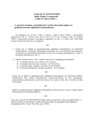 Uchwała Nr 234/XVII/2016 Rady Gminy Lesznowola z dnia 31 marca 2016 r. w sprawie terminu, częstotliwości i trybu uiszczania opłaty za gospodarowanie odpadami komunalnymi . Na podstawie art. 18 ust. 2 pkt 15 ustawy z dnia 8 marca 1990r. o samorządzie gminnym (t.j. Dz. U. z 2015r., poz. 1515 ze zm.) i art. 6 l ust. 1 ustawy z dnia 13 września 1996r. o utrzymaniu czystości i porządku w gminach ( t.j. Dz. U. z 2016r., poz. 250), Rada Gminy Lesznowola uchwala, co następuje: §1 1. Ustala się, iż opłatę za gospodarowanie odpadami komunalnymi od właścicieli nieruchomości, na których zamieszkują mieszkańcy oraz od właścicieli nieruchomości, na których nie zamieszkują mieszkańcy uiszcza się za miesiąc kalendarzowy z dołu, w terminach określonych w ust. 2. 2. Opłata, o której mowa w ust. 1 będzie wnoszona w następujących terminach: a) za miesiąc styczeń, luty i marzec - do 31 marca, b) za miesiąc kwiecień, maj i czerwiec - do 30 czerwca, c) za miesiąc lipiec, sierpień i wrzesień- do 30 września, d) za miesiąc październik, listopad i grudzień – do 31 grudnia. §2 Ustala się, iż opłatę za gospodarowanie odpadami komunalnymi od właścicieli domków letniskowych oraz innych nieruchomości wykorzystywanych na cele rekreacyjnowypoczynkowe jedynie przez część roku uiszcza się z góry za cały rok w terminie do dnia 30 września. §3 Opłata za gospodarowanie odpadami komunalnymi uiszczana jest w kasie Urzędu Gminy lub przelewem na rachunek bankowy. §4 Traci moc uchwała Nr 296/XXIII/2012 Rady Gminy Lesznowola z dnia 14 grudnia 2012r. w sprawie terminu, częstotliwości i trybu uiszczania opłaty za gospodarowanie odpadami komunalnymi (Dz. Urzęd. Woj. Maz. poz. 10252). §5 Wykonanie uchwały powierza się Wójtowi Gminy Lesznowola. §6 Uchwała wchodzi w życie po upływie 14 dni od dnia ogłoszenia w Dzienniku Urzędowym Województwa Mazowieckiego. UZASADNIENIE do uchwały w sprawie terminu, częstotliwości i trybu uiszczania opłaty za gospodarowanie odpadami komunalnymi. Zgodnie z art. 6 l ust. 1 ustawy z dnia 13 września 1996 r. o utrzymaniu czystości i porządku w gminach ( t.j. Dz. U. z 2016r., poz.250), Rada Gminy ma obowiązek określić w drodze uchwały stanowiącej akt prawa miejscowego termin, częstotliwość i tryb uiszczania opłaty za gospodarowanie odpadami komunalnymi. Uchwała przewiduje, iż miesięczne opłaty za gospodarowanie odpadami komunalnymi od właścicieli nieruchomości, na których zamieszkują mieszkańcy oraz od właścicieli nieruchomości, na których nie zamieszkują mieszkańcy, a powstają odpady komunalne będą uiszczane, co kwartał, do ostatniego dnia miesiąca kończącego każdy kwartał. Zmiana częstotliwości wnoszenia opłaty za gospodarowanie odpadami komunalnymi ma celu częściowe zmniejszenie pracochłonności wynikającej z obsługi systemu w związku z właściwym rozliczeniem i zaksięgowaniem wszystkich wpłat przez dział księgowo-finansowy Referatu Gospodarki Odpadami Komunalnymi. Dla właścicieli domków letniskowych i innych nieruchomości wykorzystywanych na cele rekreacyjno-wypoczynkowe wykorzystywane jedynie przez część roku do chwili obecnej nie był określony tryb, częstotliwość i termin wnoszenia opłaty za gospodarowanie odpadami powstającymi na tych nieruchomościach. W niniejszej uchwale Rada Gminy Lesznowola określa termin, tryb oraz częstotliwość uiszczania tej opłaty. Z uwagi na niższą wysokość, opłatę od właścicieli domków letniskowych i innych nieruchomości wykorzystywanych na cele rekreacyjno-wypoczynkowe jedynie przez część roku zaproponowano, aby opłata za gospodarowanie odpadami komunalnymi była uiszczana z góry za cały rok do dnia 30 września. Uchwała w sprawie ustalenia terminu, częstotliwości i trybu uiszczenia opłaty za gospodarowanie odpadami komunalnymi stanowi akt prawa miejscowego i jest podstawą do prowadzenia dalszych działań mających na celu właściwe funkcjonowanie całego systemu gospodarowania odpadami komunalnymi w Gminie Lesznowola.