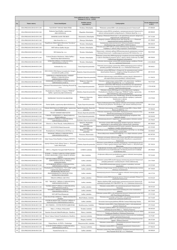 Lista podpisanych umów o dofinansowanie Działanie 8.2 PO IG - II/2012 Lp. Numer umowy Nazwa beneficjenta Siedziba (miasto, województwo) 1. UDA-POIG.08.02.00-02-035/12-00 "LECHTOM" TOMASZ SIKOCIŃSKI UDA-POIG.08.02.00-02-038/12-00 Drukarnia Speed Spółka z ograniczoną odpowiedzialnością 2. Tytuł projektu Kwota dofinansowania w PLN Świdnica, Dolnośląskie "Wdrożenie systemu B2B w celu automatyzacji procesów biznesowych" 273 080,00 Długołeka, Dolnośląskie Wdrożenie systemu B2B do zarządzania i automatyzacji procesów biznesowych w zakresie realizacji projektów poligraficznych w Drukarnia Speed Sp. z o. o. 448 800,00 3. UDA-POIG.08.02.00-02-039/12-00 DOMINIK GAJOS THE BEST Dzierżoniów, Dolnośląskie 4. UDA-POIG.08.02.00-02-043/12-00 Adeo Screen Sp. z o. o. Złotoryja, Dolnośląskie 5. UDA-POIG.08.02.00-02-045/12-00 Niepubliczny Zakład Opieki Zdrowotnej "Zawidawie" Sp.z o.o. Wrocław, Dolnośląskie 6. UDA-POIG.08.02.00-02-048/12-00 SMT Software Spółka Akcyjna Wrocław, Dolnośląskie 7. 8. 9. 10. UDA-POIG.08.02.00-02-055/12-00 Wrocław, Dolnośląskie UDA-POIG.08.02.00-02-057/12-00 Centrum Doradczo Szkoleniowe Malon Spółka z Ograniczoną odpowiedzialnością Wrocław, Dolnośląskie UDA-POIG.08.02.00-02-058/12-00 NITROTEK SPÓŁKA Z OGRANICZONĄ ODPOWIEDZIALNOŚCIĄ Wrocław, Dolnośląskie UDA-POIG.08.02.00-04-035/12-00 11. UDA-POIG.08.02.00-04-039/12-00 12. UDA-POIG.08.02.00-04-040/12-00 13. MX Solution Sp. z o.o. UDA-POIG.08.02.00-04-043/12-00 Archimedes Sp. z o.o. INFI CONSULTING Bartosz Lewandowski, Grzegorz Lewandowski spółka cywilna KORPORACJA PRZEMYSŁOWA "FORMIT" SPÓŁKA Z OGRANICZONĄ ODPOWIEDZIALNOŚCIĄ ENERGOBILANS SPÓŁKA Z OGRANICZONĄ ODPOWIEDZIALNOŚCIĄ Wdrożenie elektronicznego systemu B2B do wymiany danych i dokumentów w celu usprawnienia procesu produkcji i realizacji dostaw. 111 568,58 Bydgoszcz, Kujawskopomorskie 16. UDA-POIG.08.02.00-04-047/12-00 WKPROJEKT WOJCIECH KARKOWSKI Bydgoszcz, Kujawskopomorskie 17. UDA-POIG.08.02.00-04-052/12-00 Narolco Spółka z ograniczoną odpowiedzialnością Rypin, Kujawsko-pomorskie 18. UDA-POIG.08.02.00-04-055/12-00 Fabryka Mebli Biurowych MDD Spółka z ograniczoną odpowiedzialnością Sępólno Krajeńskie, Kujawskopomorskie 19. UDA-POIG.08.02.00-04-061/12-00 "TRAST" EMMERT KRZYSZTOF Świecie, Kujawsko-pomorskie 20. UDA-POIG.08.02.00-04-062/12-00 Toruń, Kujawsko-pomorskie 21. UDA-POIG.08.02.00-04-063/12-00 Cukiernia - LENKIEWICZ s.c. Maciej Lenkiewicz, Michał Lenkiewicz INTERMAX SPÓŁKA Z OGRANICZONĄ ODPOWIEDZIALNOŚCIĄ 22. UDA-POIG.08.02.00-04-065/12-00 Olserwis s.c. Paweł Tkaczyk, Andrzej Butkiewicz 23. UDA-POIG.08.02.00-04-068/12-00 GN SYSTEM Marek Gerszewski 24. UDA-POIG.08.02.00-04-073/12-00 Przedsiębiorstwo Wielobranżowe LECH Sp z o.o. 25. UDA-POIG.08.02.00-04-085/12-00 "HANMAR" SPÓŁKA Z OGRANICZONĄ ODPOWIEDZIALNOŚCIĄ Warszawa, Mazowieckie 26. UDA-POIG.08.02.00-04-087/12-00 Gołaś Tomasz Firma Handlowo Usługowa RENOVA Toruń, Kujawsko-pomorskie 27. UDA-POIG.08.02.00-04-089/12-00 Agencja Ochrony Osób i Mienia Taurus s.c., Krzysztof Łęcki, Maria Łęcka Chełmża, Kujawsko-pomorskie 28. UDA-POIG.08.02.00-06-020/12-00 ARFA s.c. Bogusław Szczygieł, Rafał Wachowicz LUBLIN, Lubelskie UDA-POIG.08.02.00-06-027/12-00 UDA-POIG.08.02.00-06-028/12-00 33. UDA-POIG.08.02.00-06-029/12-00 UDA-POIG.08.02.00-06-030/12-00 WIKANA SPÓŁKA AKCYJNA 35. UDA-POIG.08.02.00-06-031/12-00 M.S. " DRAWEX " SPÓŁKA Z OGRANICZONĄ ODPOWIEDZIALNOŚCIĄ 36. UDA-POIG.08.02.00-06-033/12-00 37. UDA-POIG.08.02.00-06-034/12-00 38. UDA-POIG.08.02.00-06-036/12-00 34. "NETRIX GROUP" SPÓŁKA Z OGRANICZONĄ ODPOWIEDZIALNOŚCIĄ "DALIMEX" SPÓŁKA Z OGRANICZONĄ ODPOWIEDZIALNOŚCIĄ 1 016 600,00 Grudziądz, Kujawsko-pomorskie Brodnica, Kujawsko-pomorskie 32. 490 300,00 205 533,50 Przedsiębiorstwo Handlowo-Usługowe "PERKOZ" Spółka z ograniczoną odpowiedzialnością 31. 984 670,00 Kopanino, Kujawsko-pomorskie UDA-POIG.08.02.00-04-045/12-00 UDA-POIG.08.02.00-06-022/12-00 654 450,00 100 660,01 15. 30. 906 668,50 Wdrożenie systemu B2B Partner w Księgowości do zautomatyzowanej wymiany danych podczas finansowo - księgowej obsługi firm partnerów INFI CONSULTING UDA-POIG.08.02.00-04-044/12-00 UDA-POIG.08.02.00-06-021/12-00 Wdrożenie systemu klasy B2B integrującego zarządzanie procesami obsługi klienta w zakresie identyfikacją przepisów prawa z zakresu ochrony środowiska oraz BHP i nadzorowania aktualności tych przepisów Wdrożenie innowacyjnego systemu B2B automatyzującego współpracę Nitrotek Sp. z o.o. z partnerami biznesowymi. 431 500,00 Toruń, Kujawsko-pomorskie 14. 29. Opracowanie i wdrożenie aplikacji B2B przeznaczonej do automatyzacji wymiany informacji biznesowych z współpracującymi partnerami MX Solution Sp. z o.o. 267 315,00 Wdrożenie innowacyjnego systemu klasy B2B koordynującego proces realizacji sprzedaży pomiędzy Archimedes Sp. z o.o. a Partnerami biznesowymi. Advanced Telecommunications Technology Research Sp. z o.o. "PUMAR - 1" PUDŁO TADEUSZ, PUDŁO MARIA, PUDŁO GRZEGORZ, PUDŁO MARCIN SPÓŁKA JAWNA "ZIP WIECZOREK SPÓŁKA Z OGRANICZONĄ ODPOWIEDZIALNOŚCIĄ" SPÓŁKA KOMANDYTOWA AUTO BROKER SPÓŁKA Z OGRANICZONĄ ODPOWIEDZIALNOŚCIĄ Przedsiębiorstwo Wielobranżowe "VET-AGRO" spółka z ograniczoną odpowiedzialnością PIOTROWSKI ARTUR NATA PRZEDSIĘBIORSTWO PRODUKCYJNO HANDLOWO-USŁUGOWE Integracja z Partnerami Dostawcami w celu optymalizacji procesów zakupowych, magazynowych i rozliczeniowych Integracja systemów informatycznych Adeo Screen Sp. z o. o. z Partnerami zagranicznymi przy pomocy platformy B2B Automatyzacja medycznych procesów biznesowych poprzez wdrożenie teleinformatycznego systemu B2B w NZOZ Zawidawie Wdrożenie przez SMT Software systemu informatycznego służącego automatyzacji współpracy w zakresie usług związanych z monitoringiem Toruń, Kujawsko-pomorskie Grudziądz, Kujawsko-pomorskie Spręcowo, Warmińskomazurskie Bydgoszcz, Kujawskopomor