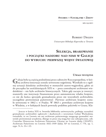 A rchiwa – K ancelarie – Zbiory nr 2 (4) / 2011 Robert Degen Uniwersytet Mikołaja Kopernika w Toruniu Selekcja, brakowanie i początki nadzoru nad nimi w Galicji do wybuchu pierwszej wojny światowej Uwagi wstępne G alicja była tą częścią podzielonej przez zaborców Rzeczypospolitej, w której archiwa-instytucje zostały utworzone najpóźniej. Wynikało to z ogólnej sytuacji dziedziny archiwalnej w monarchii austro-węgierskiej, gdzie aż do początku lat sześćdziesiątych XIX w. – poza centralnymi archiwami wiedeńskimi – nie było archiwów historycznych. Także gdy zaczęto je tworzyć, stanowiły one instytucje finansowane przez autonomiczne władze krajowe, co nie do końca sprzyjało gromadzeniu przez nie wszystkich archiwaliów, szczególnie proweniencji państwowej1. Pierwsze archiwum krajowe zostało utworzone w 1862 r. w Pradze. W 1863 r. powołano archiwum krajowe w Wiedniu, a w kolejnych latach powstały podobne palcówki w Grazu, Kla Jeszcze w końcu XIX w. lwowska biblioteka uniwersytecka, próbując uzasadnić gromadzenie archiwaliów sądowych i skarbowych z terytorium Galicji Wschodniej, twierdziła, że we Lwowie nie ma archiwum państwowego mogącego gromadzić materiały proweniencji urzędowej, dlatego to przez nią mogą być one zabezpieczone, zob. Centralne Historyczne Archiwum Państwowe Ukrainy we Lwowie (dalej: CHAPU), Archiwum Państwowe we Lwowie 1832–1939 (dalej: AP we Lwowie), f. 776, op. 1, sygn. 51, k. 21v i 23. 1 108 Robert Degen genfurcie, Brnie, Opawie i Innsbrucku2. W Galicji już wiosną 1869 r. władze centralne zaproponowały przekazanie Wydziałowi Krajowemu akt grodzkich i ziemskich przechowywanych przy sądach wyższych w Krakowie i Lwowie3. Ostatecznie dopiero w sierpniu 1877 r. Sejm Krajowy zaakceptował wnioski Wydziału o przejęcie obu archiwów. Dzięki temu w Krakowie i Lwowie zostały utworzone Archiwa Krajowe Aktów Grodzkich i Ziemskich. Powodem, dla którego zaproponowano galicyjskiemu Wydziałowi Krajowemu przejęcie ksiąg wytworzonych przez sądy dawnej Rzeczypospolitej, była utrata przez tę dokumentację praktycznego znaczenia dla administracji sądowej Austro-Węgier4. Przechowywanie ksiąg sądowych zbytnio obciążało budżet centralny, a i same sądy borykały się nieustannie z brakiem miejsca na materiały powstające w wyniku własnej działalności. Według szacunków już na początku XIX w. każdy z galicyjskich sądów wytwarzał przeciętnie nawet kilka metrów sześciennych akt rocznie5. W tym artykule zostały zawarte przede wszystkim informacje o mechanizmach selekcji i brakowania akt w galicyjskich sądach w ciągu XIX i na początku XX w.6 W dalszej kolejności scharakteryzowano początki opieki nad archiwaliami, sprawowanej aż do pierwszych lat XX w. przez różne kręgi zainteresowanych. Poza tym znalazły się tu odpowiedzi na dwa pytania: kto od początku XX w. miał odpowiadać za nadzór nad selekcją i brakowaniem akt przez aktotwórców oraz w jaki sposób te działania były prowadzone? Problematyka selekcji i brakowania akt w urzędach galicyjskich była już prezentowana w polskiej literaturze archiwistycznej. Bardzo dużo uwagi poświęcił jej Ludwik Łysiak, pisząc w połowie XX w. dwa artykuły dotyczące registratur, odpowiednio sądu krajowego karnego w Krakowie oraz sądu szlacheckiego w Tarnowie7. O działalności zachodniogalicyjskiego Grona Konserwatorów w 1976 r. pisała Jadwiga Szyposz8, a na początku XXI w. prace 2 S. Ciara, Archiwa a uniwersytety w Krakowie i Lwowie w latach 1877/78–1918, Warszawa 2002, s. 13–14. 3 S. Sochaniewicz, Archiwum krajowe aktów grodzkich i ziemskich we Lwowie, Przewodnik Naukowy i Literacki, R. 40, 1912, s. 1025. 4 Tamże. 5 L. Łysiak, Registratura sądu krajowego karnego w Krakowie i jej brakowanie, Archeion, t. 22, 1954, s. 169–170. 6 W zasadzie tylko one wykazywały w tym zakresie jakąkolwiek aktywność. 7 L. Łysiak, Registratura sądu krajowego karnego w Krakowie i jej brakowanie, s. 156– –195; tenże, Sąd szlachecki w Tarnowie. Studium archiwalne z dziejów kancelarii i registratury sądów w Galicji, Archeion, t. 24, 1955, s. 305–328. 8 J. Szyposz, Działalność Grona Konserwatorów Galicji Zachodniej w zakresie zabezpieczania archiwaliów, Archeion, t. 64, 1976, s. 59–80. Selekcja, brakowanie i początki nadzoru nad nimi w Galicji… 109 jego lwowskiego odpowiednika scharakteryzował Stefan Ciara w ramach obszernej rozprawy poświęconej związkom archiwów z uniwersytetami w Krakowie i we Lwowie9. Ostatnio próbował on także omówić doświadczenia archiwistów galicyjskich na przełomie XIX i XX w. w zakresie postępowania z dokumentacją masową10. Materiałami źródłowymi wykorzystanymi w artykule są przepisy publikowane w dziennikach urzędowych wychodzących w Austro-Węgrzech, dostępne obecnie on-line w internetowym serwisie „ALEX” na stronie austriackiej biblioteki narodowej11. Oprócz nich wykorzystano mające charakter źródłowy informacje umieszczane w wydawnictwach firmowanych przez galicyjskich konserwatorów12 oraz bardzo ważny z punktu widzenia przedmiotu artykułu zbiór listów Oswalda Balzera i Stanisława Kutrzeby, opracowany i opublikowany w „Krakowskim Roczniku Archiwalnym” przez Ewę Perłakowską13. Nie zapomniano także o materiałach archiwalnych z zasobów Archiwum Państwowego w Krakowie oraz Centralnego Historycznego Archiwum Państwowego Ukrainy we Lwowie, szczególnie tych, które zostały wytworzone przez krakowskie i lwowskie archiwa14. S. Ciara, dz. cyt., s. 31–41. Tej tematyce zostało poświęcone wystąpienie S. Ciary w czasie konferencji zorganizowanej 25 i 26 XI 2010 r. w Poznaniu, której przedmiotem była właśnie dokumentacja masowa, problemy jej wartościowania i selekcji. Zob. zamieszczone w tym tomie „Archiwów – Kancelarii – Zbiorów” sprawozdanie z tego sympozjum napisane przez Martę Pawłowską i Katarzynę Pepłowską. 11 Tu przede 