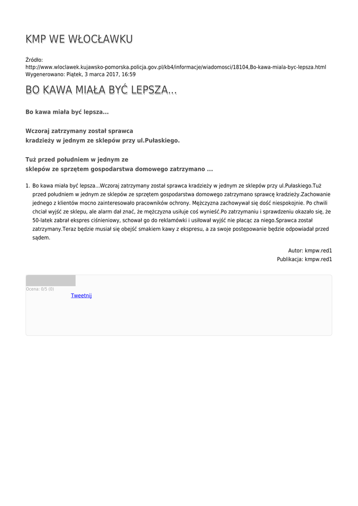 KMP WE WŁOCŁAWKU Źródło: http://www.wloclawek.kujawsko-pomorska.policja.gov.pl/kb4/informacje/wiadomosci/18104,Bo-kawa-miala-byc-lepsza.html Wygenerowano: Piątek, 3 marca 2017, 16:59 BO KAWA MIAŁA BYĆ LEPSZA... Bo kawa miała być lepsza... Wczoraj zatrzymany został sprawca kradzieży w jednym ze sklepów przy ul.Pułaskiego. Tuż przed południem w jednym ze sklepów ze sprzętem gospodarstwa domowego zatrzymano ... 1. Bo kawa miała być lepsza...Wczoraj zatrzymany został sprawca kradzieży w jednym ze sklepów przy ul.Pułaskiego.Tuż przed południem w jednym ze sklepów ze sprzętem gospodarstwa domowego zatrzymano sprawcę kradzieży.Zachowanie jednego z klientów mocno zainteresowało pracowników ochrony. Mężczyzna zachowywał się dość niespokojnie. Po chwili chciał wyjść ze sklepu, ale alarm dał znać, że mężczyzna usiłuje coś wynieść.Po zatrzymaniu i sprawdzeniu okazało się, że 50-latek zabrał ekspres ciśnieniowy, schował go do reklamówki i usiłował wyjść nie płacąc za niego.Sprawca został zatrzymany.Teraz będzie musiał się obejść smakiem kawy z ekspresu, a za swoje postępowanie będzie odpowiadał przed sądem. Autor: kmpw.red1 Publikacja: kmpw.red1 Ocena: 0/5 (0) Tweetnij