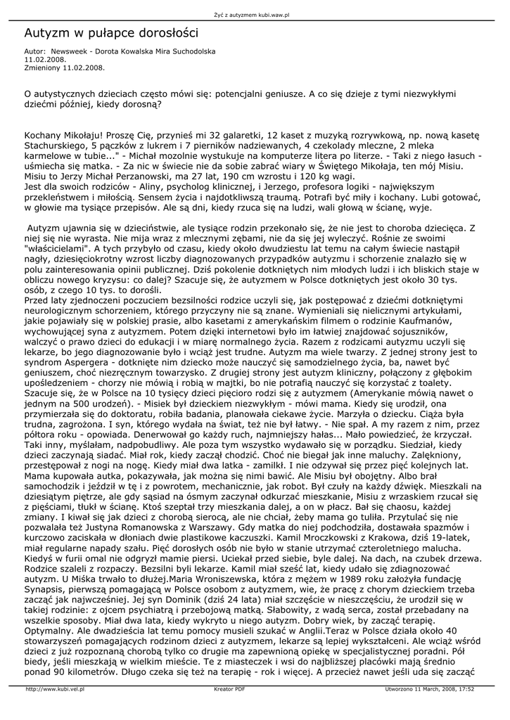 Żyć z autyzmem kubi.waw.pl Autyzm w pułapce dorosłości Autor: Newsweek - Dorota Kowalska Mira Suchodolska 11.02.2008. Zmieniony 11.02.2008. O autystycznych dzieciach często mówi się: potencjalni geniusze. A co się dzieje z tymi niezwykłymi dziećmi później, kiedy dorosną? Kochany Mikołaju! Proszę Cię, przynieś mi 32 galaretki, 12 kaset z muzyką rozrywkową, np. nową kasetę Stachurskiego, 5 pączków z lukrem i 7 pierników nadziewanych, 4 czekolady mleczne, 2 mleka karmelowe w tubie..." - Michał mozolnie wystukuje na komputerze litera po literze. - Taki z niego łasuch uśmiecha się matka. - Za nic w świecie nie da sobie zabrać wiary w Świętego Mikołaja, ten mój Misiu. Misiu to Jerzy Michał Perzanowski, ma 27 lat, 190 cm wzrostu i 120 kg wagi. Jest dla swoich rodziców - Aliny, psycholog klinicznej, i Jerzego, profesora logiki - największym przekleństwem i miłością. Sensem życia i najdotkliwszą traumą. Potrafi być miły i kochany. Lubi gotować, w głowie ma tysiące przepisów. Ale są dni, kiedy rzuca się na ludzi, wali głową w ścianę, wyje. Autyzm ujawnia się w dzieciństwie, ale tysiące rodzin przekonało się, że nie jest to choroba dziecięca. Z niej się nie wyrasta. Nie mija wraz z mlecznymi zębami, nie da się jej wyleczyć. Rośnie ze swoimi "właścicielami". A tych przybyło od czasu, kiedy około dwudziestu lat temu na całym świecie nastąpił nagły, dziesięciokrotny wzrost liczby diagnozowanych przypadków autyzmu i schorzenie znalazło się w polu zainteresowania opinii publicznej. Dziś pokolenie dotkniętych nim młodych ludzi i ich bliskich staje w obliczu nowego kryzysu: co dalej? Szacuje się, że autyzmem w Polsce dotkniętych jest około 30 tys. osób, z czego 10 tys. to dorośli. Przed laty zjednoczeni poczuciem bezsilności rodzice uczyli się, jak postępować z dziećmi dotkniętymi neurologicznym schorzeniem, którego przyczyny nie są znane. Wymieniali się nielicznymi artykułami, jakie pojawiały się w polskiej prasie, albo kasetami z amerykańskim filmem o rodzinie Kaufmanów, wychowującej syna z autyzmem. Potem dzięki internetowi było im łatwiej znajdować sojuszników, walczyć o prawo dzieci do edukacji i w miarę normalnego życia. Razem z rodzicami autyzmu uczyli się lekarze, bo jego diagnozowanie było i wciąż jest trudne. Autyzm ma wiele twarzy. Z jednej strony jest to syndrom Aspergera - dotknięte nim dziecko może nauczyć się samodzielnego życia, ba, nawet być geniuszem, choć niezręcznym towarzysko. Z drugiej strony jest autyzm kliniczny, połączony z głębokim upośledzeniem - chorzy nie mówią i robią w majtki, bo nie potrafią nauczyć się korzystać z toalety. Szacuje się, że w Polsce na 10 tysięcy dzieci pięcioro rodzi się z autyzmem (Amerykanie mówią nawet o jednym na 500 urodzeń). - Misiek był dzieckiem niezwykłym - mówi mama. Kiedy się urodził, ona przymierzała się do doktoratu, robiła badania, planowała ciekawe życie. Marzyła o dziecku. Ciąża była trudna, zagrożona. I syn, którego wydała na świat, też nie był łatwy. - Nie spał. A my razem z nim, przez półtora roku - opowiada. Denerwował go każdy ruch, najmniejszy hałas... Mało powiedzieć, że krzyczał. Taki inny, myślałam, nadpobudliwy. Ale poza tym wszystko wydawało się w porządku. Siedział, kiedy dzieci zaczynają siadać. Miał rok, kiedy zaczął chodzić. Choć nie biegał jak inne maluchy. Zalękniony, przestępował z nogi na nogę. Kiedy miał dwa latka - zamilkł. I nie odzywał się przez pięć kolejnych lat. Mama kupowała autka, pokazywała, jak można się nimi bawić. Ale Misiu był obojętny. Albo brał samochodzik i jeździł w tę i z powrotem, mechanicznie, jak robot. Był czuły na każdy dźwięk. Mieszkali na dziesiątym piętrze, ale gdy sąsiad na ósmym zaczynał odkurzać mieszkanie, Misiu z wrzaskiem rzucał się z pięściami, tłukł w ścianę. Ktoś szeptał trzy mieszkania dalej, a on w płacz. Bał się chaosu, każdej zmiany. I kiwał się jak dzieci z chorobą sierocą, ale nie chciał, żeby mama go tuliła. Przytulać się nie pozwalała też Justyna Romanowska z Warszawy. Gdy matka do niej podchodziła, dostawała spazmów i kurczowo zaciskała w dłoniach dwie plastikowe kaczuszki. Kamil Mroczkowski z Krakowa, dziś 19-latek, miał regularne napady szału. Pięć dorosłych osób nie było w stanie utrzymać czteroletniego malucha. Kiedyś w furii omal nie odgryzł mamie piersi. Uciekał przed siebie, byle dalej. Na dach, na czubek drzewa. Rodzice szaleli z rozpaczy. Bezsilni byli lekarze. Kamil miał sześć lat, kiedy udało się zdiagnozować autyzm. U Miśka trwało to dłużej.Maria Wroniszewska, która z mężem w 1989 roku założyła fundację Synapsis, pierwszą pomagającą w Polsce osobom z autyzmem, wie, że pracę z chorym dzieckiem trzeba zacząć jak najwcześniej. Jej syn Dominik (dziś 24 lata) miał szczęście w nieszczęściu, że urodził się w takiej rodzinie: z ojcem psychiatrą i przebojową matką. Słabowity, z wadą serca, został przebadany na wszelkie sposoby. Miał dwa lata, kiedy wykryto u niego autyzm. Dobry wiek, by zacząć terapię. Optymalny. Ale dwadzieścia lat temu pomocy musieli szukać w Anglii.Teraz w Polsce działa około 40 stowarzyszeń pomagających rodzinom dzieci z autyzmem, lekarze są lepiej wykształceni. Ale wciąż wśród dzieci z już rozpoznaną chorobą tylko co drugie ma zapewnioną opiekę w specjalistycznej poradni. Pół biedy, jeśli mieszkają w wielkim mieście. Te z miasteczek i wsi do najbliższej placówki mają średnio ponad 90 kilometrów. Długo czeka się też na terapię - rok i więcej. A przecież nawet jeśli uda się zacząć http://www.kubi.vel.pl Kreator PDF Utworzono 11 March, 2008, 17:52 Żyć z autyzmem kubi.waw.pl ją wcześnie, nie można być pewnym efektów. Autyzm wciąż pozostaje zagadką. Alina Perzanowska opowiada, że niedługo po urodzeniu syna p