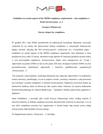 Guidelines on certain aspects of the MiFID compliance requirements - rola compliance w firmie inwestycyjnej - cz. I Grzegorz Włodarczyk Starszy ekspert ds. compliance W grudniu 2011 roku ESMA przedstawiła do publicznych konsultacji dokument, niezwykle wydawało by się istotny dla sprawowania funkcji compliance w instytucjach finansowych, będący nieomal „Bazyleą dla firm inwestycyjnych”, mianowicie tzw. Consultation paper – Guidelines on certain aspects of the MiFID compliance requirments. Sam dokument w fazie projektowej liczy sobie 32 strony, natomiast uwagi zgłosiło 45 instytucji (polskich niestety brak!) w tym poszczególni regulatorzy, stowarzyszenia, banki, asset managerowie etc. Uwagi i odpowiedzi na pytanie ESMA to tak na oko jakieś 250 stron. Kolejnym krokiem ESMA ma być przeanalizowanie nadesłanych odpowiedzi i docelowo opublikowanie uzgodnionych „Wytycznych(…)”. Tyle statystyk i wprowadzenia. Analizując dokument oraz załączone odpowiedzi w/w podmiotów można zauważyć, parafrazując, że jest to jedynie swoista „ewolucja, natomiast z całą pewnością nie rewolucja” systemu compliance w firmach inwestycyjnych. Najłatwiej oczywiście będzie się dostosować bankom, które od dawna już taki system miały wdrożony (za sprawą dokumentu Komitetu Bazylejskiego ds. nadzoru Bankowego – ‘Zgodność i funkcja zapewnienia zgodności w bankach’). Same Guidelines(…) powstały jako wynik kryzysu finansowego, który według autorów (i słusznie!) pokazał, że funkcja compliance powinna zdecydowanie zyskiwać na znaczeniu, a co za tym idzie compliance powinno być angażowane w niemal każdy etap kreacji nowej usługi inwestycyjnej, bądź produktu inwestycyjnego. W telegraficznym skrócie „Wytyczne(…)” określają: 1 1. Właściwe zarządzanie ryzykiem braku zgodności w firmie inwestycyjnej – poprzez opracowanie i wdrożenie wymaganych przez MiFID polityk i procedur, przegląd ryzyk, testy zgodności etc. Jako rozszerzenie należy dodać, iż oczywiście moim zdaniem, zasługą MiFID’u jest to, że wymogła na compliance ewolucję do tzw. modelu „dojrzałego” bądź nawet „bardzo dojrzałego”. Model „dojrzały” to efektywne zarządzanie ryzykiem braku zgodności, to tworzenie biznesowych – I-ych linii zarządzania ryzykiem, to wreszcie stała weryfikacja testów zgodności, natomiast model „bardzo dojrzały” to znowuż wszystko to co i w modelu „dojrzałym” plus stanie się dla compliance realnym wsparciem dla biznesu, włączenie zarządzania ryzykiem braku zgodności do praktyk biznesowych, opracowanie i wdrożenie pełnej metodologii zarządzania ryzykiem braku zgodności etc. To wszystko, moim zdaniem, zawdzięczamy MiFID’owi – nie dała nam tego pralnia, nie dała do końca doktryna klasycznego compliance, dały rynki kapitałowe. 2. Wdrożenie programu monitorowania ryzyk – na każdym etapie „tworzenia” danego produktu czy usługi podlegających pod MiFID, wdrożenie narzędzi i właściwych metodologii. Co ciekawe dokumenty wskazują, na wydawałoby się rzecz oczywistą na poziomie „dojrzałym” czy „bardzo dojrzały”, ale jak pokazuje praktyka nie zawsze oczywistych i nie dla każdego, że kontrole powinny być przeprowadzane nie jedynie „zza biurka”, ale także by dokumenty, oświadczenia etc. jednostek biznesowych były weryfikowane poprzez kontrolę praktyczną. Jest to o tyle istotne, że z rynku dochodzą czasem wieści, że dana jednostka compliance raportowała (Zarząd, rada nadzorcza) de facto nieprawdę. Dane, które otrzymała z biznesu były tak skonstruowane by spowodować brak reakcji i rekomendacji compliance, a compliance nie zweryfikowało ich „na drugą rękę”. Oczywiście nie trzeba mówić czym takie sytuacje mogą się dla kierujących danym compliance zakończyć (nie wspominając o generowaniu ryzyka). 3. Jak przystało na dokument określający zasady „bardzo dojrzałego” compliance także „Wytyczne(…)” wskazują, iż właściwe zarządzanie ryzykiem braku zgodności to zarządzanie wielopoziomowe (od biznesu, przez compliance na audycie wewnętrznym i ryzku operacyjnym skończywszy). 2 4. Co także powinno być oczywiste – compliance powinno mieć dostęp, a więc de facto sprawować nadzór nazwijmy to funkcjonalny nad rozpatrywanie reklamacji, w kontekście MiFID’u. 5. Kolejna kwestia – raportowanie do „senior management”, czyli w praktyce do Zarządu oraz docelowo do Komitetu ds. Audytu/Compliance (Rady Nadzorczej). Nic nowego, ale oczywiście cieszy, że zwrócono na to uwagę, gdyż jest to wręcz obligatoryjny element właściwej struktury zarządzania ryzykiem braku zgodności via Rys. 1). Bardzo ciekawym założeniem jest, aby taki raport, powiedzmy roczny z zarządzania ryzykiem braku zgodności, pokrywał merytorycznie wszystkie aspekty i jednostki wewnętrzne związane ze świadczeniem usług inwestycyjnych (a zatem np. odrębnie treasury, custody, sieć, detal, marketing, zachęty etc. etc.), a w przypadkach pominięcia danej jednostki – przedstawiać powody owego pominięcia (myślę, ze dobrym powodem mogłoby być np. brak luk w procesie, potwierdzone testem zgodności). Bardzo pozytywnym aspektem dokumentów jest to, że wprowadzają (póki co) założenia raportowania ad hoc do np. Zarządu, w przypadkach np. istotnych naruszeń związanych z MiFID i co ważne 3 raportowanie nie powinno się odbywać na zasadzie „stwierdzono następujące nieprawidłowości”, ale także zawierać „proponowane rozwiązania”, co może ukróci praktyki „starej szkoły kontroli”, mówiące, iż „jeśli kontrola nie wykazała żadnych nieprawidłowości, to znaczy, ze została przeprowadzona błędnie”. „Wytyczne(…)” wskazują także, ze compliance powinno być uczestnikiem korespondencji z właściwymi organami nadzoru. 6. Obowiązki jednostki compliance, oprócz wskazanych powyżej, to zgodnie z „Wytycznymi(…)