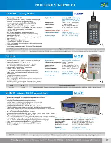 PROFESJONALNE MIERNIKI RLC CHY41R • • • • • • • • • • • • • optyczny RS-232 Z³¹cze optyczne RS-232 Automatyczna/rêczna zmiana zakresów pomiarowych Detekcja i sygnalizacja stanu bezpiecznika Mierzone parametry: Ls (Q,D,Rs), Lp (Q,D,Rp), Cs (Q,D,Cs), Cp (Q,D,Rp) HOLD: zatrzymanie wyniku pomiaru na LCD MAX/MIN: rejestracja wartoœci MAX, MIN, AVG (œrednia) FREQ: wybór czêstotliwoœci pomiarowej 1kHz lub 120Hz REL: pomiar wzglêdny, wzglêdem wartoœci wprowadzonej na wyœwietlaczu LCD lub aktualnej wartoœci pomiarowej PAL/SER: wybór uk³adu zastêpczego szeregowego lub równoleg³ego TOL: wybór tolerancji pomiarów OPEN/SHORT: korekcja obci¹¿enia Hi/Lo: sygnalizacja dŸwiêkowa i optyczna przekroczenia zadanych limitów Automatyczne wy³¹czanie po 10 minutach bezczynnoœci Wyœwietlacz: podwójny LCD podœwietlany: 19999 (wskazanie: R,L,C) + 9999 (wskazanie: Q,D,Rs/Rp) 0,001W÷10MW ±(0,5%+3c) 0,1µH÷20000H ±(0,7%+Lx/10000+5c10c) 0,1pF÷20mF ±(0,7%+3c) Rezystancja: Indukcyjnoœæ: Pojemnoœæ: Zabezpieczenie wejœæ: Zasilanie (podwójne): Wymiary/waga: 0,1A/250V bateria 9V (6F22) zasilacz DC: 12÷15V, 50mA 192 x 91 x 53 mm / 365 g Model Nr kat. Wyposa¿enie standardowe CHY41R 101031 elastyczna os³ona, interfejs RS-232 + oprogramowanie, przewody pomiarowe z krokodylkami (para), bateria, instrukcja obs³ugi w j. polskim BR2822 • • • • • • • • • • • Automatyczna/rêczna zmiana zakresów pomiarowych Mierzone parametry: L, C, R, Z, D, Q Dwa jednoczesne pomiary: L-Q, C-D, R-Q, Z-Q HOLD: zatrzymanie wyniku pomiaru na LCD FREQ: wybór czêstotliwoœci pomiarowej 100Hz, 120Hz, 1kHz, 10kHz D/D%: pomiar wzglêdny lub wzglêdny procentowy EQU: wybór uk³adu zastêpczego szeregowego lub równoleg³ego TOL: wybór tolerancji pomiarów CLEAR: korekcja obci¹¿enia Hi/Lo: sygnalizacja dŸwiêkowa i optyczna przekroczenia zadanych limitów Automatyczne wy³¹czanie po 5 minutach bezczynnoœci • • • • • • • • Zasilanie (podwójne): Wymiary/waga: bateria 9V (6F22) zasilacz DC: 12V, 100mA 200 x 95 x 40 mm / 400 g Model Nr kat. Wyposa¿enie standardowe BR2822 104682 zasilacz/³adowarka 12V DC, przewody pomiarowe z krokodylkami (para), akumulatorek 9V, instrukcja obs³ugi w jêzyku polskim BR2817 • • • • • • • Wyœwietlacz: podwójny LCD 2x99999 max Rezystancja/impedancja: 0,0001W÷999,9MW ±(0,3%+1c) Indukcyjnoœæ: 0,1µH÷9999H ±(0,3%+1c) Pojemnoœæ: 0,1pF÷9999µF ±(0,3%+1c) Dobroæ/stratnoœæ: 0,0001÷9999 ±(0,3%+1c) optyczny RS-232, z³¹cze drukarki Mostek stacjonarny, ekstremalne rozdzielczoœci i zakresy Z³¹cze optyczne RS-232 i z³¹cze drukarki Automatyczna zmiana zakresów pomiarowych RangeHOLD: blokada aktualnego zakresu pomiarowego Mierzone parametry: L, C, R, Z, D, Q Dwa jednoczesne pomiary: L-Q,C-D,R-Q,Z-Q,Z-D, R-D Wybór rodzaju wskazania wyniku pomiaru: dla wybranej czêstotliwoœci pomiarowej, dla 4 ró¿nych wartoœci czêstotliwoœci pomiarowej lub wskazanie wyniku pomiaru napiêcia i pr¹du HOLD: zatrzymanie wyniku pomiaru na LCD Wybór czêstotliwoœci pomiarowej 50Hz, 100Hz, 120Hz, 1kHz, 10kHz, 100kHz Wybór napiêcia pomiarowego 0,1V, 0,3V, 1V SORT: funkcja komparatora w 4 wybranych przedzia³ach wartoœci i 3 trybach: Wyœwietlacz: podwójny LCD podœwietlany 2x99999 max bezwzglêdnym, wzglêdnym i wzglêdnym procentowym Rezystancja/impedancja: 0,0001W÷399,99MW ±(0,05%+1c) EQUAL: wybór uk³adu zastêpczego szeregowego lub równoleg³ego Indukcyjnoœæ: 0,0001µH÷39999H ±(0,05%+1c) TRIG: wyzwalanie pomiaru wewnêtrzne lub zewnêtrzne Pojemnoœæ: 0,0001pF÷399,99mF ±(0,05%+1c) SPEED: wybór czêstoœci próbkowania 2 / 5 / 10 razy/s Dobroæ/stratnoœæ: 0,0001÷3999,9 ±(0,0003%+1c) Korekcja obci¹¿enia Zasilanie: Wymiary/waga: 220÷240V AC / 50Hz 380 x 150 x 320 mm / 3,5 kg Model Nr kat. Wyposa¿enie standardowe BR2817 104684 przewody pomiarowe z wtykami BNC zakoñczone krokodylkami (para), przewód zasilaj¹cy, instrukcja obs³ugi w jêzyku polskim BIALL Sp. z o.o. Otomin, ul. S³oneczna 43, 80-174 Gdañsk, tel. 0 58 322 11 91, 92, 93, [email protected], www.biall.com.pl 25