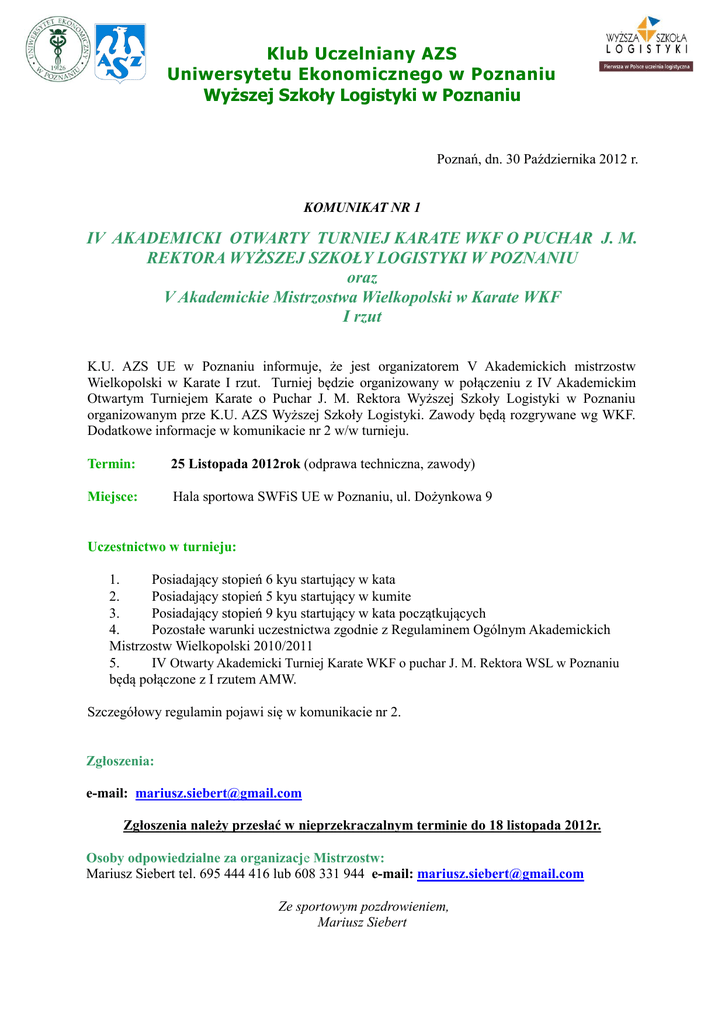 Klub Uczelniany AZS Uniwersytetu Ekonomicznego w Poznaniu Wyższej Szkoły Logistyki w Poznaniu Poznań, dn. 30 Października 2012 r. KOMUNIKAT NR 1 IV AKADEMICKI OTWARTY TURNIEJ KARATE WKF O PUCHAR J. M. REKTORA WYŻSZEJ SZKOŁY LOGISTYKI W POZNANIU oraz V Akademickie Mistrzostwa Wielkopolski w Karate WKF I rzut K.U. AZS UE w Poznaniu informuje, że jest organizatorem V Akademickich mistrzostw Wielkopolski w Karate I rzut. Turniej będzie organizowany w połączeniu z IV Akademickim Otwartym Turniejem Karate o Puchar J. M. Rektora Wyższej Szkoły Logistyki w Poznaniu organizowanym prze K.U. AZS Wyższej Szkoły Logistyki. Zawody będą rozgrywane wg WKF. Dodatkowe informacje w komunikacie nr 2 w/w turnieju. Termin: 25 Listopada 2012rok (odprawa techniczna, zawody) Miejsce: Hala sportowa SWFiS UE w Poznaniu, ul. Dożynkowa 9 Uczestnictwo w turnieju: 1. Posiadający stopień 6 kyu startujący w kata 2. Posiadający stopień 5 kyu startujący w kumite 3. Posiadający stopień 9 kyu startujący w kata początkujących 4. Pozostałe warunki uczestnictwa zgodnie z Regulaminem Ogólnym Akademickich Mistrzostw Wielkopolski 2010/2011 5. IV Otwarty Akademicki Turniej Karate WKF o puchar J. M. Rektora WSL w Poznaniu będą połączone z I rzutem AMW. Szczegółowy regulamin pojawi się w komunikacie nr 2. Zgłoszenia: e-mail: [email protected] Zgłoszenia należy przesłać w nieprzekraczalnym terminie do 18 listopada 2012r. Osoby odpowiedzialne za organizacje Mistrzostw: Mariusz Siebert tel. 695 444 416 lub 608 331 944 e-mail: [email protected] Ze sportowym pozdrowieniem, Mariusz Siebert Klub Uczelniany AZS Uniwersytetu Ekonomicznego w Poznaniu Wyższej Szkoły Logistyki w Poznaniu KOMUNIKAT NR 2 IV AKADEMICKI OTWARTY TURNIEJ KARATE WKF O PUCHAR J. M. REKTORA WYŻSZEJ SZKOŁY LOGISTYKI W POZNANIU oraz V Akademickie Mistrzostwa Wielkopolski w Karate WKF I rzut Klub Uczelniany AZS UE w Poznaniu informuje, że jest organizatorem V Akademickich mistrzostw Wielkopolski w Karate I rzut. Turniej będzie organizowany w połączeniu z IV Akademickim Otwartym Turniejem Karate o Puchar J. M. Rektora Wyższej Szkoły Logistyki w Poznaniu organizowanym prze K.U. AZS Wyższej Szkoły Logistyki . Zawody będą rozgrywane wg WKF. Wyciąg z regulaminu zawodów: Termin: Program: Miejsce: 25 listopada 2012 rok. 9:30 Weryfikacja zawodników 8:00 – 9:45 – 10:15 Odprawa sędziów 10:15 – 10:30 Odprawa kierowników ekip 10:45 Eliminacje (kumite indywidualne i drużynowe) 12:00 Uroczyste otwarcie Mistrzostw (prezentacja klubów) 13:30 Kontynuacja zawodów, finały 18:00 Planowane zakończenie zawodów Hala sportowa SWFiS AE w Poznaniu, ul. Dożynkowa 9 Cel: wyłonienie najlepszych zawodników w poszczególnych konkurencjach oraz najlepszego klubu uczelnianego. popularyzacja karate WKF wśród młodzieży akademickiej Uczestnictwo w turnieju: posiadający stopień 6 kyu startujący w kata (konieczne ksero certyfikatu stopnia do weryfikacji) posiadający stopień 5 kyu startujący w kumite (konieczne ksero certyfikatu stopnia do weryfikacji) wymagana zgoda lekarza startujący w konkurencji początkującej (tylko taikyoku shodan) ubezpieczenie NNW ważna legitymacja AZS dokument, potwierdzający afiliację do określonej szkoły wyższej (indeks, legitymacja studencka, legitymacja pracownicza) Wszyscy zawodnicy zobowiązani są do posiadania ochraniaczy na stopy i golenie, Klub Uczelniany AZS Uniwersytetu Ekonomicznego w Poznaniu Wyższej Szkoły Logistyki w Poznaniu napięstników i pasów w kolorach czerwonym i niebieskim oraz ochraniaczy na zęby. Organizator nie zabezpiecza w/w sprzętu. Przypominamy, że według regulaminu WKF kolor karategi może być wyłącznie biały. Sposób przeprowadzenia zawodów: Zawody zostaną rozegrane według przepisów WKF oraz w połączeniu z V Akademickimi Mistrzostwami Wielkopolski (Regulaminem Ogólnym Akademickich Wielkopolski). dwa trzecie miejsca kata – system chorągiewkowy z repasażami kumite – czas walki 3 min. dla mężczyzn, 2 min. dla kobiet Konkurencje: kumite indywidualne mężczyzn : -60, -67, -75, -84, +84 kg kumite indywidualne kobiet: -50, -55, -61,-68, +68 kg kumite drużynowe mężczyzn kumite drużynowe kobiet kata indywidualne mężczyzn kata indywidualne kobiet kata drużynowe mężczyzn kata drużynowe kobiet Konkurencje początkujących (tylko taikyoku shodan- białe pasy): kata indywidualne Mężczyzn kata indywidualne Kobiet kata drużynowe Mężczyzn kata drużynowe Kobiet Informacje dodatkowe: Organizator zastrzega sobie prawo do odwołania konkurencji w przypadku nie wystarczającej liczby zawodników. Za zachowanie zawodnika lub wyrządzone szkody odpowiada opiekun grupy. Organizator nie odpowiada za rzeczy zaginione lub pozostawione w szatni. Ubezpieczenie oraz zgoda lekarza spoczywa na klubie macierzystym. Punktacja: 1. Punkty w klasyfikacji indywidualnej i uczelnianej będą przydzielane wg zasady: I m. n + 1 pkt. II m. n – 1 pkt. III m. n – 2 pkt. itd. ( gdzie “ n “ oznacza ilość sklasyfikowanych zawodników). Każda uczelnia może wystawić dowolną ilość studentów i drużyn. 2. Punkty w AMW będą przeliczane wg odrębnego regulaminu dot. Akademickich Mistrzostw Wielkopolski. Nagrody: Puchary (najlepszy zawodnik, zawodniczka, uczelnia) Statuetki: (za 1 miejsce w poszczególnych konkurencjach) Medale: (miejsce 1- 3) Dyplomy i nagrody rzeczowe: dla najlepszych zawodników, zawodniczek, uczelni: książki, pendrive'y, MP3, MP4, itd. Zgłoszenia: e-mail: [email protected] Zgłoszenia należy przesłać w nieprzekraczalnym terminie do 18 listopada 2012r. Klub Uczelniany AZS Uniwersytetu Ekonomicznego w Poznaniu Wyższej Szkoły Logistyki w Poznaniu Istnieje możliwość noclegów. Udział w zawodach jest bezpłatny! Osoby odpowiedzialne za organizacje Mistrzostw: Mariusz Siebert tel. 695 444 416 lub 608 331 944 FAX: 61-647-58-74 e-mail: [email protected] Ze sportowym pozdrowieniem, Mariusz Siebert