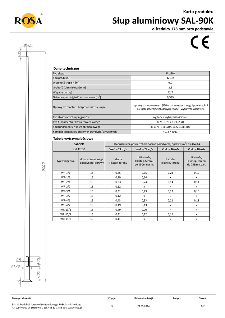 Karta produktu Słup aluminiowy SAL-90K o średnicy 178 mm przy podstawie Dane techniczne Typ słupa SAL-90K Kod produktu 42632 Wysokośd słupa H *m+ 9,0 Grubośd ścianki słupa *mm+ 3,5 Waga netto [kg] 42,7 3 Orientacyjna objętośd jednostkowa *m ] 0,589 oprawy z mocowaniem Ø60 o parametrach wagi i powierzchni nie przekraczających danych z tabeli wytrzymałościowej Oprawy do montażu bezpośrednio na słupie Typ stosowanych wysięgników wg tabeli wytrzymałościowej Typ fundamentu / kosza zbrojeniowego B-71, B-70 / Z-71, Z-70 Kod fundamentu / kosza zbrojeniowego 311171, 311170/311271, 311207 Komplet elementów złącznych zwykłych / zrywalnych 4012 / 4013 Tabele wytrzymałościowe Dopuszczalna powierzchnia boczna pojedynczej oprawy [m2] dla Cx=0,7 SAL-90K kod 42632 Vref. = 22 m/s Vref. = 24 m/s Vref. = 26 m/s Vref. = 28 m/s typ wysięgnika dopuszczalna waga pojedynczej oprawy I strefa, II kateg. terenu I i III strefa, II kateg. terenu do 450m n.p.m. II strefa, II kateg. terenu III strefa, II kateg. terenu do 755m n.p.m. WR-1/1 15 0,45 0,35 0,23 0,19 WR-1/2 15 0,19 0,14 x x WR-2/1 15 0,33 0,24 0,14 0,11 WR-2/2 15 0,12 x x x WR-3/1 15 0,31 0,23 0,12 0,10 WR-3/2 15 0,12 x x x WR-4/1 15 0,43 0,33 0,21 0,18 WR-4/2 15 0,19 0,13 x x WR-13/1 15 0,29 0,20 x x WR-15/1 15 0,31 0,22 0,11 x WR-15/2 15 0,11 x x x Dane producenta Zakład Produkcji Sprzętu Oświetleniowego ROSA Stanisław Rosa 43-109 Tychy, ul. Strefowa 1, tel. +48 32 73 88 901, www.rosa.pl Edycja Data aktualizacji 3 24.09.2014 Podpis Strona 1/2 Karta produktu Słup aluminiowy SAL-90K o średnicy 178 mm przy podstawie Tabele wytrzymałościowe Dopuszczalna powierzchnia boczna pojedynczej oprawy [m2] dla Cx=0,7 SAL-90K kod 42632 Vref. = 22 m/s Vref. = 24 m/s Vref. = 26 m/s Vref. = 28 m/s typ wysięgnika dopuszczalna waga pojedynczej oprawy I strefa, II kateg. terenu I i III strefa, II kateg. terenu do 450m n.p.m. II strefa, II kateg. terenu III strefa, II kateg. terenu do 755m n.p.m. WR-61 WRP1/1,0/0,7/5 15 15 0,13 0,30 x 0,21 x 0,11 x x WRP1/1,5/0,7/5 15 0,22 0,15 x x WRP2/1,0/0,7/5 15 0,11 x x x WN-1 15 0,39 (Cx=1) 0,31 (Cx=1) 0,21 (Cx=1) 0,19 (Cx=1) WN-2 WN-21 15 15 0,17 (Cx=1) 0,15 (Cx=1) 0,13 (Cx=1) 0,11 (Cx=1) x x x x WN-3 10 0,12 (Cx=1) x x x Dopuszczalna powierzchnia boczna opraw i wysięgników *m2] dla Cx=1 SAL-90K kod 42632 Vref. = 22 m/s Vref. = 24 m/s Vref. = 26 m/s Vref. = 28 m/s Dopuszczalna masa opraw i wysięgników [kg] I strefa, II kateg. terenu I i III strefa, II kateg. terenu do 450m n.p.m. II strefa, II kateg. terenu III strefa, II kateg. terenu do 755m n.p.m. 30 0,41 0,33 0,23 0,20 powierzchnia: aluminium szlifowane anodowanie w 10 kolorach, każdy z możliwością wybłyszczania opcja malowania proszkowego wg RAL (inne farby na życzenie klienta) opcja zabezpieczenia elastomerem w kolorze słupa do wysokości 350 mm (inna wysokośd na życzenie klienta) wnęka standard ROSA pakowanie: włóknina polipropylenowa certyfikat bezpieczeostwa biernego 100NE2 Dane producenta Zakład Produkcji Sprzętu Oświetleniowego ROSA Stanisław Rosa 43-109 Tychy, ul. Strefowa 1, tel. +48 32 73 88 901, www.rosa.pl Edycja Data aktualizacji 3 24.09.2014 Podpis Strona 2/2