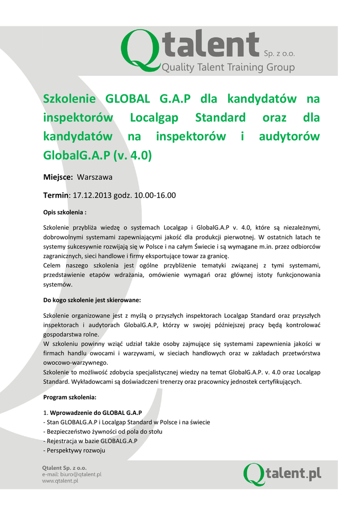 Szkolenie GLOBAL GAP dla kandydatów na inspektorów