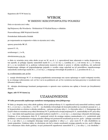 Sygnatura akt VI W 6220/15 WYROK W IMIENIU RZECZYPOSPOLITEJ POLSKIEJ Dnia 10 stycznia 2017 roku. Sąd Rejonowy dla Wrocławia - Śródmieścia VI Wydział Karny w składzie: Przewodniczący SSR Wojciech Sawicki Protokolant Aleksandra Działak po rozpoznaniu na rozprawie w dniu 10 stycznia 2017 roku, sprawy przeciwko W. F. synowi F. i S., urodzonego (...) w B., obwinionemu o to, że: w dniu 01 września 2015 roku około 10:40 we W. na ul. (...), spowodował inne zdarzenie w ruchu drogowym w ten sposób, że pchając zepsuty samochód marki D. (...) o nr rej. (...) jezdnią ul. (...) od strony ul. (...) w stronę ul. (...), na wysokości nr 5, podczas wykonywania manewru skrętu w prawo w uliczkę osiedlową, nie zachował bezpiecznego odstępu od poprzedzającego pojazdu w wyniku czego najechał na tył prawidłowo zaparkowanego samochodu osobowego marki M. (...) o nr rej. (...) stojącego równolegle do jezdni ul. (...), przodem do ul. (...), tj. o wykroczenie z art. 97 kw I. uznaje obwinionego W. F. za winnego popełnienia zarzucanego mu czynu opisanego w części wstępnej wyroku, tj. za winnego wykroczenia z art. 97 kw i za to na podstawie art. 97 kw wymierza mu karę grzywny w wysokości 200 (dwustu) złotych; II. obciąża obwinionego kosztami postępowania w sprawie oraz wymierza mu opłatę w kwocie 30 (trzydziestu) złotych. Sygn. akt VI W 6220/15 UZASADNIENIE W toku przewodu sądowego ustalono następujący stan faktyczny: W dniu 31 sierpnia 2015 roku około godziny 18:00 pokrzywdzony G. S. zaparkował swój samochód osobowy marki M. (...) o nr rej. (...) na ulicy (...) we W. – na chodniku (równolegle do krawędzi jezdni) na wysokości posesji nr (...), tj. bezpośrednio za wlotem w uliczkę osiedlową – patrząc od strony ulicy (...) w kierunku ulicy (...). Następnego dnia (czyli w dniu 01 września 2015 roku) obwiniony W. F. przebywał u swojej znajomej H. P., zamieszkałej we W. przy ulicy (...) – tam także stał zaparkowany samochód osobowy marki D. (...) o nr rej. (...), stanowiący własność obwinionego. Ustalono, iż we wskazanym dniu W. F. zamierzał wrócić do swojego miejsca zamieszkania w Ł., aczkolwiek miał problemy z uruchomieniem swojego pojazdu i dlatego też postanowił uruchomić go na tzw. pych – pchając samochód D. (...) po ulicy (...), a następnie skręcając tymże pojazdem w ulicę (...) – przy czym H. P. szła chodnikiem za tymże pojazdem. Ustalono także, że obwiniony nie był w stanie uruchomić swojego pojazdu na tzw. pych i dlatego (we wskazanym dniu około godziny 10:40) postanowił zaparkować samochód D. (...) na ulicy (...) na chodniku – dokładnie w tym samym miejscu, gdzie stał zaparkowany samochód M. (...). Ponadto ustalono, że w celu zaparkowania swojego pojazdu W. F. skręcił w prawo we wskazaną uliczkę osiedlową próbując zaparkować (zatrzymać) pchany przez siebie samochód D. (...) bezpośrednio za samochodem pokrzywdzonego – przy czym wskutek braku zachowania należytej ostrożności oraz [wymaganego] bezpiecznego odstępu od poprzedzającego pojazdu obwiniony (pchając swój samochód) przypadkowo najechał na tył prawidłowo zaparkowanego samochodu M. (...). Ustalono, iż w krytycznym czasie W. F. miał świadomość, że pchany przez niego samochód D. (...) najechał na tył prawidłowo zaparkowanego samochodu M. (...) – mimo to obwiniony wsiadł do swojego pojazdu i po jego uruchomieniu (włączeniu silnika) razem za znajomą H. P. odjechał z miejsca zdarzenia. Ustalono także, że całe zdarzenie obserwował postronny świadek W. P., który bezpośrednio po zdarzeniu zapisał numer rejestracyjny samochodu D. (...) i zostawił kartkę z informacją dla właściciela samochodu M. (...). Ponadto ustalono, że w wyniku najechania przez samochód D. (...) doszło do uszkodzenia tylnego zderzaka samochodu M. (...) po jego lewej stronie, tj. powłoka zderzaka na wysokości tablicy rejestracyjnej została miejscowo wgnieciona do wnętrza. Nie potwierdzono natomiast, jakoby pokrzywdzony G. S. próbował wyłudzić odszkodowanie komunikacyjne w (...) S.A., w którym to Towarzystwie (...) ubezpieczony był samochód D. (...). ( dowód: zeznania świadka G. S., karty 5-6 akt oraz zapis AUDIO rozprawy z dnia 03 czerwca 2016 roku; zeznania świadka W. P., karty 7-8 akt oraz zapis AUDIO rozprawy z dnia 26 kwietnia 2016 roku; zeznania świadka H. P., zapis AUDIO rozprawy z dnia 26 kwietnia 2016 roku; częściowo wyjaśnienia obwinionego, karty 23-24 i 42 akt oraz zapis AUDIO rozprawy z dnia 10 stycznia 2017 roku; także: zawiadomienie o zdarzeniu drogowym złożone przez pokrzywdzonego w Komisariacie Policji W., karta 3 akt; dokumentacja fotograficzna uszkodzeń w samochodzie M. (...) na płycie CDR, karta 33 akt; akta szkodowe z (...) S.A. wraz z dokumentacją fotograficzną na płycie CD-R, karty 58-101 akt; ustalenia zawarte w pisemnej opinii biegłego sądowego D. K. z dnia 15 sierpnia 2016 roku, karty 106-116 akt oraz ustna uzupełniająca opinia biegłego sądowego D. K. przedstawiona na ostatnim terminie rozprawy, zapis AUDIO rozprawy z dnia 10 stycznia 2017 roku ) W. F. jest żołnierzem zawodowym – obecnie na emeryturze. Stan rodzinny – wolny, bez osób na utrzymaniu. Obwiniony nie był uprzednio karany sądownie za przestępstwa, natomiast w listopadzie 2013 roku był karany sądownie za czyn z art. 92a Kodeksu wykroczeń. W. F. w krytycznym czasie miał zachowaną zdolność do rozpoznania znaczenia czynu i pokierowania swoim postępowaniem – brak jest jakichkolwiek przesłanek poddających w wątpliwość jego stan poczytalności w krytycznym czasie. ( dowód: dane osobo - poznawcze, karta 125 akt; informacja z Krajowego Rejestru Karnego, karta 46 akt; informacja z ewidencji kierowców naruszających przepisy ruchu drogowego, karta 21 akt oraz załączona do akt niniejszej sprawy pisemna opinia sądowo - psychiatryczna z dnia 10 listopada 2016 roku ) W. F. na każdym etapie postępowania k