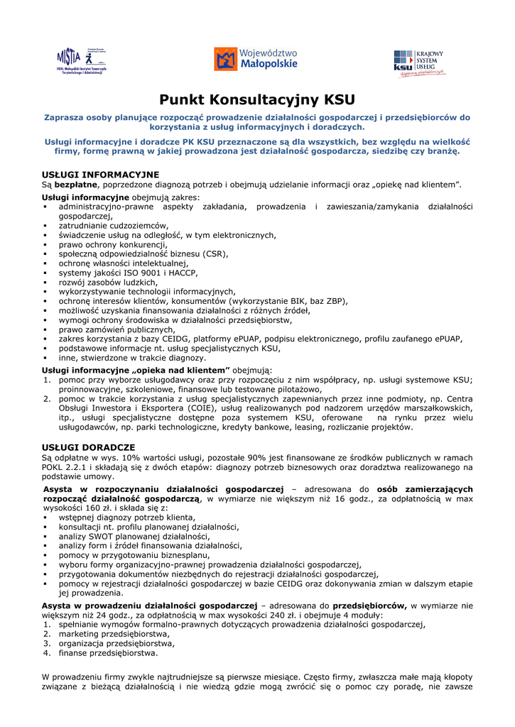 Punkt Konsultacyjny KSU Zaprasza osoby planujące rozpocząć prowadzenie działalności gospodarczej i przedsiębiorców do korzystania z usług informacyjnych i doradczych. Usługi informacyjne i doradcze PK KSU przeznaczone są dla wszystkich, bez względu na wielkość firmy, formę prawną w jakiej prowadzona jest działalność gospodarcza, siedzibę czy branżę. USŁUGI INFORMACYJNE Są bezpłatne, poprzedzone diagnozą potrzeb i obejmują udzielanie informacji oraz „opiekę nad klientem”. Usługi informacyjne obejmują zakres: administracyjno-prawne aspekty zakładania, prowadzenia i zawieszania/zamykania działalności gospodarczej, zatrudnianie cudzoziemców, świadczenie usług na odległość, w tym elektronicznych, prawo ochrony konkurencji, społeczną odpowiedzialność biznesu (CSR), ochronę własności intelektualnej, systemy jakości ISO 9001 i HACCP, rozwój zasobów ludzkich, wykorzystywanie technologii informacyjnych, ochronę interesów klientów, konsumentów (wykorzystanie BIK, baz ZBP), możliwość uzyskania finansowania działalności z różnych źródeł, wymogi ochrony środowiska w działalności przedsiębiorstw, prawo zamówień publicznych, zakres korzystania z bazy CEIDG, platformy ePUAP, podpisu elektronicznego, profilu zaufanego ePUAP, podstawowe informacje nt. usług specjalistycznych KSU, inne, stwierdzone w trakcie diagnozy. Usługi informacyjne „opieka nad klientem” obejmują: 1. pomoc przy wyborze usługodawcy oraz przy rozpoczęciu z nim współpracy, np. usługi systemowe KSU; proinnowacyjne, szkoleniowe, finansowe lub testowane pilotażowo, 2. pomoc w trakcie korzystania z usług specjalistycznych zapewnianych przez inne podmioty, np. Centra Obsługi Inwestora i Eksportera (COIE), usług realizowanych pod nadzorem urzędów marszałkowskich, itp., usługi specjalistyczne dostępne poza systemem KSU, oferowane na rynku przez wielu usługodawców, np. parki technologiczne, kredyty bankowe, leasing, rozliczanie projektów. USŁUGI DORADCZE Są odpłatne w wys. 10% wartości usługi, pozostałe 90% jest finansowane ze środków publicznych w ramach POKL 2.2.1 i składają się z dwóch etapów: diagnozy potrzeb biznesowych oraz doradztwa realizowanego na podstawie umowy. Asysta w rozpoczynaniu działalności gospodarczej – adresowana do osób zamierzających rozpocząć działalność gospodarczą, w wymiarze nie większym niż 16 godz., za odpłatnością w max wysokości 160 zł. i składa się z: wstępnej diagnozy potrzeb klienta, konsultacji nt. profilu planowanej działalności, analizy SWOT planowanej działalności, analizy form i źródeł finansowania działalności, pomocy w przygotowaniu biznesplanu, wyboru formy organizacyjno-prawnej prowadzenia działalności gospodarczej, przygotowania dokumentów niezbędnych do rejestracji działalności gospodarczej, pomocy w rejestracji działalności gospodarczej w bazie CEIDG oraz dokonywania zmian w dalszym etapie jej prowadzenia. Asysta w prowadzeniu działalności gospodarczej – adresowana do przedsiębiorców, w wymiarze nie większym niż 24 godz., za odpłatnością w max wysokości 240 zł. i obejmuje 4 moduły: 1. spełnianie wymogów formalno-prawnych dotyczących prowadzenia działalności gospodarczej, 2. marketing przedsiębiorstwa, 3. organizacja przedsiębiorstwa, 4. finanse przedsiębiorstwa. W prowadzeniu firmy zwykle najtrudniejsze są pierwsze miesiące. Często firmy, zwłaszcza małe mają kłopoty związane z bieżącą działalnością i nie wiedzą gdzie mogą zwrócić się o pomoc czy poradę, nie zawsze dysponują wystarczającymi środkami finansowymi by zapewnić sobie opiekę prawną, ekonomiczną, analityczną przez firmy komercyjne. Każdy, kto chce uzyskać informację związaną z zakładaniem i prowadzeniem działalności gospodarczej, może być klientem Punktu Konsultacyjnego. Z usług można korzystać: w siedzibie PK KSU, telefonicznie i na dyżurach lub w innych uzgodnionych lokalizacjach. Wynikiem pracy doradców będzie powstała w trakcie usługi doradczej dokumentacja, np.: dokumenty rejestracyjne firmy, (lub inne, np. do ZUS, US, wnioski o pozwolenia, itd.) analiza najkorzystniejszego sposobu rozliczania podatku dochodowego, biznes plan (lub element biznes planu), analiza finansowa (lub element), kosztorys przedsięwzięcia, przygotowany wniosek kredytowy lub o dotację (lub element), plan marketingowy, strategia rozwoju firmy, wezwanie do zapłaty i stanowić będzie potwierdzenie wykonania usługi. Prosimy o wcześniejsze umówienie się na spotkanie. Punkt Konsultacyjny KSU w Tarnowie Ośrodek MISTiA w Tarnowie 33-100 Tarnów ul. Sikorsiego 5 tel.: 14 621 22 16 e-mail: [email protected] www.mistia.org.pl czynny: pn.- pt.: 8:00 - 16:00 Dyżury Punktu Konsultacyjnego KSU w Tarnowie: Miejsce: Starostwo Powiatowe w Dąbrowie Tarnowskiej Adres: ul. Berka Joselewicza 5, 39-200 Dąbrowa Tarnowska Termin: każdy pierwszy wtorek miesiąca, godz.: 9:00 – 13:00 Miejsce: Urząd Miasta w Ryglicach Adres: ul. Rynek 9, 33-160 Ryglice Termin: każdy pierwszy poniedziałek miesiąca, godz.: 9:00 – 13:00 Miejsce: Powiatowy Urząd Pracy w Brzesku Adres: ul. Piłsudskiego 19, 32-800 Brzesko Termin: każda druga środa miesiąca, godz.: 9:00 – 13:00 Dane osobowe - W związku z obowiązkiem ewidencjonowania usług konieczne jest uzyskanie danych osobowych Klienta (m.in. imię, nazwisko, PESEL, w przypadku przedsiębiorców również kod PKD, NIP, nr REGON) oraz wyrażenie zgody na przetwarzanie danych do 31.12.2020 roku, zgodnie z Ustawą z dnia 29 sierpnia 1997 roku o ochronie danych osobowych (Dz.U. 1997 nr 133 poz. 883). Powyższe dane służą celom sprawozdawczym PK, w związku z czym informujemy o możliwości przeprowadzenia monitoringu przez Polską Agencję Rozwoju Przedsiębiorczości oraz wskazane przez PARP podmioty, obejmującego badania ankietowe oraz bezpośrednie wizyty przedstawicieli PARP u Klientów, którzy korzystali z usług Pu
