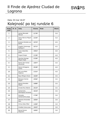II Finde de Ajedrez Ciudad de Logrono Data: 03 mar 16:07 Kolejność po tej rundzie 6 Kolej ność N. st. Imię Ocena Klub Skore 1 Lamas Mercadal Manuel 2179F 5.0 2 Saenz Narciso Miguel Angel 2234F 5.0 3 Jimenez Almeida Luis David 1972F 4.5 4 Angeleri Gastanaga Rodrigo N 2071F 4.5 5 Cano Cabanillas Javier 1901F 4.0 6 Huguet Sergio 2139F 4.0 7 Sanchez Quiroga Miguel Angel 2159F 4.0 8 Ramos Del Campo Alexander 1997F 4.0 9 Garcia Ochagavia Carlos 2018F 4.0 10 De Lucas Bello Federico 2101F 4.0 11 Bayo Milagro Alvaro 1626F 3.5 12 Blazquez Gomez Miguel 2056F 3.5 13 Alonso Gonzalez Miguel 1688F 3.5 14 Arnedo Ruiz Alberto 2013F 3.5 15 Santamarta Dominguez Fernando 1813F 3.5 16 Gonzalez Santamartina Jorge 1739F 3.0 17 Martinez Fernandez Raul 1850F 3.0 18 Ochoa Aldaz Mikel 1406F 3.0 19 Giraldez Camus Jose 1642F 3.0 20 Bernal Gomez Alejandro 1695F 3.0 Kolej ność N. st. Imię Ocena Klub Skore 21 Hernando Saiz Tomas 1574F 3.0 22 Gutierrez Abarrategui Luis 0 2.5 23 Alonso Gutierrez Miguel Angel 1515F 2.0 24 Jimenez Penafiel Gustavo 1795F 2.0 25 Egana Arruti Joseba 1891F 2.0 26 Aliane Diez Aaron 1494F 2.0 27 Ortin Blanco Inigo 0 1.5 28 Rodriguez Sanz Ismael 0 1.5 29 Blazquez Lafuente Daniel 0 1.0 30 Hernando Soler Tomas 1732F 1.0 31 Rodriguez Sanz Gabriel 0 1.0 32 Roldan Marques Daniel 0 1.0 33 Sanchez Cornago Raul 0 1.0 34 Ortin Blanco Ainhoa 0 1.0 35 Oliva Burgos Ignacio 0 1.0 36 Bayo Moreno Miguel Angel 0 0.5 37 Marques Irigoyen Paula 0 0.5 38 Artiguez Alvarez Gorka 0 0.0 Created by www.swips.eu