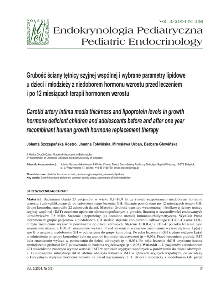 Vol. 3/2004 Nr 3(8) Endokrynologia Pediatryczna Pediatric Endocrinology Grubość ściany tętnicy szyjnej wspólnej i wybrane parametry lipidowe u dzieci i młodzieży z niedoborem hormonu wzrostu przed leczeniem i po 12 miesiącach terapii hormonem wzrostu Carotid artery intima media thickness and lipoprotein levels in growth hormone deficient children and adolescents before and after one year recombinant human growth hormone replacement therapy Jolanta Szczepańska Kostro, Joanna Tołwińska, Mirosława Urban, Barbara Głowińska II Klinika Chorób Dzieci Akademii Medycznej w Białymstoku 2nd Department of Childrens Diseases, Medical University of Białystok Adres do korespondencji: Jolanta Szczepańska-Kostro, II Klinika Chorób Dzieci, Samodzielny Publiczny Dziecięcy Szpital Kliniczny, 15-272 Białystok, ul. J. Waszyngtona 17, tel./fax: +48 85 7450730, email: [email protected] Słowa kluczowe: niedobór hormonu wzrostu, tętnica szyjna wspólna, parametry lipidowe Key words: Growth hormone deficiency, common carotid artery, parameters of lipid metabolism STRESZCZENIE/ STRESZCZENIE/ABSTRACT Materiał: Badaniami objęto 25 pacjentów w wieku 8,1–16,9 lat ze świeżo rozpoznanym niedoborem hormonu wzrostu i zakwalifikowanych do substytucyjnego leczenia GH. Badanie powtórzono po 12 miesiącach terapii GH. Grupę kontrolną stanowiło 22 zdrowych dzieci. Metody: Grubość warstwy wewnętrznej i środkowej ściany tętnicy szyjnej wspólnej (IMT) oceniono aparatem ultrasonograficznym z głowicą linearną o częstotliwości emitowanych ultradźwięków 7,5 MHz. Stężenie lipoproteiny (a) oceniono metodą immunoturbidymetryczną. Wyniki: Przed leczeniem w grupie pacjentów z niedoborem GH średnie stężenie cholesterolu całkowitego (CHOL-C) oraz LDLC było znamiennie wyższe w porównaniu do dzieci zdrowych. Stężenie CHOL-C i LDL-C po roku leczenia było znamiennie niższe, a HDL-C znamiennie wyższe. Przed leczeniem wykazano znamiennie wyższe stężenie Lp(a) i apo B w grupie z niedoborem GH w odniesieniu do grupy kontrolnej. Po roku leczenia rhGH średnie stężenie Lp(a) w odniesieniu do grupy kontrolnej było na granicy istotności statystycznej (p = 0,05). Przed leczeniem grubość IMT była znamiennie wyższa w porównaniu do dzieci zdrowych (p < 0,05). Po roku leczenia rhGH uzyskano istotne zmniejszenie grubości IMT porównaniu do badania wyjściowego (p < 0,05). Wnioski: 1. U pacjentów z niedoborem GH stwierdzono znacząco wyższe wartości IMT w tętnicach szyjnych wspólnych w porównaniu do dzieci zdrowych. 2. 12-miesięczna substytucja rhGH istotnie obniżyła wskaźnik IMT w tętnicach szyjnych wspólnych, co świadczy o korzystnym wpływie hormonu wzrostu na układ naczyniowy. 3. U dzieci i młodzieży z niedoborem GH przed Vol. 3/2004, Nr 3(8) 17 Praca oryginalna Endokrynol. Ped., 3/2004;3(8):17-27 leczeniem występuje wzrost stężenia cholesterolu całkowitego, LDL cholesterolu, lipoproteiny (a) i apolipoproteiny B, które normalizują się po 12-miesięcznej terapii rhGH. Materials: A total of 25 patients with newly diagnosed growth hormone deficiency aged 8.1–16.9 years were examined in our study. After 12-month rhGH therapy the study group was reevaluated. Controls included 22 healthy and slim children. Methods: Common carotid artery intima-media thickness (IMT) was measured with echocardiography and linear probe (7.5 MHz). Lipoprotein (a) serum levels were evaluated using immunoturbidimetric method. Results: Before rhGH therapy, the mean concentration of total cholesterol (TC) and LDL-cholesterol (LDL-C) was significantly higher in GH deficient children than in controls. The mean concentration of HDL-C was lower and of triglycerides (TG) was higher in GH deficient children than in controls (TG: 79.8 ± 33.4 vs 69.9 ± 27.7 mg/dl). After 1 year rhGH therapy the mean concentrations of LDL-C and HDL-C levels were significantly higher when compared to values before treatment. Before treatment, the mean concentrations of Lp(a) and apo B were significantly higher in GH deficient children than in controls. After 1 year rhGH therapy, the mean concentrations of Lp(a) was higher in GH deficient children than in controls (p = 0.05). Before treament, the mean values of IMT were significantly higher in GHD patients compared to healthy controls (p < 0.05). After 1 year rhGH therapy the mean thickness of carotid artery intima media in GHD children was significantly lower when compared to IMT before treatment (p < 0.05). Conclusions: 1. Significantly elevated IMT values in common carotid arteries were found in growth hormone deficient children in comparison with healthy children. 2. Significantly lower IMT values in common carotid arteries after 12 months rhGH therapy in GHD children may be an indicator of a beneficial effect of GH therapy on the vascular system. 3. Significantly higher mean concentration of total cholesterol (TC), LDL-C, lipoproteine (a) and apolipoprotein B were found in GH deficient children and adolescents before rhGH therapy, they got normalized after 12 months of rhGH therapy. Wstęp Hormon wzrostu (GH) odgrywa istotną rolę w regulacji funkcji układu sercowo-naczyniowego, a jego niedobór jest jednym z głównych czynników odpowiedzialnych za zwiększoną śmiertelność z powodu chorób układu krążenia, zarówno u młodych, jak i starszych pacjentów z niedoborem GH mającym początek w dzieciństwie lub w wieku dorosłym [1–4]. U osób dorosłych z niedoborem GH występuje większa liczba czynników ryzyka chorób układu sercowo-naczyniowego: hiperlipidemia, zwiększona ilość tkanki tłuszczowej w całkowitej masie ciała, przedwczesny rozwój miażdżycy, obniżona aktywność fibrynolityczna, zwiększona obwodowa oporność na insulinę, upośledzona tolerancja glukozy, zaburzenia struktury i funkcji mięśnia sercowego [5–11]. U dorosłych pacjentów z niedoborem GH krótko i długotrwała terapia rhGH wpływa na redukcję brzusz