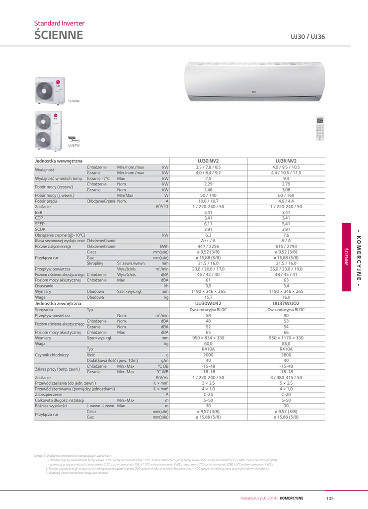 Standard Inverter ŚCIENNE UJ30 / UJ36 UU30W UU37W Jednostka wewnętrzna Min./nom./max Min./nom./max Max Nom. Nom. Min/Max Nom. kW kW kW kW kW W A ø/V/Hz Śr. zewn./wewn. Wys./śr./nis. Wys./śr./nis. Max Szer.×wys.×gł. kWh mm(cale) mm(cale) mm m3/min dBA dBA l/h mm kg Jednostka zewnętrzna Sprężarka Przepływ powietrza Typ Nom. Chłodzenie Nom. Poziom ciśnienia akustycznego Grzanie Nom. Poziom mocy akustycznej Chłodzenie Max Wymiary Szer.×wys.×gł. Waga Typ Czynnik chłodniczy Ilość Dodatkowa ilość (pow. 10m) Chłodzenie Min.~Max Zakres pracy (temp. zewn.) Grzanie Min.~Max Zasilanie Przewód zasilania (do jedn. zewn.) Przewód sterowania (pomiędzy jednostkami) Zabezpieczenie Całkowita długość instalacji Min.~Max Różnica wysokości J. wewn.~J.zewn. Max Ciecz Przyłącza rur Gaz m3/min dBA dBA dBA mm kg g g/m °C DB °C WB ø/V/Hz il. × mm² il. × mm² A m m mm(cale) mm(cale) UJ36.NV2 4,0 / 9,5 / 10,5 4,4 / 10,5 / 11,5 9,4 2,79 3,08 60 / 160 4,0 / 4,4 1 / 220-240 / 50 3,41 3,41 5,41 3,81 7,6 A/A 615 / 2793 ø 9,52 (3/8) ø 15,88 (5/8) 21,5 / 16,0 26,0 / 23,0 / 19,0 48 / 45 / 41 63 3,4 1190 × 346 × 265 16,0 UU30W.U42 UU37W.UO2 Dwu-rotacyjna BLDC 58 48 52 65 950 × 834 × 330 60,0 R410A 2000 40 -15~48 -18~18 1 / 220-240 / 50 3 × 2,5 4 × 1,0 C-25 5~50 30 ø 9,52 (3/8) ø 15,88 (5/8) Dwu-rotacyjna BLDC 90 53 54 66 950 × 1170 × 330 85,0 R410A 2800 40 -15~48 -18~18 3 / 380-415 / 50 5 × 2,5 4 × 1,0 C-20 5~50 30 ø 9,52 (3/8) ø 15,88 (5/8) Uwagi: 1. Wydajności mierzone w następujących warunkach: - chłodnicza przy parametrach: temp. wewn. 27°C suchy termometr (DB) / 19°C mokry termometr (WB); temp. zewn. 35°C suchy termometr (DB) /24°C mokry termometr (WB). - grzewcza przy parametrach: temp. wewn. 20°C suchy termometr (DB) / 15°C mokry termometr (WB); temp. zewn. 7°C suchy termometr (DB) / 6°C mokry termometr (WB). 2. Roczne zużycie energii: w oparciu o średnią pracę urządzenia przez 350 godzin w roku w trybie chłodzenia oraz 1 400 godzin w trybie grzania przy nominalnym obciążeniu. 3. Wymiary i dane techniczne mogą ulec zmianie. Klimatyzatory LG 2014 › KOMERCYJNE 105 • KO M E R C YJ N E • kW UJ30.NV2 3,5 / 7,8 / 8,5 4,0 / 8,4 / 9,2 7,5 2,29 2,46 50 / 140 10,0 / 10,7 1 / 220-240 / 50 3,41 3,41 6,11 3,91 6,3 A++ / A 447 / 2256 ø 9,52 (3/8) ø 15,88 (5/8) 21,5 / 16,0 23,0 / 20,0 / 17,0 45 / 42 / 40 61 3,0 1190 × 346 × 265 15,7 ŚCIENNE Chłodzenie Grzanie Wydajność w niskich temp. Grzanie -7°C Chłodzenie Pobór mocy (zestaw) Grzanie Pobór mocy (j. wewn.) Chłodzenie/Grzanie Pobór prądu Zasilanie EER COP SEER SCOP Obciążenie cieplne (@-10°C) Klasa sezonowej wydajn. ener. Chłodzenie/Grzanie Roczne zużycie energii Chłodzenie/Grzanie Ciecz Przyłącza rur Gaz Skropliny Przepływ powietrza Poziom ciśnienia akustycznego Chłodzenie Poziom mocy akustycznej Chłodzenie Osuszanie Wymiary Obudowa Waga Obudowa Wydajność