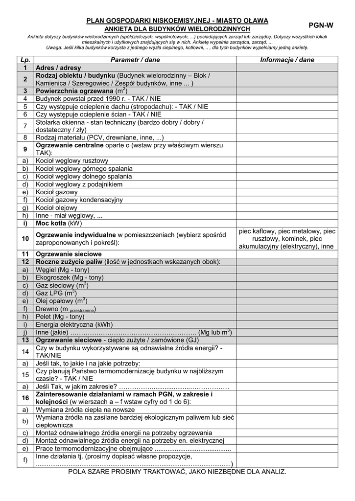 PLAN GOSPODARKI NISKOEMISYJNEJ - MIASTO OŁAWA ANKIETA DLA BUDYNKÓW WIELORODZINNYCH PGN-W Ankieta dotyczy budynków wielorodzinnych (spółdzielczych, wspólnotowych, ...) posiadających zarząd lub zarządcę. Dotyczy wszystkich lokali mieszkalnych i użytkowych znajdujących się w nich. Ankietę wypełnia zarządca, zarząd, ... Uwaga: Jeśli kilka budynków korzysta z jednego węzła cieplnego, kotłowni, .. , dla tych budynków wypełniamy jedną ankietę. Lp. Parametr / dane 1 Adres / adresy Rodzaj obiektu / budynku (Budynek wielorodzinny – Blok / 2 Kamienica / Szeregowiec / Zespół budynków, inne ... ) 3 Powierzchnia ogrzewana (m2) 4 Budynek powstał przed 1990 r. - TAK / NIE 5 Czy występuje ocieplenie dachu (stropodachu): - TAK / NIE 6 Czy występuje ocieplenie ścian - TAK / NIE Stolarka okienna - stan techniczny (bardzo dobry / dobry / 7 dostateczny / zły) 8 Rodzaj materiału (PCV, drewniane, inne, ...) Ogrzewanie centralne oparte o (wstaw przy właściwym wierszu 9 TAK): a) Kocioł węglowy rusztowy b) Kocioł węglowy górnego spalania c) Kocioł węglowy dolnego spalania d) Kocioł węglowy z podajnikiem e) Kocioł gazowy f) Kocioł gazowy kondensacyjny g) Kocioł olejowy h) Inne - miał węglowy, ... i) Moc kotła (kW) 10 11 12 a) b) c) d) e) f) h) i) j) 13 14 a) 15 a) 16 a) b) c) d) e) f) Ogrzewanie indywidualne w pomieszczeniach (wybierz spośród zaproponowanych i pokreśl): Informacje / dane piec kaflowy, piec metalowy, piec rusztowy, kominek, piec akumulacyjny (elektryczny), inne Ogrzewanie sieciowe Roczne zużycie paliw (ilość w jednostkach wskazanych obok): Węgiel (Mg - tony) Ekogroszek (Mg - tony) Gaz sieciowy (m3) Gaz LPG (m3) Olej opałowy (m3) Drewno (m przestrzenne) Pelet (Mg - tony) Energia elektryczna (kWh) Inne (jakie) …………………………………………………. (Mg lub m3) Ogrzewanie sieciowe - ciepło zużyte / zamówione (GJ) Czy w budynku wykorzystywane są odnawialne źródła energii? TAK/NIE Jeśli tak, to jakie i na jakie potrzeby: Czy planują Państwo termomodernizację budynku w najbliższym czasie? - TAK / NIE Jeśli Tak, w jakim zakresie? …………….....................……………… Zainteresowanie działaniami w ramach PGN, w zakresie i kolejności (w wierszach a – f wstaw cyfry od 1 do 6): Wymiana źródła ciepła na nowsze Wymiana źródła na zasilane bardziej ekologicznym paliwem lub sieć ciepłownicza Montaż odnawialnego źródła energii na potrzeby ogrzewania Montaż odnawialnego źródła energii na potrzeby en. elektrycznej Prace termomodernizacyjne obejmujące .......................................... Inne działania tj. (prosimy dopisać własne propozycje, ...........................................................................................................) POLA SZARE PROSIMY TRAKTOWAĆ, JAKO NIEZBĘDNE DLA ANALIZ.