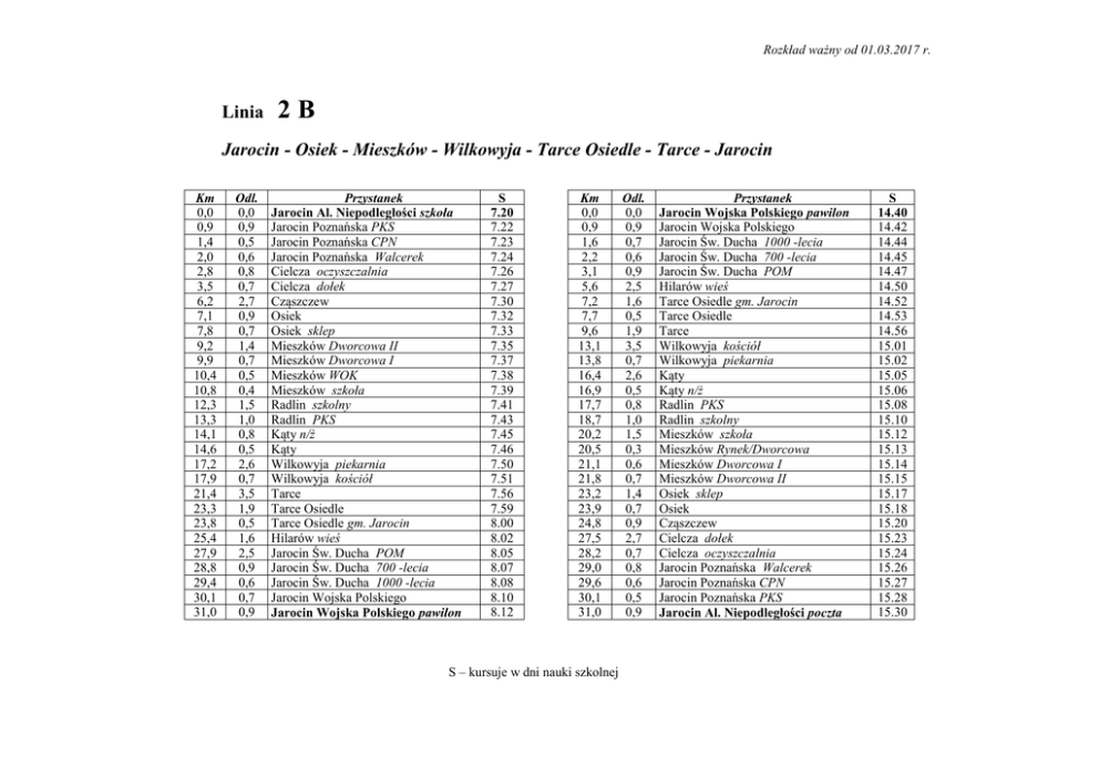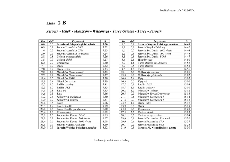 Rozkład ważny od 01.03.2017 r. Linia 2B Jarocin - Osiek - Mieszków - Wilkowyja - Tarce Osiedle - Tarce - Jarocin Km 0,0 0,9 1,4 2,0 2,8 3,5 6,2 7,1 7,8 9,2 9,9 10,4 10,8 12,3 13,3 14,1 14,6 17,2 17,9 21,4 23,3 23,8 25,4 27,9 28,8 29,4 30,1 31,0 Odl. 0,0 0,9 0,5 0,6 0,8 0,7 2,7 0,9 0,7 1,4 0,7 0,5 0,4 1,5 1,0 0,8 0,5 2,6 0,7 3,5 1,9 0,5 1,6 2,5 0,9 0,6 0,7 0,9 Przystanek Jarocin Al. Niepodległości szkoła Jarocin Poznańska PKS Jarocin Poznańska CPN Jarocin Poznańska Walcerek Cielcza oczyszczalnia Cielcza dołek Cząszczew Osiek Osiek sklep Mieszków Dworcowa II Mieszków Dworcowa I Mieszków WOK Mieszków szkoła Radlin szkolny Radlin PKS Kąty n/ż Kąty Wilkowyja piekarnia Wilkowyja kościół Tarce Tarce Osiedle Tarce Osiedle gm. Jarocin Hilarów wieś Jarocin Św. Ducha POM Jarocin Św. Ducha 700 -lecia Jarocin Św. Ducha 1000 -lecia Jarocin Wojska Polskiego Jarocin Wojska Polskiego pawilon S 7.20 7.22 7.23 7.24 7.26 7.27 7.30 7.32 7.33 7.35 7.37 7.38 7.39 7.41 7.43 7.45 7.46 7.50 7.51 7.56 7.59 8.00 8.02 8.05 8.07 8.08 8.10 8.12 Km 0,0 0,9 1,6 2,2 3,1 5,6 7,2 7,7 9,6 13,1 13,8 16,4 16,9 17,7 18,7 20,2 20,5 21,1 21,8 23,2 23,9 24,8 27,5 28,2 29,0 29,6 30,1 31,0 S – kursuje w dni nauki szkolnej Odl. 0,0 0,9 0,7 0,6 0,9 2,5 1,6 0,5 1,9 3,5 0,7 2,6 0,5 0,8 1,0 1,5 0,3 0,6 0,7 1,4 0,7 0,9 2,7 0,7 0,8 0,6 0,5 0,9 Przystanek Jarocin Wojska Polskiego pawilon Jarocin Wojska Polskiego Jarocin Św. Ducha 1000 -lecia Jarocin Św. Ducha 700 -lecia Jarocin Św. Ducha POM Hilarów wieś Tarce Osiedle gm. Jarocin Tarce Osiedle Tarce Wilkowyja kościół Wilkowyja piekarnia Kąty Kąty n/ż Radlin PKS Radlin szkolny Mieszków szkoła Mieszków Rynek/Dworcowa Mieszków Dworcowa I Mieszków Dworcowa II Osiek sklep Osiek Cząszczew Cielcza dołek Cielcza oczyszczalnia Jarocin Poznańska Walcerek Jarocin Poznańska CPN Jarocin Poznańska PKS Jarocin Al. Niepodległości poczta S 14.40 14.42 14.44 14.45 14.47 14.50 14.52 14.53 14.56 15.01 15.02 15.05 15.06 15.08 15.10 15.12 15.13 15.14 15.15 15.17 15.18 15.20 15.23 15.24 15.26 15.27 15.28 15.30