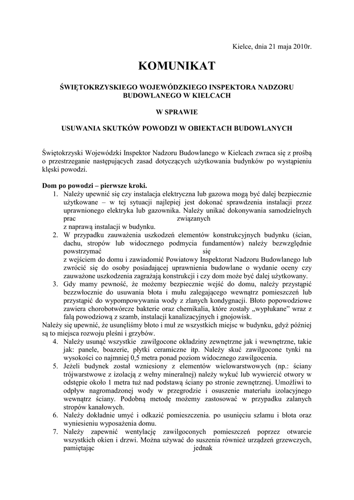 Kielce, dnia 21 maja 2010r. KOMUNIKAT ŚWIĘTOKRZYSKIEGO WOJEWÓDZKIEGO INSPEKTORA NADZORU BUDOWLANEGO W KIELCACH W SPRAWIE USUWANIA SKUTKÓW POWODZI W OBIEKTACH BUDOWLANYCH Świętokrzyski Wojewódzki Inspektor Nadzoru Budowlanego w Kielcach zwraca się z prośbą o przestrzeganie następujących zasad dotyczących użytkowania budynków po wystąpieniu klęski powodzi. Dom po powodzi – pierwsze kroki. 1. Należy upewnić się czy instalacja elektryczna lub gazowa mogą być dalej bezpiecznie użytkowane – w tej sytuacji najlepiej jest dokonać sprawdzenia instalacji przez uprawnionego elektryka lub gazownika. Należy unikać dokonywania samodzielnych prac związanych z naprawą instalacji w budynku. 2. W przypadku zauważenia uszkodzeń elementów konstrukcyjnych budynku (ścian, dachu, stropów lub widocznego podmycia fundamentów) należy bezwzględnie powstrzymać się z wejściem do domu i zawiadomić Powiatowy Inspektorat Nadzoru Budowlanego lub zwrócić się do osoby posiadającej uprawnienia budowlane o wydanie oceny czy zauważone uszkodzenia zagrażają konstrukcji i czy dom może być dalej użytkowany. 3. Gdy mamy pewność, że możemy bezpiecznie wejść do domu, należy przystąpić bezzwłocznie do usuwania błota i mułu zalegającego wewnątrz pomieszczeń lub przystąpić do wypompowywania wody z zlanych kondygnacji. Błoto popowodziowe zawiera chorobotwórcze bakterie oraz chemikalia, które zostały „wypłukane” wraz z falą powodziową z szamb, instalacji kanalizacyjnych i gnojowisk. Należy się upewnić, że usunęliśmy błoto i muł ze wszystkich miejsc w budynku, gdyż później są to miejsca rozwoju pleśni i grzybów. 4. Należy usunąć wszystkie zawilgocone okładziny zewnętrzne jak i wewnętrzne, takie jak: panele, boazerie, płytki ceramiczne itp. Należy skuć zawilgocone tynki na wysokości co najmniej 0,5 metra ponad poziom widocznego zawilgocenia. 5. Jeżeli budynek został wzniesiony z elementów wielowarstwowych (np.: ściany trójwarstwowe z izolacją z wełny mineralnej) należy wykuć lub wywiercić otwory w odstępie około 1 metra tuż nad podstawą ściany po stronie zewnętrznej. Umożliwi to odpływ nagromadzonej wody w przegrodzie i osuszenie materiału izolacyjnego wewnątrz ściany. Podobną metodę możemy zastosować w przypadku zalanych stropów kanałowych. 6. Należy dokładnie umyć i odkazić pomieszczenia. po usunięciu szlamu i błota oraz wyniesieniu wyposażenia domu. 7. Należy zapewnić wentylację zawilgoconych pomieszczeń poprzez otwarcie wszystkich okien i drzwi. Można używać do suszenia również urządzeń grzewczych, pamiętając jednak o ich bezpiecznym wykorzystywaniu. Nie należy przegrzewać suszonych pomieszczeń (ponad 350C) gdyż sprzyja to szybkiemu rozwojowi pleśni i grzybów. Ponadto wyższa temperatura może spowodować uszkodzenia elementów wyposażenia budynku (wypaczenie się mebli i innych elementów drewnianych), które nie uległy zniszczeniu podczas powodzi. 8. Należy zapewnić odpompowanie zgromadzonej wody w szambach oraz przydomowych oczyszczalniach. W przypadku przydomowych oczyszczalni potrzebne będzie oczyszczenie zamulonej instalacji rozsączającej i drenażowej, Przydomowe oczyszczalnie można eksploatować gdy poziom wody gruntowej spadnie poniżej posadowienia drenów rozsączających. 9. Woda w studniach nie nadaje się do picia po powodzi. Należy zapewnić odpompowanie wody ze studni, przeprowadzić jej dezynfekcję i wymienić warstwy znajdujące się na dnie. Woda może nadawać się do spożycia tylko po przeprowadzeniu badań w stacji Sanepidu. Dom po powodzi – dalsze postępowanie. 1. Gdy już usunęliśmy z domu pierwsze zagrożenie związane z rozwojem pleśni i grzybów można przystąpić do remontu budynku. Wskazane jest skontaktowanie się z osobą posiadającą fachowe przygotowanie do oceny stanu technicznego budynku wraz z instalacjami i urządzeniami. Oprócz oceny stanu technicznego samego domu, należy zwrócić również uwagę na stan techniczny instalacji w które wyposażony jest budynek. To samo odnosi się do urządzeń grzewczych takich piece kotłowe i piecyki gazowe lub elektryczne. Należy pamiętać, że za stan przyłączy do budynku odpowiadają poszczególni dostawcy mediów (energia elektryczna, gaz, woda) i bez ich pozytywnych opinii nie należy samodzielnie włączać urządzeń zasilanych przez te media. 2. Osoba dokonująca takiej oceny stanu technicznego budynku powinna zwrócić szczególną uwagę na stan izolacji budynku (ścian, stropów i posadzek) oraz wskazać optymalną metodę ich naprawy. 3. Należy zadbać o właściwe odprowadzanie wód opadowych z dachu, żeby nie powodować dalszego zawilgacania ścian i posadzek. 4. W przypadku zauważenia wystąpienia pleśni lub grzybów należy zwrócić się do fachowca, który wskaże metodę ich usunięcia. Kielce, dnia 21 maja 2010r.