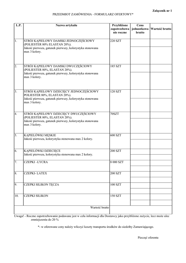 Załącznik nr 1 PRZEDMIOT ZAMÓWIENIA - FORMULARZ OFERTOWY* L.P. Nazwa artykułu PrzybliŜone Cena zapotrzebowa jednostkowa Wartość brutto nie roczne brutto 1. STRÓJ KĄPIELOWY DAMSKI JEDNOCZĘŚCIOWY (POLIESTER 80% ELASTAN 20%). Jakość pierwsza, gatunek pierwszy, kolorystyka stonowana max 3 kolory. 220 SZT 2. STRÓJ KĄPIELOWY DAMSKI DWUCZĘŚCIOWY (POLIESTER 80%, ELASTAN 20%). Jakość pierwsza, gatunek pierwszy, kolorystyka stonowana max 3 kolory. 185 SZT 3. STRÓJ KĄPIELOWY DZIECIĘCY JEDNOCZĘŚCIOWY POLIESTER 80%, ELASTAN 20%). Jakość pierwsza, gatunek pierwszy, kolorystyka stonowana max 3 kolory. 120 SZT 4. STRÓJ KĄPIELOWY DZIECIĘCY DWUCZĘŚCIOWY (POLIESTER 80%, ELASTAN 20%). Jakość pierwsza, gatunek pierwszy, kolorystyka stonowana max 3 kolory. 70SZT 5. KĄPIELÓWKI MĘSKIE Jakość pierwsza, kolorystyka stonowana max 2 kolory. 600 SZT 6. KĄPIELÓWKI DZIECIĘCE Jakość pierwsza, kolorystyka stonowana max 2 kolory. 200 SZT 7. CZEPKI –LYCRA 8 000 SZT 8. CZEPKI- LATEX 200 SZT 9. CZEPKI SILIKON TĘCZA 100 SZT 10. CZEPKI SILIKON 150 SZT Wartość brutto Uwaga! - Roczne zapotrzebowanie podawane jest w celu informacji dla Dostawcy jako przybliŜone zuŜycie, lecz moŜe ulec zmniejszeniu do 20 % *- w oferowane ceny naleŜy wliczyć koszty transportu środków do siedziby Zamawiającego. Pieczęć oferenta