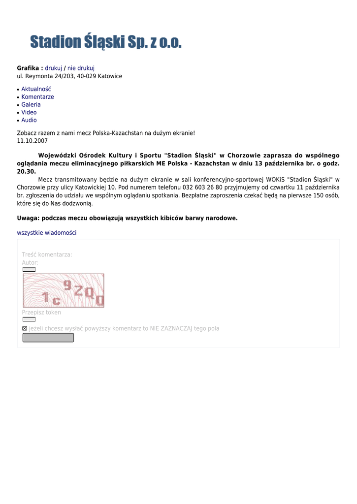 Grafika : drukuj / nie drukuj ul. Reymonta 24/203, 40-029 Katowice ● ● ● ● ● Aktualność Komentarze Galeria Video Audio Zobacz razem z nami mecz Polska-Kazachstan na dużym ekranie! 11.10.2007 Wojewódzki Ośrodek Kultury i Sportu "Stadion Śląski" w Chorzowie zaprasza do wspólnego oglądania meczu eliminacyjnego piłkarskich ME Polska - Kazachstan w dniu 13 października br. o godz. 20.30. Mecz transmitowany będzie na dużym ekranie w sali konferencyjno-sportowej WOKiS "Stadion Śląski" w Chorzowie przy ulicy Katowickiej 10. Pod numerem telefonu 032 603 26 80 przyjmujemy od czwartku 11 października br. zgłoszenia do udziału we wspólnym oglądaniu spotkania. Bezpłatne zaproszenia czekać będą na pierwsze 150 osób, które się do Nas dodzwonią. Uwaga: podczas meczu obowiązują wszystkich kibiców barwy narodowe. wszystkie wiadomości Treść komentarza: Autor: Przepisz token jeżeli chcesz wysłać powyższy komentarz to NIE ZAZNACZAJ tego pola dodaj komentarz