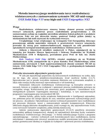 Metoda innowacyjnego modelowania tarcz rozdrabniaczy wielotarczowych z zastosowaniem systemów MCAD mid-range UGS Solid Edge V15 oraz high-end UGS Unigraphics NX2 Wstęp Rozdrabniacze wielotarczowe stanową istotny element procesu recyklingu tworzyw sztucznych, ponieważ proces rozdrabniania przeprowadzony z ich zastosowaniem cechuje się względnie niewielkim udziałem frakcji pylistych w produkcie końcowym. Fakt ten jest niezwykle istotny, ponieważ frakcje pyliste (miały) są nieekonomiczne lub mało użyteczne do wytłaczania tworzyw. Uwzględniając wciąż zwiększające się wymagania Unii Europejskiej, dotyczące procentowego udziału materiałów wtórnych w przetwórstwie tworzyw sztucznych, prowadzi się szereg prac naukowo-badawczych, mających na celu poszukiwanie optymalnych rozwiązań konstrukcyjnych rozdrabniaczy wielotarczowych. Jednym z kluczowych ośrodków naukowych w Polsce, zajmujących się tą tematyką jest Katedra Maszyn Spożywczych i Ochrony Środowiska na Wydziale Mechanicznym ATR w Bydgoszczy, prowadzona przez Prof. dr hab. inż. Józefa Flizikowskiego. Koło Naukowe Solid Edge (KNSE), również znajdujące się na Wydziale Mechanicznym ATR, zaangażowało się w prace Katedry Prof. Flizikowskiego, celem zastosowania, używanych w Kole najnowocześniejszych obecnie systemów MCAD na świecie: UGS Solid Edge V15 i UGS Unigraphics NX2, w profesjonalnych badaniach naukowych. Potrzeba stosowania algorytmów genetycznych W celu jak najszybszego pojawienia się nowoczesnych rozdrabniaczy na rynku, dąży się do tego, aby proces projektowo-konstrukcyjny trwał możliwie krótko [1,2,7]. Spowodowane jest to przede wszystkim zamiarem obniżenia cen wytwarzania urządzeń, a także stale rosnącą liczbą innowacji wprowadzanych w ich konstrukcji. Elementami roboczymi rozdrabniacza wielotarczowego są krawędzie otworów w tarczach, którym ze względu na wydajność i sprawność procesu rozdrabniania poświęca się szczególną uwagę. Koniecznością jest stosowanie przez projektanta i konstruktora m.in. inteligentnych systemów wspomagania innowacji i konstrukcji, w tym zaawansowanych programów wspomagania prac inżynierskich MCAD. Ideałem byłoby, gdyby każde urządzenie funkcjonowało w konfiguracji optymalnej, tzn. pobierana przez nie energia dążyła do zera, natomiast sprawność wykonywanego przez nie procesu - do jedności. Optymalizacja wartości wybranych parametrów tarcz rozdrabniacza jest procesem złożonym, nawet z zastosowaniem narzędzi komputerowych. Klasyczne obliczenia ulegają dalszemu skomplikowaniu, jeżeli wymaga się, aby optymalizowano wiele, coraz nowszych wariantów urządzenia, jedną metodą numeryczną. Jedynie zastosowanie algorytmów genetycznych [2,3,4,5] umożliwia stworzenie uniwersalnej aplikacji komputerowej, służącej do optymalizacji dowolnej liczby wariantów rozdrabniacza wielotarczowego. Otrzymując - w formie informacyjnego wyjścia z programu optymalizującego – wartości wybranych cech konstrukcyjnych tarcz rozdrabniacza, można natychmiast i automatycznie stworzyć asocjatywne modele przestrzenne tych elementów w postaci geometrycznie idealnej ze względu na wydajność i sprawność procesu rozdrabniania. 1 Sposób uzyskania zoptymalizowanych wartości wybranych parametrów konstrukcyjnych tarcz rozdrabniacza Wykorzystano program IE_TEST-07_BIO [8], do którego kodu zaimplementowano algorytmy genetyczne. Wybrane okna dialogowe programu przedstawiono na Rys. 1. Do programu wprowadza się wartości wybranych parametrów procesu rozdrabniania, z których najważniejszymi są: cechy geometryczne i materiałowe rozdrabnianego materiału (Rys. 1.a), rodzaj, moc i sprawność napędu urządzenia oraz liczba i wymiary tarcz rozdrabniacza w jego zaproponowanej koncepcji pierwotnej (Rys. 1.b). Poza tym, użytkownik proponuje wartości parametrów kinematycznych (np. wartość prędkości kątowej) i dynamicznych (wartości wybranych współczynników oporu) pierwotnej koncepcji zespołu rozdrabniacza (Rys. 1.c). a) c) b) Rys. 1. Wybrane okna dialogowe programu IE_TEST-07_BIO, podczas wprowadzania wartości wybranych parametrów procesu rozdrabniania: a) cechy rozdrabnianego materiału, b) cechy geometryczne tarcz oraz cechy siłowe źródła ich napędu, c) cechy kinematyczne i dynamiczne zespołu roboczego rozdrabniacza a) b) Rys. 2. Odpowiedzi programu, uzyskane dzięki zastosowaniu zaimplementowanych w jego kodzie algorytmów genetycznych: a) optymalne wartości wybranych parametrów konstrukcyjnych rozdrabniacza, b) wykres chwilowych wartości przekrojów rozdrabniania podczas procesu wykonywanego przez urządzenie w konfiguracji optymalnej 2 W chwili uruchomienia solver’a programu, rozpoczyna się tzw. skanowanie przestrzeni możliwych rozwiązań – typowy proces optymalizacji konstrukcji z zastosowaniem algorytmów genetycznych, wykorzystujących złożony model matematyczny. Tworzona jest bardzo duża liczba rozwiązań tj. elementów populacji, następnie w wyniku reprodukcji, krzyżowania i mutacji, następuje selekcja – wybór najlepszego rozwiązania (optimum) ze względu na sprawność i wydajność procesu rozdrabniania (również inne kryterium). Odpowiedzią programu IE_TEST-07_BIO jest zoptymalizowany zbiór uprzednio wprowadzonych wartości parametrów konstrukcyjnych urządzenia (Rys. 2.a). Optymalizacja zbioru danych wsadowych ma na celu dokonanie minimalnej ilości zmian ich wartości, aby wydajność i sprawność procesu rozdrabniania, zależne od sposobu funkcjonowania urządzenia, były maksymalnie zbliżone do ideału. Poza tym, informacyjnym wyjściem z programu jest szereg wykresów, na których przedstawiono wartości parametrów pracy urządzenia w konfiguracji optymalnej, m.in. chwilowe wartości przekrojów rozdrabniania (Rys. 2.b) oraz sił działających na elementy robocze rozdrabniacza w funkcji czasu trwania procesu. Rys. 3. Odpowiedzi programu optymalizującego IE_TEST-07