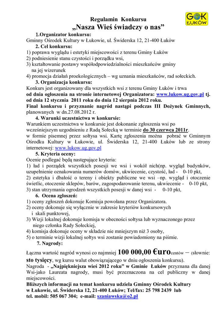 Regulamin Konkursu „Nasza Wieś świadczy o nas” 1.Organizator konkursu: Gminny Ośrodek Kultury w Łukowie, ul. Świderska 12, 21-400 Łuków 2. Cel konkursu: 1) poprawa wyglądu i estetyki miejscowości z terenu Gminy Łuków 2) podniesienie stanu czystości i porządku wsi, 3) kształtowanie postawy współodpowiedzialności mieszkańców gminy na jej wizerunek 4) promocja działań proekologicznych – wg uznania mieszkańców, rad sołeckich. 3. Organizacja konkursu: Konkurs jest organizowany dla wszystkich wsi z terenu Gminy Łuków i trwa od dnia ogłoszenia na stronie internetowej Organizatora: www.lukow.ug.gov.pl tj. od dnia 12 stycznia 2011 roku do dnia 12 sierpnia 2012 roku. Finał konkursu i przyznanie nagród nastąpi podczas III Dożynek Gminnych, planowanych w dn.27.08.2012 r. 4. Warunki uczestnictwa w konkursie: Warunkiem uczestnictwa w konkursie jest dokonanie zgłoszenia wsi po wcześniejszym uzgodnieniu z Radą Sołecką w terminie do 30 czerwca 2011r. w formie pisemnej przez sołtysa wsi. Kartę zgłoszenia można pobrać w Gminnym Ośrodku Kultury w Łukowie, ul. Świderska 12, 21-400 Łuków lub ze strony internetowej: www.lukow.ug.gov.pl 5. Kryteria oceny: Ocenie podlegać będą następujące kryteria: 1) ład i porządek wszystkich posesji we wsi i wokół nich(np. wygląd budynków, uzupełnienie oznakowania numerów domów, ukwiecenie, czystość, ład - 0-10 pkt, 2) estetyka i dbałość o tereny i obiekty publiczne we wsi –np. wygląd i otoczenie świetlic, otoczenie sklepów, barów, zagospodarowanie terenu, ukwiecenie - 0-10 pkt, 3) stan utrzymania ogrodzeń wszystkich posesji w danej wsi - 0-10 pkt, 6. Ocena zgłoszeń: 1) oceny zgłoszeń dokonuje Komisja powołana przez Organizatora. 2) oceny dokonuje się wyłącznie w zakresie kryteriów konkursowych i skali punktowej, 3) Wizji lokalnej dokonuje komisja w obecności sołtysa lub wyznaczonego przez niego członka Rady Sołeckiej, 4) komisja dokonuje oceny w składzie nie mniejszym niż 3 osoby, 5) o terminie wizji lokalnej sołtys wsi zostanie powiadomiony na piśmie. 7. Nagrody: €uro Łączna wartość nagród wynosi co najmniej 100 000,00 centów – (słownie: sto tysięcy, wg kursu walut obowiązującego w dniu ogłoszenia konkursu). Nagroda - „Najpiękniejsza wieś 2012 roku” w Gminie Łuków przyznana dla danej Wsi-jako Laureata nagrody, musi być przeznaczona na cel publiczny w danej miejscowości. Bliższych informacji na temat konkursu udziela Gminny Ośrodek Kultury w Łukowie, ul. Świderska 12, 21-400 Łuków; Tel/fax: 25 798 2439 lub tel. mobil: 505 067 304; e-mail: [email protected] Załącznik do Regulaminu konkursu „Nasza Wieś świadczy o nas” KARTA ZGŁOSZEŃ udziału w konkursie *) 1. Nazwa wsi: ................................................................................................................ 2. Gmina: ........................................................................................................................ 3. Imię i nazwisko sołtysa: ........................................................................................ 4. Zgłaszam udział wsi do konkursu „Nasza Wieś świadczy o nas” i akceptuję kryteria regulaminowe. ................................................. Miejscowość i data ................................................ podpis i pieczątka sołtysa *) KARTĘ ZGŁOSZEŃ do udziału w konkursie należy złożyć w nieprzekraczalnym terminie do dnia 30 czerwca 2011 roku.