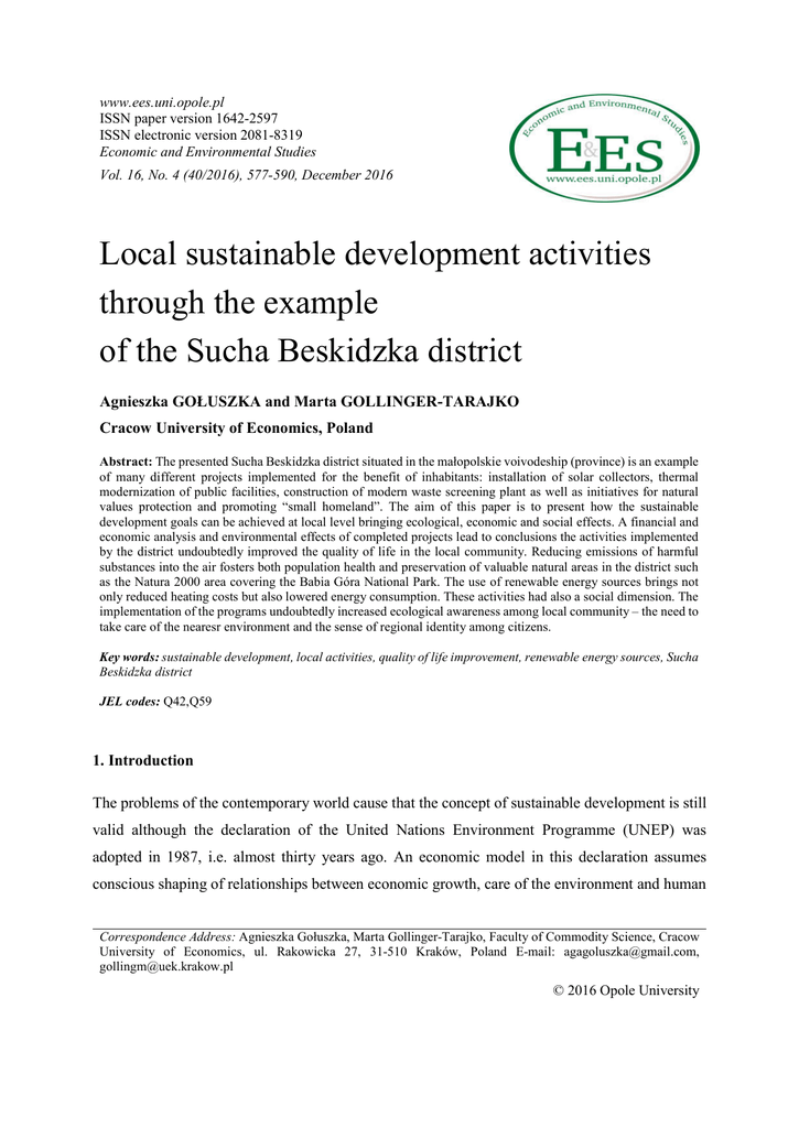 www.ees.uni.opole.pl ISSN paper version 1642-2597 ISSN electronic version 2081-8319 Economic and Environmental Studies Vol. 16, No. 4 (40/2016), 577-590, December 2016 Local sustainable development activities through the example of the Sucha Beskidzka district Agnieszka GOŁUSZKA and Marta GOLLINGER-TARAJKO Cracow University of Economics, Poland Abstract: The presented Sucha Beskidzka district situated in the małopolskie voivodeship (province) is an example of many different projects implemented for the benefit of inhabitants: installation of solar collectors, thermal modernization of public facilities, construction of modern waste screening plant as well as initiatives for natural values protection and promoting “small homeland”. The aim of this paper is to present how the sustainable development goals can be achieved at local level bringing ecological, economic and social effects. A financial and economic analysis and environmental effects of completed projects lead to conclusions the activities implemented by the district undoubtedly improved the quality of life in the local community. Reducing emissions of harmful substances into the air fosters both population health and preservation of valuable natural areas in the district such as the Natura 2000 area covering the Babia Góra National Park. The use of renewable energy sources brings not only reduced heating costs but also lowered energy consumption. These activities had also a social dimension. The implementation of the programs undoubtedly increased ecological awareness among local community – the need to take care of the nearesr environment and the sense of regional identity among citizens. Key words: sustainable development, local activities, quality of life improvement, renewable energy sources, Sucha Beskidzka district JEL codes: Q42,Q59 1. Introduction The problems of the contemporary world cause that the concept of sustainable development is still valid although the declaration of the United Nations Environment Programme (UNEP) was adopted in 1987, i.e. almost thirty years ago. An economic model in this declaration assumes conscious shaping of relationships between economic growth, care of the environment and human Correspondence Address: Agnieszka Gołuszka, Marta Gollinger-Tarajko, Faculty of Commodity Science, Cracow University of Economics, ul. Rakowicka 27, 31-510 Kraków, Poland E-mail: [email protected], [email protected] © 2016 Opole University Agnieszka GOŁUSZKA and Marta GOLLINGER-TARAJKO health. The term “sustainable development” is present also in Polish legal regulations and is defined as a social and economic development that integrates political, economic and social activities to meet the needs of the present generation and future generations while maintaining natural equilibrium and continuity of basic natural processes (Environmental Protection Act 2000). This concept is universal both at global (international), national and local community levels. The next motto: “Thing globally, act locally” originated in 1992 in Rio de Janeiro during the United Nations conference on environment and development underlines the significance of local initiatives for sustainable development of global economy. The aim of this meeting was to develop guidelines for environment protection activities and behaviours. The summit resulted in such documents as Rio Declaration consisting of 27 principles intended to guide countries in sustainable development. The next document was Agenda 21 the scope of actions for sustainable development to be executed at global, national and local levels in the 21st century. The task were set forth to reduce greenhouse gas emissions that cause climate change. The most important is minimising air pollution with harmful substances. The last declaration refers to forests and its values introduced into social life, supporting tradition and eco-development (Ignatowicz, 2015: 223-236). The presented tasks defined the direction of sustainable development that should be started from local activities. Sustainable development strategies are quite commonly used by various social organizations, business environments, corporations and enterprises that implement innovative technologies, thus enhancing environmental quality and human health. Sustainable development applies also to individual responsibility for decision making in everyday life having an impact on shaping and development of our nearest environment, e.g. waste management in households, water savings, selecting ecological heating systems, reducing excessive consumption, and the sense of regional identity with a small homeland. The Sucha Beskidzka district is an example of local initiatives for sustainable development and completed projects were aimed at human health protection and the preservation of valuable natural areas. In several years a number of important projects was completed, while taking into account local problems, in particular disastrous air pollution. One of such undertakings was to increase the use of renewable energy resources and to improve air quality in the NATURA 2000 areas. More than 2300 solar collector kits were installed in individual buildings and in 5 public facilities. Also thermal modernization of public facility complexes was carried out and the waste 578 LOCAL SUSTAINABLE DEVELOPMENT ACTIVITIES THROUGH THE EXAMPLE OF THE SUCHA BESKIDZKA DISTRICT screening plant was modernized and equipped with modern equipment and solutions based on contemporary standards (District Office in Sucha Beskidzka, 2015). 2. The subject and area of the study The subject of this study is environmental projects completed in the Sucha Beskidzka district to improve environmental quality, especially atmospheric air pollution and to gain measurable benefits due to energy savings and reduced building heating costs for thermal energy provision. The completed projects were assessed for achieving the assumptions of sustainable development
