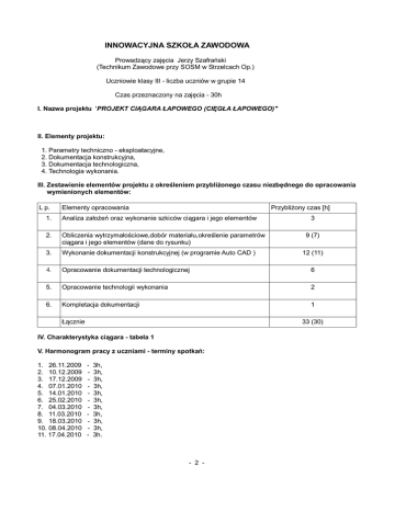 INNOWACYJNA SZKOŁA ZAWODOWA Prowadzący zajęcia Jerzy Szafrański (Technikum Zawodowe przy SOSM w Strzelcach Op.) Uczniowie klasy III - liczba uczniów w grupie 14 Czas przeznaczony na zajęcia - 30h I. Nazwa projektu 'PROJEKT CIĄGARA ŁAPOWEGO (CIĘGŁA ŁAPOWEGO)" II. Elementy projektu: 1. Parametry techniczno - eksploatacyjne, 2. Dokumentacja konstrukcyjna, 3. Dokumentacja technologiczna, 4. Technologia wykonania. III. Zestawienie elementów projektu z określeniem przybliżonego czasu niezbędnego do opracowania wymienionych elementów: L p. Elementy opracowania Przybliżony czas [h] 1. Analiza założeń oraz wykonanie szkiców ciągara i jego elementów 2. Obliczenia wytrzymałościowe,dobór materiału,określenie parametrów ciągara i jego elementów (dane do rysunku) 3. Wykonanie dokumentacji konstrukcyjnej (w programie Auto CAD ) 4. Opracowanie dokumentacji technologicznej 6 5. Opracowanie technologii wykonania 2 6. Kompletacja dokumentacji 1 Łącznie 9 (7) 12 (11) 33 (30) IV. Charakterystyka ciągara - tabela 1 V. Harmonogram pracy z uczniami - terminy spotkań: 1. 26.11.2009 2. 10.12.2009 3. 17.12.2009 4. 07.01.2010 5. 14.01.2010 6. 25.02.2010 7. 04.03.2010 8. 11.03.2010 9. 18.03.2010 10. 08.04.2010 11. 17.04.2010 3 - 3h, 3h, 3h, 3h, 3h, 3h, 3h, 3h, 3h, 3h, 3h. - 2 - VI. Charakterystyka zajęć: 1. Praca w pięciu grupach, 2. Każda grupa opracowuje projekt według różnych założeń techniczno - eksploatacyjnych. VII. Literatura: 1. Rutkowski A. ; Części maszyn , 2. Okraszewski K. ; Ćwiczenia konstrukcyjne, 3. Kurmaz L. , Kurmaz O. ; Projektowanie węzłów i części maszyn, 4. Polskie Normy ; PN-91/M-02105 , PN-89/M-01134 , PN-85/M-01121 , PN-89/M-01146 , PN-83/M-01152, PN-89/N-01695 , PN-80/N-01610 , PN-91/N-01604. Opracował : Jerzy Szafrański Opole , 25.11.2009 -3- Charakterystyka i warunki pracy ciągara Tabela 1 GRUPY │ L p. Parametry │ I II III IV V 20 45 15 60 75 zmienne zmienne zmienne 500 600 400 600 700 1 Przenoszone obciążenie [kN] 2 Rodzaj obciążenia (bez zginania) 3 Rozstaw osi sworzni lo [mm] 4 Średnica otworów części łapowej [mm] 12÷16 15÷20 10÷12 18÷24 22÷30 5 Pasowanie sworzni z otworami ciągara H11/a11 H11/c11 B11/h11 C11/h11 D11/h11 6 Rodzaj połączenia spawanego - spoina pachwinowa nie wyprowadzona na podkładki ∟a x ls ∟a x ls ∟a x ls ∟a x ls ∟a x ls 7 Wymiary otworu ciągara axa [mm x mm] 20x20 25x25 16x16 30x30 36x36 8 Odległość otworu ciągara od krawędzi części łapowej (lw≥pxlo) p= 0,25 0,25 0,25 0,25 0,25 9 Zależność między szerokością części b= łapowej a szerokością ciągara (s2≤bxs1) 0,75 0,75 0,75 0,75 0,75 10 Zależność między grubościami c= elementów ciągara (g2≤cxg1) 0,5÷0,7 0,5÷0,7 0,5÷0,7 0,5÷0,7 0,5÷0,7 11 r2=s2/2 r2=s2/2 r2=s2/2 r2=s2/2 r2=s2/2 12 Zakończenie elementu ciągara łukiem o promieniu r1=s1/2 r1=s1/2 r1=s1/2 r1=s1/2 r1=s1/2 13 Zależność między otworami ciągara k= (D2≤kxa) 0,6÷0,8 0,6÷0,8 0,6÷0,8 0,6÷0,8 0,6÷0,8 14 Materiał ciągara (blacha) stal stal stal stal stal 15 Chropowatość powierzchni zew. ciągara współpracujących z dźwigarem Ra[μm] 0,63 0,63 0,63 0,63 0,63 16 Zależność między wymiarami otworu y= a grubością cięgła (g1=yxa) 0,5÷0,6 0,5÷0,6 0,5÷0,6 0,5÷0,6 0,5÷0,6 Zakończenie elementu łapowego łukiem o promieniu -4- zmienne zmienne SCENARIUSZ ZAJĘĆ LEKCYJNYCH (W RAMACH PROGRAMU INNOWACYJNA SZKOŁA ZAWODOWA). Prowadzący zajęcia - Jerzy Szafrański 1.Temat lekcji : Wykonanie szkiców ciągara i jego elementów składowych 2.Cele lekcji: 2.1.Poznawcze: -Zapoznanie uczniów z metodami i technikami wykonywania szkiców części maszyn według zasad przyjętych w rysunku technicznym i określonych w PN-89/N-01605, -Zapoznanie uczniów z zasadami rysowania połączeń spawanych,zgodnie z PN-89/M-01134, -Zapoznanie z zasadami oznaczania chropowatości powierzchni określonych w PN-89/M-01146. 2.2.Emocjonalno - motywacyjne: -Kształtowanie umiejętności pracy w grupie, -Nabycie umiejętności wyboru tych elementów z PN,które są niezbędne do wykonania rysunku ciągara i jego elementów składowych oraz rozwijanie umiejętności szkicowania części maszyn i podzespołów maszynowych w odpowiednich proporcjach zgodnie do podanych założeń. 2.3.Działaniowe: -Nabycie umiejętności wykonywania szkiców części maszyn i podzespołów maszynowych w tym szkicowania ciągara i jego elementów składowych. 3.Metody pracy: -Lekcja mieszana,problemowo - ćwiczeniowa. 4.Formy pracy: -Praca w pięciu grupach. 5.Środki dydaktyczne: -Zestaw przyborników rysunkowych,deski rysunkowe,zestaw ołówków. 6.Temat i główne pojęcia mini - wykładu: -Wykonywanie szkiców części maszyn i podzespołów maszynowych zgodnie z PN, -Szkic - rysunek części maszyn,elementy i opis rysunków technicznych. 7.Przebieg lekcji: -Zapoznanie z tematem zajęć, -Analiza założeń i wykonanie szkiców wstępnych, -Dobór z norm przedmiotowych oznaczeń elementów ciągara, -Wykonanie szkiców podstawowych zgodnych z normami rysunkowymi, -Naniesienie na szkice parametrów kształtu ciągara, -Sprawdzenie wykonanych rysunków, -Analiza wykonanych rysunków oraz określenie ich przydatności w dalszej fazie projektowania ciągara. 8.Pytania i zagadnienia do podsumowania lekcji: -Czy praca w grupie pomogła w rozwiązywaniu postawionego problemu? -Czy potrafisz korzystać z PN? -Co wniosła dzisiejsza lekcja w drodze do opracowania projektowanego ciągara? 9.Czas trwania:45min