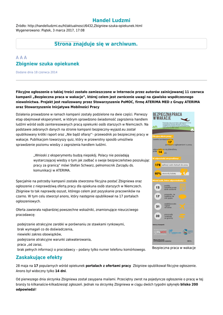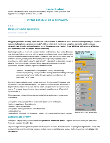 Handel Ludzmi Źródło: http://handelludzmi.eu/hl/aktualnosci/6432,Zbigniew-szuka-opiekunek.html Wygenerowano: Piątek, 3 marca 2017, 17:08 Strona znajduje się w archiwum. AAA Zbigniew szuka opiekunek Dodane dnia 18 czerwca 2014 Fikcyjne ogłoszenie o takiej treści zostało zamieszczone w Internecie przez autorów zainicjowanej 11 czerwca kampanii „Bezpieczna praca w wakacje”, której celem jest zwrócenie uwagi na zjawisko współczesnego niewolnictwa. Projekt jest realizowany przez Stowarzyszenie PoMOC, firmę ATERIMA MED z Grupy ATERIMA oraz Stowarzyszenie Inicjatywa Mobilności Pracy Działania prowadzone w ramach kampanii zostały podzielone na dwie części. Pierwszy etap obejmował eksperyment, w którym sprawdzono świadomość zagrożenia handlem ludźmi wśród osób zainteresowanych pracą opiekunki osób starszych w Niemczech. Na podstawie zebranych danych na stronie kampanii bezpieczny-wyjazd.eu został opublikowany krótki raport oraz „Nie bądź ofiarą!”- przewodnik po bezpiecznej pracy w wakacje. Publikacjom towarzyszy quiz, który w przewrotny sposób umożliwia sprawdzenie poziomu wiedzy z zagrożenia handlem ludźmi. „Wnioski z eksperymentu budzą niepokój. Polacy nie posiadają wystarczającej wiedzy o tym jak zadbać o swoje bezpieczeństwo poszukując pracy za granicą” mówi Stefan Schwarz, pełnomocnik Zarządu ds. komunikacji w ATERIMA. Specjalnie na potrzeby kampanii została stworzona fikcyjna postać Zbigniewa oraz ogłoszenie z nieprawdziwą ofertą pracy dla opiekuna osób starszych w Niemczech. Zbigniew to tak naprawdę oszust, którego celem jest pozyskanie pracowników na czarno. W tym celu stworzył anons, który następnie opublikował na 17 portalach ogłoszeniowych. Oferta zawierała najbardziej powszechne wskaźniki, znamionujące nieuczciwego pracodawcę: podejrzanie atrakcyjne zarobki w porównaniu ze stawkami rynkowymi, brak wymagań co do doświadczenia, niewielki zakres obowiązków, podejrzanie atrakcyjne warunki zakwaterowania, praca „od zaraz, brak pełnych informacji o pracodawcy – podany tylko numer telefonu komórkowego. Bezpieczna praca w wakacje Zaskakujące efekty 28 maja na 17 popularnych wśród opiekunek portalach z ofertami pracy Zbigniew opublikował fikcyjne ogłoszenie. Anons był widoczny tylko 14 dni. Od pierwszego dnia skrzynka Zbigniewa został zasypana mailami. Przeciętny zwrot na pojedyncze ogłoszenie o pracę w tej branży to kilkanaście-kilkadziesiąt zgłoszeń. Jednak na skrzynkę Zbigniewa w ciągu dwóch tygodni spłynęło blisko 200 odpowiedzi! Efekty eksperymentu: 178 zgłoszeń od osób zainteresowanych podjęciem pracy, aż 97% aplikujących to kobiety, 18% osób pracowało już za granicą, tylko 16% chętnych poprosiło o dodatkowe informacje, 12% aplikujących wyraziło chęć pracy od zaraz, 10% kandydatów nie znało zupełnie języka niemieckiego, 6% zgłoszeń zawierało pełne dane osobowe takie jak datę urodzenia, adres zamieszkania. Zbigniew górą? – wnioski Tylko czterem osobom fikcyjne ogłoszenie wydało się podejrzane, co zaznaczyły w przesłanej wiadomości. Mimo to, również tych czworo zdecydowało zgłosić chęć podjęcia zatrudnienia za granicą. Ponadto 18% chętnych, miało do czynienia z ofertami i warunkami pracy i pomimo znajomości realiów, zaaplikowało na ogłoszenie. 18 osób wysyłając zgłoszenie było pewnych, że poradzi sobie z opieką nad obcokrajowcem pomimo nieznajomości języka. 12% osób było gotowych do wyjazdu od zaraz co sugeruje, że mogłyby zgodzić się na podpisanie ewentualnej umowy dopiero w Niemczech. „Poszukiwanie pracy warto rozpocząć od kontaktu z rzetelną agencją zatrudnienia, która figuruje w Krajowym Rejestrze Agencji Zatrudnienia, dostarcza wymagane prawem dokumenty, zaświadczenia i formularze A1, opłaca składki” – tłumaczy Stefan Schwarz, pełnomocnik Zarządu ds. komunikacji w ATERIMA. „Mam nadzieję, że akcje takie jak ta podniosą świadomość osób wyjeżdżających zarobkowo za granicę” – dodaje. Strona kampanii „Bezpieczna praca w wakacje” Tagi: kampanie społeczne, Handel ludźmi, praca przymusowa podziel się treścią: wersja pdf drukuj