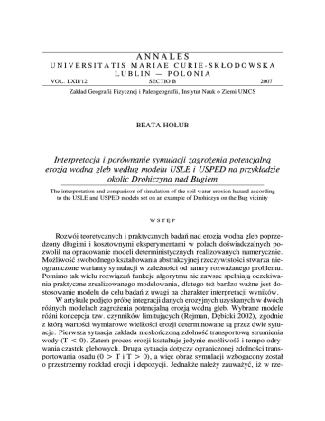 INTERPRETACJA I PORÓWNANIE SYMULACJI ZAGRO¯ENIA POTENCJALN¥ EROZJ¥... 253 ANNALES UNIVERSITATIS MARIAE CURIE-SK£ODOWSKA LUBLIN POLONIA VOL. LXII/12 SECTIO B 2007 Zak³ad Geografii Fizycznej i Paleogeografii, Instytut Nauk o Ziemi UMCS BEATA HO£UB Interpretacja i porównanie symulacji zagro¿enia potencjaln¹ erozj¹ wodn¹ gleb wed³ug modelu USLE i USPED na przyk³adzie okolic Drohiczyna nad Bugiem The interpretation and comparison of simulation of the soil water erosion hazard according to the USLE and USPED models set on an example of Drohiczyn on the Bug vicinity WSTÊP Rozwój teoretycznych i praktycznych badañ nad erozj¹ wodn¹ gleb poprzedzony d³ugimi i kosztownymi eksperymentami w polach dowiadczalnych pozwoli³ na opracowanie modeli deterministycznych realizowanych numerycznie. Mo¿liwoæ swobodnego kszta³towania abstrakcyjnej rzeczywistoci stwarza nieograniczone warianty symulacji w zale¿noci od natury rozwa¿anego problemu. Pomimo tak wielu rozwi¹zañ funkcje algorytmu nie zawsze spe³niaj¹ oczekiwania praktyczne zrealizowanego modelowania, dlatego te¿ bardzo wa¿ne jest dostosowanie modelu do celu badañ z uwagi na charakter interpretacji wyników. W artykule podjêto próbê integracji danych erozyjnych uzyskanych w dwóch ró¿nych modelach zagro¿enia potencjaln¹ erozj¹ wodn¹ gleb. Wybrane modele ró¿ni koncepcja tzw. czynników limituj¹cych (Rejman, Dêbicki 2002), zgodnie z któr¹ wartoci wymiarowe wielkoci erozji determinowane s¹ przez dwie sytuacje. Pierwsza sytuacja zak³ada nieskoñczon¹ zdolnoæ transportow¹ strumienia wody (T < 0). Zatem proces erozji kszta³tuje jedynie mo¿liwoæ i tempo odrywania cz¹stek glebowych. Druga sytuacja dotyczy ograniczonej zdolnoci transportowania osadu (0 > T i T > 0), a wiêc obraz symulacji wzbogacony zosta³ o przestrzenny rozk³ad erozji i depozycji. Jednak¿e nale¿y zauwa¿yæ, i¿ w rze- 254 BEATA HO£UB czywistoci oba czynniki sk³adaj¹ siê na warunki imituj¹ce dzia³anie procesu erozji wodnej gleb. Ostateczne wnioski powinny zatem ³¹czyæ w sobie syntezê myli p³yn¹cych z analizy obu modeli. Celem opracowania jest przeprowadzenie symulacji potencjalnej straty gleby w wyniku erozji wodnej zachodz¹cej podczas sp³ywu powierzchniowego i oddzielnie sp³ywu linijnego oraz w warunkach urednionych, tj. bez wyranej dominacji jednej formy erozji nad drug¹. Praca ta ma charakter rozprawy metodycznej a porównanie trzech zrealizowanych modeli pomo¿e wskazaæ na zró¿nicowanie otrzymanych wyników w stosunku do wybranych wartoci zmiennych w obu analizowanych algorytmach. Podrzêdnym celem jest wskazanie na zastosowanie GIS-u jako narzêdzia do opracowania modelu zagro¿enia erozj¹ wodn¹ gleb i graficznego zobrazowania wyników. CHARAKTERYSTYKA OBSZARU TESTOWEGO Badany obszar po³o¿ony jest we wschodniej czêci Polski i obejmuje odcinek doliny Bugu wraz z przylegaj¹c¹ wysoczyzn¹ morenow¹ w granicach gminy Drohiczyn. Zgodnie z podzia³em fizycznogeograficznym Polski wg Kondrackiego (2000) opisywany obszar nale¿y do dwóch mezoregionów: Podlaskiego Prze³omu Bugu bêd¹cego czêci¹ Niziny Po³udniowopodlaskiej oraz Wysoczyzny Drohickiej, która zamyka od po³udnia Nizinê Pó³nocnopodlask¹ (ryc. 1). Ryc. 1. Po³o¿enie obszaru badañ na tle podzia³u fizycznogeograficznego (Kondracki 2000) Fig. 1. Localization of research area according to physico-geographical division of Poland (Kondracki 2000) INTERPRETACJA I PORÓWNANIE SYMULACJI ZAGRO¯ENIA POTENCJALN¥ EROZJ¥... 255 W krajobrazie morfologicznym obszaru badañ dominuje wysoczyzna morenowa zbudowana g³ównie z piasków gliniastych, któr¹ rozcinaj¹ rozwiniête systemy dolinek erozyjno-denudacyjnych (ryc. 2). Na stokach wysoczyzny zalegaj¹ piaski rednie (Mapa glebowo-rolnicza...). Pó³nocne zbocze doliny Bugu o ekspozycji po³udniowej podcinane jest przez meandruj¹ce koryto rzeki. W tej czêci wystêpuj¹ najwiêksze spadki terenu siêgaj¹ce 30% (ryc. 3). rednie wysokoci wzglêdne osi¹gaj¹ w strefie krawêdziowej doliny 22 m, a na wysoczynie malej¹ od 7 do 3 m (Ho³ub 2006). Dno doliny Bugu tworzy zespó³ vistuliañsko-holoceñskich akumulacyjnych teras rzecznych, które w granicach obszaru badañ nie s¹ u¿ytkowane rolniczo. Ryc. 2. Szkic geomorfologiczny doliny Bugu w okolicach Drohiczyna: Terasy holoceñskie 1) 0 1 m, 2) 12,5 m, 3) 2,54,5 m; 4) Terasa plejstoceñska (4,510,5 m); 5) wydmy; 6) wysoczyzna morenowa; 7) dolinki erozyjno-denudacyjne; 8) krawêdzie erozyjne teras (Ho³ub 2006) Fig. 2. The geomorphological sketch of the Bug river valley in the vicinity of Drohiczyn: Holocene terrace 1) 01 m, 2) 12,5 m, 3) 2,54,5 m, 4) Pleistocene terrace (4,510,5 m), 5) dunes, 6) moraine highplain; 7) denudational-erosional valleys; 8) escarpments of terraces (Ho³ub 2006) Gleby badanego terenu zosta³y wykszta³cone z utworów czwartorzêdowych o genezie glacjalnej i fluwioglacjalnej. Pod wzglêdem typologicznym najwiêksze powierzchnie zajmuj¹ gleby bielicowe i p³owe wytworzone z glin zwa³owych oraz z piasków naglinowych i nai³owych. Du¿e i zwarte kompleksy tworz¹ one w obszarach pozadolinnych na terenie wysoczyzny polodowcowej. Gleby brunatne wystêpuj¹ w czêci zachodniej badanego terenu. Na obszarze akumulacyjnej terasy nadzalewowej dominuj¹ gleby torfowe, rzadziej gleby bielicowe wytworzone z piasków lunych (ryc. 4A). Na tle rolniczej przydatnoci gleb wród gruntów ornych dominuj¹ gleby kompleksu pszennego dobrego i ¿ytniego bardzo dobrego. U¿ytki zielone zajmuj¹ gleby zaliczone do kompleksu u¿ytków 256 BEATA HO£UB Ryc. 3. Mapa spadków terenu Fig. 3. Slope map zielonych rednich (Mapa glebowo-rolnicza...). Przestrzenne zró¿nicowanie klas bonitacyjnych u¿ytków rolnych nawi¹zuje do rozmieszczenia typologicznego gleb i adekwatnie wi¹¿e siê z obrazem rolniczej przydatnoci utworów glebowych. W ogólnej strukturze dominuj¹ gleby s³abej jakoci, czyli klasy IV. Najwiêksze kompleksy lene wystêpuj¹ w czêc