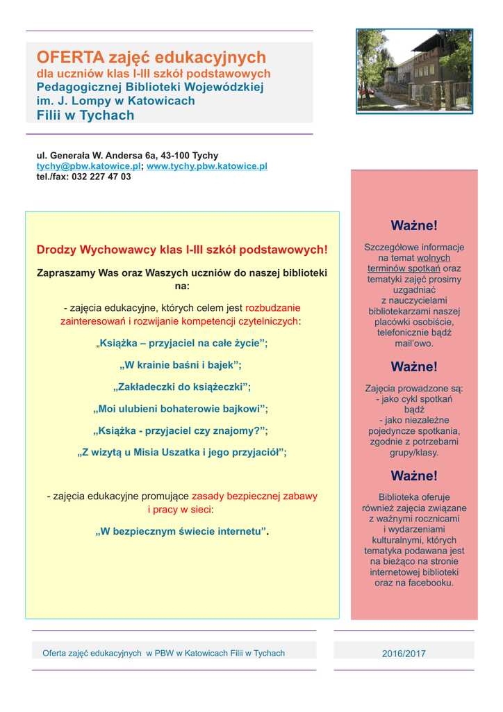 OFERTA zajęć edukacyjnych dla uczniów klas I-III szkół podstawowych Pedagogicznej Biblioteki Wojewódzkiej im. J. Lompy w Katowicach Filii w Tychach ul. Generała W. Andersa 6a, 43-100 Tychy [email protected]; www.tychy.pbw.katowice.pl tel./fax: 032 227 47 03 Ważne! „Książka – przyjaciel na całe życie”; Szczegółowe informacje na temat wolnych terminów spotkań oraz tematyki zajęć prosimy uzgadniać z nauczycielami bibliotekarzami naszej placówki osobiście, telefonicznie bądź mail’owo. „W krainie baśni i bajek”; Ważne! „Zakładeczki do książeczki”; Zajęcia prowadzone są: - jako cykl spotkań bądź - jako niezależne pojedyncze spotkania, zgodnie z potrzebami grupy/klasy. Drodzy Wychowawcy klas I-III szkół podstawowych! Zapraszamy Was oraz Waszych uczniów do naszej biblioteki na: - zajęcia edukacyjne, których celem jest rozbudzanie zainteresowań i rozwijanie kompetencji czytelniczych: „Moi ulubieni bohaterowie bajkowi”; „Książka - przyjaciel czy znajomy?”; „Z wizytą u Misia Uszatka i jego przyjaciół”; Ważne! - zajęcia edukacyjne promujące zasady bezpiecznej zabawy i pracy w sieci: „W bezpiecznym świecie internetu”. Oferta zajęć edukacyjnych w PBW w Katowicach Filii w Tychach Biblioteka oferuje również zajęcia związane z ważnymi rocznicami i wydarzeniami kulturalnymi, których tematyka podawana jest na bieżąco na stronie internetowej biblioteki oraz na facebooku. 2016/2017 - cykl zajęć psychoedukacyjnych z elementami arteterapii kształtujących postawy i wprowadzających w świat wartości tj.: uczciwość, odpowiedzialność, szacunku, sprawiedliwość, w oparciu o właściwie dobraną literaturę dziecięcą: „Budujemy Wyspę Szacunku”; „Wchodzimy na Górę Odwagi”; „Odwiedzamy Łąkę Solidarności”; „Sprzątamy Las Sprawiedliwości”; „Spacerujemy nad Rzeką Uczciwości”; „Podróżujemy po Morzu Przyjaźni”; „Odpoczywamy nad Jeziorem Odpowiedzialności”. - zajęcia, których głównym zadaniem jest wspomaganie rozwoju umiejętności społeczno-emocjonalnych uczniów rozwijanie samoświadomości, samoakceptacji, wzmacnianie poczucia własnej wartości: „Co lusterko mówi o mnie?”; „Uwierz w siebie” „Bez złości mamy więcej radości”; „Uwaga! Pani Złość nadchodzi!”; „Jak rozwijać swoją pamięć i uwagę, czyli zabawy i ćwiczenia pomagające w poprawie koncentracji”; Dodatkowe zajęcia edukacyjne związane z ważnymi rocznicami i wydarzeniami kulturalnymi (przykładowe propozycje): Wrzesień: “Tychy – moje miasto” Listopad: “Łąka Życzliwości” Grudzień: “I Ty możesz być św. Mikołajem” Styczeń: “Historia kartki świątecznej” Luty: “Internet – przyjaciel?” Marzec: “Wyspy Talentów” Maj: “Z wizytą w krajach Unii Europejskiej” Czerwiec: “Bezpieczne wakacje”” „Czy umiemy odmawiać?”; „Nie szata zdobi człowieka”; „Każdy ma swojego stracha”; „I Ty możesz by dobrym kolegą”; „Brzydkie kaczątka są wśród nas”; „Wyspa Zdolności”; „Plastuś mówi - nie”; „Wiem, co czuje …” Oferta zajęć edukacyjnych w PBW w Katowicach Filii w Tychach 2016/2017