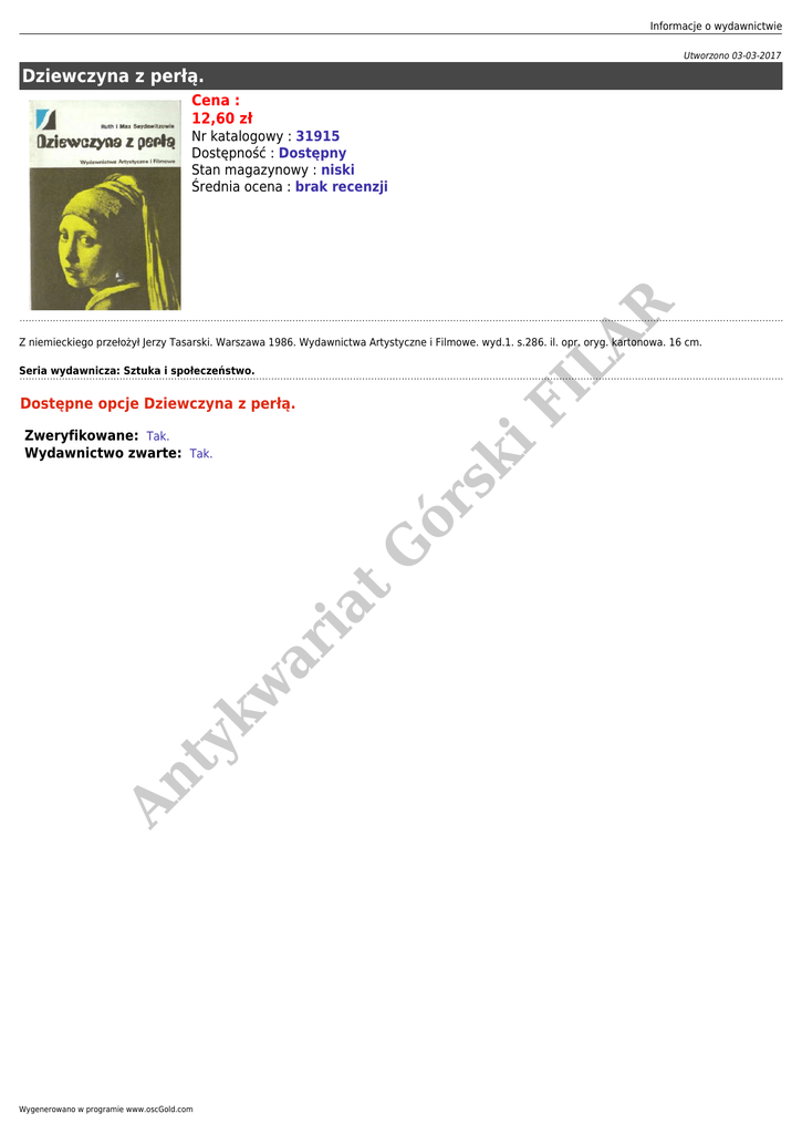 Informacje o wydawnictwie Utworzono 03-03-2017 Dziewczyna z perłą. Cena : 12,60 zł LA R Nr katalogowy : 31915 Dostępność : Dostępny Stan magazynowy : niski Średnia ocena : brak recenzji Z niemieckiego przełożył Jerzy Tasarski. Warszawa 1986. Wydawnictwa Artystyczne i Filmowe. wyd.1. s.286. il. opr. oryg. kartonowa. 16 cm. FI Seria wydawnicza: Sztuka i społeczeństwo. Dostępne opcje Dziewczyna z perłą. An ty k w ar ia t G ór sk i Zweryfikowane: Tak. Wydawnictwo zwarte: Tak. Wygenerowano w programie www.oscGold.com