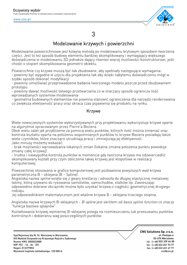 3 Modelowanie krzywych i powierzchni Modelowanie powierzchniowe jest kolejną metodą po modelowaniu bryłowym sposobem tworzenia części. Jest to też sposób budowy elementu bardziej skomplikowany i wymagający większego doświadczenia w modelowaniu 3D jednakże dający również więcej możliwości konstruktorowi, jeśli chodzi o stopień skomplikowania geometrii obiektu. Powierzchnie czy krzywe muszą być tak zbudowane, aby spełniały następujące wymagania: - powinny być wygodne w użyciu dla projektanta tak aby dzięki nabytemu doświadczeniu mógł w szybki sposób dokonać modyfikacji - powinny umożliwiać przeprowadzenie badania tworzonego modelu jeszcze przed zbudowaniem prototypu - powinny dawać możliwość łatwego przetwarzania co w znaczący sposób ogranicza ilość wprowadzanych systemów modelowania - geometria budowanych elementów nie powinna stanowić ograniczenia dla narzędzi renderowania co zwiększa efektywność pracy oraz skraca czas pojawienia się produktu na rynku. Krzywe Wiele nowoczesnych systemów wykorzystywanych przy projektowaniu wykorzystuje krzywe oparte na algorytmie opracowanym przez Pierre’a Beziera. Obok wielu zalet jak przybliżenie za pomocą wielu punktów, których ilość można zmieniać oraz kontrola kształtu oparta na położeniu wspomnianych punktów to krzywe Beziera posiadają także wiele czynników, które znacząco utrudniają pracę i zmniejszają jej efektywność. Jako minusy możemy wskazać: - brak możliwości wprowadzania lokalnych zmian (lokalna zmiana położenia punktu powoduje zmiany całej krzywej) - trudna i niewygodna kontrola punktów w momencie gdy tworzona krzywa ma odzwierciedlić skomplikowany kształt przy czym obliczenie takiej krzywej jest kłopotliwe w realizacji komputerowej. Powszechniej stosowana w grafice komputerowej jest pozbawiona powyższych wad krzywa parametryczna B – sklejana (B – Spline). Angielska nazwa spline wzięła się z gwary kreślarzy i odnosiła do długiej elastycznej metalowej taśmy, którą używano do rysowania samolotów, samochodów, statków itp. Zawieszając odpowiednio dobrane obciążniki można było uzyskać krzywą o ciągłości geometrycznej drugiego rodzaju. Jej odpowiednikiem matematycznym jest właśnie krzywa B – sklejana trzeciego stopnia. Angielska nazwa krzywych B-sklejanych - B-spline jest skrótem od basis spline function co znaczy "funkcja bazowa splajnów". Kształtowanie krzywej wymiernej B-sklejanej polega na rozmieszczaniu lub przesuwaniu punktów kontrolnych i dobieraniu wag poszczególnych punktów. Można też manipulować węzłami użytymi do określenia funkcji bazowych. Rys.1. Lokalna kontrola kształtu krzywej B- Sklejanej z grzebieniem krzywizny (SolidWorks 2009) Do określenia wymiernych krzywych B – sklejanych używamy nazwy NURBS co z angielskiego natomiast oznacza Non – Uniform Rational B – Spline. Skrót Non - Uniform odwołuje się do cechy krzywej B – Sklejanej, która oznacza, że punkty nie muszą być rozmieszczone równomiernie. Właściwości krzywej typu NURBS: - jeśli wszystkie wagi są równe pewnej stałej różnej od 0, to krzywa wymierna jest identyczna z krzywą wielomianową; - zmiana wszystkich wag polegająca na przenożeniu ich przez pewną stałą różną od 0 nie powoduje żadnych zmian geometrycznych krzywej; - relacja między punktami kontrolnymi a wymierną krzywą B-sklejaną jest niezmiennicza afinicznie, co oznacza, że obraz punktów kontrolnych w przekształceniu afinicznym określa obraz krzywej w tym przekształceniu; - kontrola kształtu za pomocą punktów kontrolnych jest ściśle lokalna, podobnie jak efekt zmiany wagi jest ograniczony tylko do fragmentu krzywej; W wielu programach komputerowych, mimo że istnieje możliwość tworzenia krzywych NURBS, zastrzeżona jest zmiana wag (wagi wszystkich punktów są określone na poziomie 1). Wobec tego w rzeczywistości krzywe te są krzywymi wielomianowymi, a nie wymiernymi. Rodzaje powierzchni Powierzchnie płaskie (planarne) – Najprostszy rodzaj powierzchni utworzona z wyciągnięcia linii bądź poprzez stworzenie powierzchni ograniczonej szkicem 2D. Powierzchnie płaskie mogą posłużyć jako baza do utworzenia kolejnych szkiców 2D. Rys.2. Powierzchnia Planarna Powierzchnie utworzone poprzez operację wyciągnięcia – bazą wyjściową dla takiej operacji mogą być wyższego rzędu jak chociażby B - Spline. Powierzchnia tworzona jest poprzez wyciągnięcie krzywej w zadanym kierunku prostopadłym do płaszczyzny szkicu. Rys.3. Powierzchnia utworzona przez wyciągnięcie Powierzchnie utworzone poprzez obrót – powierzchnie tego typu tworzone poprzez obrót względem ustalonej prostej stanowiącej oś obrotu dla dowolnie zdefiniowanej krzywej. Obrót może być wykonany o dowolną wartość niekoniecznie 360st. Rys.4. Powierzchnia utworzona przez obrót Powierzchnia utworzona poprzez operację wyciągnięcia po ścieżce – taka powierzchnia budowana jest na podstawie szkiców, z których jeden stanowi profil zaś drugi pełni rolę ścieżki (krzywej prowadzącej) do wyciągnięcia. Rys.5. Powierzchnia utworzona przez wyciągnięcie po ścieżce Powierzchnia utworzona poprzez operację wyciągnięcia po profilach – ten rodzaj powierzchni jest budowany poprzez rozciągnięcie na kolejnych profilach, które definiują przekrój obiektu w danym miejscu. Rys.6. Powierzchnia utworzona przez wyciągnięcie po profilach Powierzchnia swobodna – jest to powierzchnia krzywokreślna zbudowana na bazie zadanego zbioru punktów lub krzywych. Tworzona jest przez zmianę położenia punktu bądź punktów należących do zadanej powierzchni za pomocą swobodnego przeciągania. Powierzchnia typu Beziera czy NURBS (w zależności od oprogramowania) jest automatycznie generowana przez system CAD. Rys.7. Powierzchnia swobodna