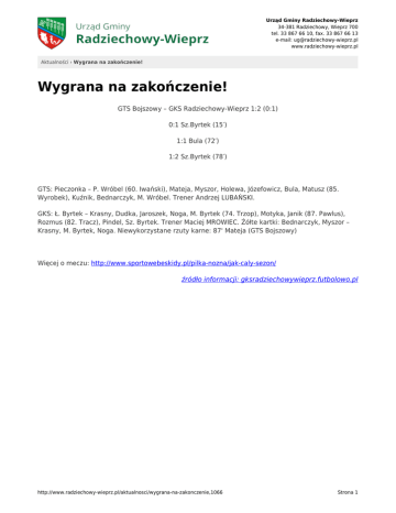Urząd Gminy Radziechowy-Wieprz 34-381 Radziechowy, Wieprz 700 tel. 33 867 66 10, fax. 33 867 66 13 e-mail: [email protected] www.radziechowy-wieprz.pl Aktualności › Wygrana na zakończenie! Wygrana na zakończenie! GTS Bojszowy – GKS Radziechowy-Wieprz 1:2 (0:1) 0:1 Sz.Byrtek (15′) 1:1 Bula (72′) 1:2 Sz.Byrtek (78′) GTS: Pieczonka – P. Wróbel (60. Iwański), Mateja, Myszor, Holewa, Józefowicz, Bula, Matusz (85. Wyrobek), Kuźnik, Bednarczyk, M. Wróbel. Trener Andrzej LUBAŃSKI. GKS: Ł. Byrtek – Krasny, Dudka, Jaroszek, Noga, M. Byrtek (74. Trzop), Motyka, Janik (87. Pawlus), Rozmus (82. Tracz), Pindel, Sz. Byrtek. Trener Maciej MROWIEC. Żółte kartki: Bednarczyk, Myszor – Krasny, M. Byrtek, Noga. Niewykorzystane rzuty karne: 87' Mateja (GTS Bojszowy) Więcej o meczu: http://www.sportowebeskidy.pl/pilka-nozna/jak-caly-sezon/ źródło informacji: gksradziechowywieprz.futbolowo.pl http://www.radziechowy-wieprz.pl/aktualnosci/wygrana-na-zakonczenie,1066 Strona 1