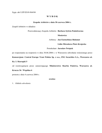 Sygn. akt UZP/ZO/0-964/04 WYROK Zespołu Arbitrów z dnia 30 czerwca 2004 r. Zespół Arbitrów w składzie: Przewodniczący Zespołu Arbitrów Barbara Sylwia PodedwornaMosiewicz Arbitrzy: Jan Eustachiusz Bałamut Lidia Mirosława Piotr-Krajecka Protokolant Jarosław Świątek po rozpoznaniu na rozprawie w dniu 30.06.2004 r. w Warszawie odwołania wniesionego przez Konsorcjum: Central Europe Trust Polska Sp. z o.o., ING Securities S.A., Warszawa ul. Ks. I. Skorupki 5 od rozstrzygnięcia przez zamawiającego Ministerstwo Skarbu Państwa, Warszawa ul. Krucza 36 / Wspólna 6 protestu z dnia 4 czerwca 2004 r. orzeka: 1. Oddala odwołanie. 2. Kosztami postępowania obciąża Konsorcjum: Central Europe Trust Polska Sp. z o.o., ING Securities S.A., Warszawa ul. Ks. I. Skorupki 5 i zasądza na rzecz: 1) Urzędu Zamówień Publicznych koszty postępowania w kwocie 5 072 zł 48 gr (słownie: pięć tysięcy siedemdziesiąt dwa złote czterdzieści osiem groszy) 2) xxx koszty postępowania w kwocie 0 zł 00 gr (słownie: xxx). 3. Na poczet kosztów postępowania orzeczonych na rzecz Urzędu Zamówień Publicznych wg pkt 2.1) zalicza kwotę uiszczonego wpisu przez Konsorcjum: Central Europe Trust Polska Sp. z o.o., ING Securities S.A., Warszawa ul. Ks. I. Skorupki 5 i nakazuje: 1) xxx dokonanie wpłaty kwoty 0 zł 00 gr (słownie: xxx) na rachunek środków specjalnych Urzędu Zamówień Publicznych nr xxx w terminie 7 dni od daty doręczenia wyroku 2) Urzędowi Zamówień Publicznych zwrot z rachunku środków specjalnych na rzecz Konsorcjum: Central Europe Trust Polska Sp. z o.o., ING Securities S.A., Warszawa ul. Ks. I. Skorupki 5 kwoty 513 zł 52 gr (słownie: pięćset trzynaście złotych pięćdziesiąt dwa grosze). 4. Uzasadnienie Strona 2 z 6 Zamawiający - Ministerstwo Skarbu Państwa wszczęło postępowanie przetargowe w trybie przetargu nieograniczonego na wybór Doradcy MSP przy prywatyzacji Spółki Grupa Energetyczna ENEA S.A. Zamawiający po zapoznaniu się ze złożonymi przez Oferentów ofertami wykluczył z postępowania Odwołującego się: ING Securities S.A. oraz Central Europe Trust Polska Sp. z o.o. na podstawie art. 19 ust. 1 pkt 8 ustawy z dnia 10 czerwca 1994 r. o zamówieniach publicznych (Dz. U. Nr 72, poz. 664 z późn. zm.) w związku z pkt 4.4 specyfikacji istotnych warunków zamówienia (siwz). Zamawiający uznał, że dokumenty złożone w ofercie przez Odwołującego się, a dotyczące posiadania przez CET Polska Sp. z o.o. pełnomocnika ds. ochrony informacji niejawnych świadczą o zatrudnieniu pełnomocnika na podstawie umowy zlecenia, a zatem nie spełnia on wymogów określonych w ustawie z dnia 22 stycznia 1999 r. o ochronie informacji niejawnych (Dz.U. Nr 11, poz. 95 z późn. zm.). Odwołujący nie zgodził się z taki stanowiskiem i złożył do Zamawiającego w dniu 4 czerwca 2004 r. protest, w którym zarzucił Zamawiającemu naruszenie art. 16, art. 19 ust. 1 pkt 8 oraz art. 24 ust. 1 ustawy o zamówieniach publicznych, poprzez nieprawidłową interpretację ustawy o ochronie informacji niejawnych w zakresie sposobu zatrudnienia pełnomocnika ds. ochrony informacji niejawnych. Zamawiający protest oddalił podtrzymując swoje stanowisko zawarte w uzasadnieniu pisma informującego Odwołującego o wykluczeniu z postępowania. Od rozstrzygnięcia protestu Odwołujący się złożył w ustawowym terminie odwołanie do Prezesa Urzędu Zamówień Publicznych w Warszawie, w którym podtrzymał zarzuty podniesione w proteście. Zespół Arbitrów przystępując do rozpatrzenia odwołania uznał, że kluczową kwestią dla jego rozstrzygnięcia jest ustalenie czy Odwołujący posiada pełnomocnika ds. ochrony informacji niejawnych spełniającego wymogi przywołanej wyżej ustawy o ochronie informacji niejawnych oraz czy załączył wymagane siwz dokumenty potwierdzające tę okoliczność. Strona 3 z 6 W wyniku szczegółowej analizy dokumentów przetargowych oraz po wysłuchaniu wyjaśnień stron złożonych na rozprawie Zespół Arbitrów stwierdził, że odwołanie nie zasługuje na uwzględnienie. W pkt 4.4 siwz Zamawiający wyraźnie wskazał jakich dokumentów oczekuje od wykonawców na potwierdzenie spełnienia warunku posiadania uprawnień pełnomocnika ds. ochrony informacji niejawnych. Tymi dokumentami miały być kserokopia poświadczenia bezpieczeństwa i zaświadczenie o odbyciu przeszkolenia przez służbę ochrony państwa oraz dokumenty o powołaniu lub powierzeniu tej osobie takiej funkcji. Odwołujący do swojej oferty załączył na dowód spełnienia tych wymagań umowę zlecenie zawartą w dniu 01.03.2004r. z panem Andrzejem Chmielewskim. W umowie tej powierzył mu wykonanie trzech konkretnych czynności określonych w pkt 1 umowy. Zakres tych czynności nie wyczerpuje wszystkich obowiązków pełnomocnika ds. ochrony informacji niejawnych wynikających przynajmniej z art. 18 ustawy o ochronie informacji niejawnych. Z treści umowy nie wynika aby Odwołujący powołał lub powierzył zleceniobiorcy pełnienie funkcji pełnomocnika ds. ochrony informacji niejawnych. Należy przy tym podkreślić, że Odwołujący nie załączył do oferty dokumentu pod nazwą „Opis stanowiska pełnomocnika ds. ochrony informacji niejawnych”, który to dokument potwierdziłby, że panu Chmielewskiemu powierzono tę funkcję. Ponadto w umowie nie odwołano się do ustawy o ochronie informacji niejawnych. Analizując inne oferty Zespół Arbitrów stwierdził, że znajdują się w nich dokumenty o powołaniu lub powierzeniu funkcji pełnomocnika ds. ochrony informacji niejawnych konkretnym osobom (dowód oferta HSBC k. 181, oferta PKO BP k. 294, oferta PeKaO S.A. k. 277). Świadczy to o tym, że sformułowania siwz u innych oferentów nie budziły wątpliwości co do formy i treści dokumentów w zakresie wymaganym w pkt 4.4 siwz. Strona 4 z 6 W świetle powyższego należy stwierdzić, że Odwołujący nie załączył do oferty dokumentu wymaganego w pkt