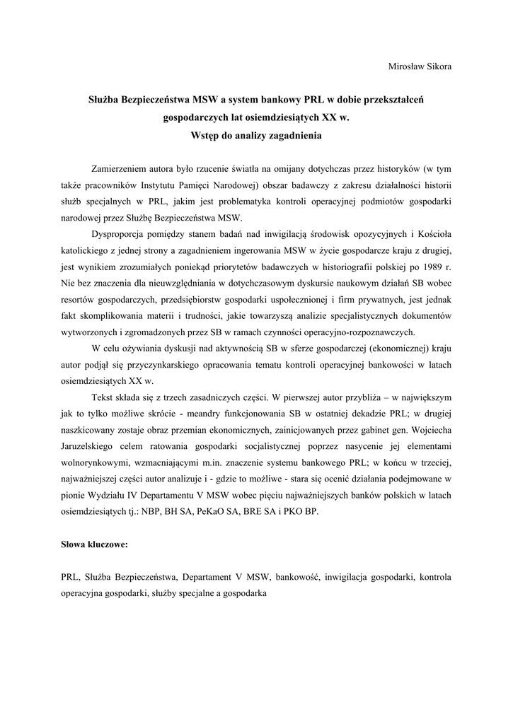 Mirosław Sikora Służba Bezpieczeństwa MSW a system bankowy PRL w dobie przekształceń gospodarczych lat osiemdziesiątych XX w. Wstęp do analizy zagadnienia Zamierzeniem autora było rzucenie światła na omijany dotychczas przez historyków (w tym także pracowników Instytutu Pamięci Narodowej) obszar badawczy z zakresu działalności historii służb specjalnych w PRL, jakim jest problematyka kontroli operacyjnej podmiotów gospodarki narodowej przez Służbę Bezpieczeństwa MSW. Dysproporcja pomiędzy stanem badań nad inwigilacją środowisk opozycyjnych i Kościoła katolickiego z jednej strony a zagadnieniem ingerowania MSW w życie gospodarcze kraju z drugiej, jest wynikiem zrozumiałych poniekąd priorytetów badawczych w historiografii polskiej po 1989 r. Nie bez znaczenia dla nieuwzględniania w dotychczasowym dyskursie naukowym działań SB wobec resortów gospodarczych, przedsiębiorstw gospodarki uspołecznionej i firm prywatnych, jest jednak fakt skomplikowania materii i trudności, jakie towarzyszą analizie specjalistycznych dokumentów wytworzonych i zgromadzonych przez SB w ramach czynności operacyjno-rozpoznawczych. W celu ożywiania dyskusji nad aktywnością SB w sferze gospodarczej (ekonomicznej) kraju autor podjął się przyczynkarskiego opracowania tematu kontroli operacyjnej bankowości w latach osiemdziesiątych XX w. Tekst składa się z trzech zasadniczych części. W pierwszej autor przybliża – w największym jak to tylko możliwe skrócie - meandry funkcjonowania SB w ostatniej dekadzie PRL; w drugiej naszkicowany zostaje obraz przemian ekonomicznych, zainicjowanych przez gabinet gen. Wojciecha Jaruzelskiego celem ratowania gospodarki socjalistycznej poprzez nasycenie jej elementami wolnorynkowymi, wzmacniającymi m.in. znaczenie systemu bankowego PRL; w końcu w trzeciej, najważniejszej części autor analizuje i - gdzie to możliwe - stara się ocenić działania podejmowane w pionie Wydziału IV Departamentu V MSW wobec pięciu najważniejszych banków polskich w latach osiemdziesiątych tj.: NBP, BH SA, PeKaO SA, BRE SA i PKO BP. Słowa kluczowe: PRL, Służba Bezpieczeństwa, Departament V MSW, bankowość, inwigilacja gospodarki, kontrola operacyjna gospodarki, służby specjalne a gospodarka