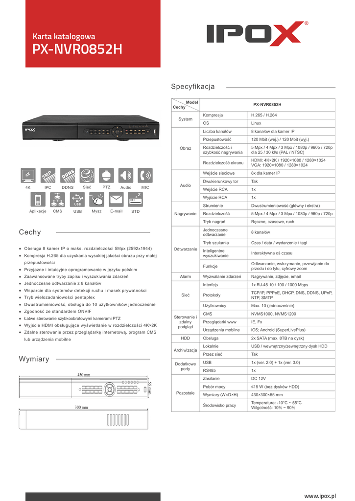 Karta katalogowa PX-NVR0852H Specyfikacja Model PX-NVR0852H Cechy System Obraz 4K 4K 5M P DDNS IPC Aplikacje CMS Sieć USB PTZ Mysz MIC Audio E-mail STD Audio Nagrywanie Cechy Obsługa 8 kamer IP o maks. rozdzielczości 5Mpx (2592x1944) Odtwarzanie Kompresja H.265 dla uzyskania wysokiej jakości obrazu przy małej przepustowości Przyjazne i intuicyjne oprogramowanie w języku polskim Zaawansowane tryby zapisu i wyszukiwania zdarzeń Alarm Jednoczesne odtwarzanie z 8 kanałów Wsparcie dla systemów detekcji ruchu i masek prywatności Tryb wielozadaniowości pentaplex Sieć Dwustrumieniowość, obsługa do 10 użytkowników jednocześnie Zgodność ze standardem ONVIF Łatwe sterowanie szybkoobrotowymi kamerami PTZ Wyjście HDMI obsługujące wyświetlanie w rozdzielczości 4K×2K Sterowanie i zdalny podgląd Zdalne sterowanie przez przeglądarkę internetową, program CMS lub urządzenia mobilne HDD Archiwizacja Wymiary Dodatkowe porty Pozostałe Kompresja H.265 / H.264 OS Linux Liczba kanałów 8 kanałów dla kamer IP Przepustowość 120 Mbit (wej.) / 120 Mbit (wyj.) Rozdzielczość i szybkość nagrywania 5 Mpx / 4 Mpx / 3 Mpx / 1080p / 960p / 720p dla 25 / 30 kl/s (PAL / NTSC) Rozdzielczość ekranu HDMI: 4K×2K / 1920×1080 / 1280×1024 VGA: 1920×1080 / 1280×1024 Wejście sieciowe 8x dla kamer IP Dwukierunkowy tor Tak Wejście RCA 1x Wyjście RCA 1x Strumienie Dwustrumieniowość (główny i ekstra) Rozdzielczość 5 Mpx / 4 Mpx / 3 Mpx / 1080p / 960p / 720p Tryb nagrań Ręczne, czasowe, ruch Jednoczesne odtwarzanie 8 kanałów Tryb szukania Czas / data / wydarzenie / tagi Inteligentne wyszukiwanie Interaktywna oś czasu Funkcje Odtwarzanie, wstrzymanie, przewijanie do przodu i do tyłu, cyfrowy zoom Wyzwalanie zdarzeń Nagrywanie, zdjęcie, email Interfejs 1x RJ-45 10 / 100 / 1000 Mbps Protokoły TCP/IP, PPPoE, DHCP, DNS, DDNS, UPnP, NTP, SMTP Użytkownicy Max. 10 (jednocześnie) CMS NVMS1000, NVMS1200 Przeglądarki www IE, Fx Urządzenia mobilne iOS; Android (SuperLivePlus) Obsługa 2x SATA (max. 8TB na dysk) Lokalnie USB / wewnętrzny/zewnętrzny dysk HDD Przez sieć Tak USB 1x (ver. 2.0) + 1x (ver. 3.0) RS485 1x Zasilanie DC 12V Pobór mocy ≤15 W (bez dysków HDD) Wymiary (W×D×H) 430×300×55 mm Środowisko pracy Temperatura: -10°C ~ 55°C Wilgotność: 10% ~ 90% www.ipox.pl