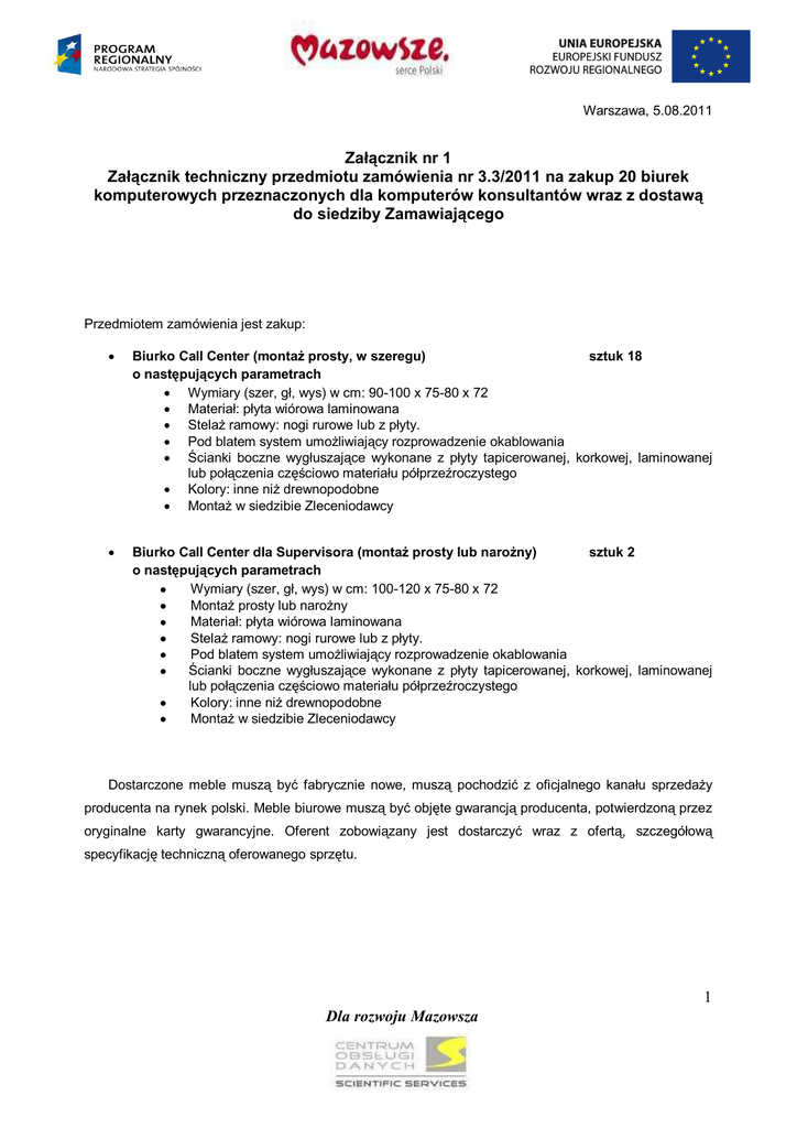 Warszawa, 5.08.2011 Załącznik nr 1 Załącznik techniczny przedmiotu zamówienia nr 3.3/2011 na zakup 20 biurek komputerowych przeznaczonych dla komputerów konsultantów wraz z dostawą do siedziby Zamawiającego Przedmiotem zamówienia jest zakup: Biurko Call Center (montaż prosty, w szeregu) sztuk 18 o następujących parametrach Wymiary (szer, gł, wys) w cm: 90-100 x 75-80 x 72 Materiał: płyta wiórowa laminowana Stelaż ramowy: nogi rurowe lub z płyty. Pod blatem system umożliwiający rozprowadzenie okablowania Ścianki boczne wygłuszające wykonane z płyty tapicerowanej, korkowej, laminowanej lub połączenia częściowo materiału półprzeźroczystego Kolory: inne niż drewnopodobne Montaż w siedzibie Zleceniodawcy Biurko Call Center dla Supervisora (montaż prosty lub narożny) sztuk 2 o następujących parametrach Wymiary (szer, gł, wys) w cm: 100-120 x 75-80 x 72 Montaż prosty lub narożny Materiał: płyta wiórowa laminowana Stelaż ramowy: nogi rurowe lub z płyty. Pod blatem system umożliwiający rozprowadzenie okablowania Ścianki boczne wygłuszające wykonane z płyty tapicerowanej, korkowej, laminowanej lub połączenia częściowo materiału półprzeźroczystego Kolory: inne niż drewnopodobne Montaż w siedzibie Zleceniodawcy Dostarczone meble muszą być fabrycznie nowe, muszą pochodzić z oficjalnego kanału sprzedaży producenta na rynek polski. Meble biurowe muszą być objęte gwarancją producenta, potwierdzoną przez oryginalne karty gwarancyjne. Oferent zobowiązany jest dostarczyć wraz z ofertą, szczegółową specyfikację techniczną oferowanego sprzętu. 1 Dla rozwoju Mazowsza