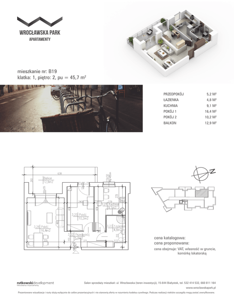 mieszkanie nr: B19 klatka: 1, piętro: 2, pu = 45,7 m2 PRZEDPOKÓJ5,2 M2 ŁAZIENKA 4,8 M2 KUCHNIA 9,1 M2 POKÓJ 1 16,4 M2 POKÓJ 2 10,2 M2 BALKON 12,9 M2 cena katalogowa: cena proponowana: cena obejmuje: VAT, własność w gruncie, komórkę lokatorską Salon sprzedaży mieszkań: ul. Wrocławska (teren inwestycji), 15-644 Białystok, tel. 532 414 532, 660 811 164 www.wroclawskapark.pl Prezentowane wizualizacje i rzuty służą wyłącznie do celów prezentacyjnych i nie stanowią oferty w rozumieniu kodeksu cywilnego. Podczas realizacji niektóre szczegóły mogą zostać zweryfikowane.