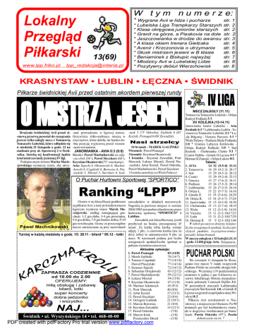 Lokalny Przegląd Piłkarski www.lpp.friko.pl W tym n u m e r z e: * Wygrane Avii w lidze i pucharze 13(69) [email protected] * * * * * * * * * * Lubelska Liga Trampkarzy Starszych Klasa okręgowa juniorów starszych Granit na górze, a Piaskovia na dole Jaszczowianka w drodze do awansu A klasa okiem trenera Giełzaka Avenir i Krzczonovia o utrzymanie Głusk mistrzem jesieni w B klasie Beniaminek z Biskupic najwyżej Młodzicy Avii w Lubelskiej Lidze Pozytywny debiut Wierzchowisk str. 1 str. 2 str. 2 str. 2 str. 3 str. 4 str. 5 str. 6 str. 7 str. 8 str. 8 KRASNYSTAW • LUBLIN • ŁĘCZNA • ŚWIDNIK Piłkarze świdnickiej Avii przed ostatnim akordem pierwszej rundy O MISTRZA JESIENI Drużynie świdnickiej Avii przed zi-mową przerwą pozostał do rozegrania jeszcze tylko zaległy mecz z Tomasovią Tomaszów Lubelski, który odbędzie się w niedzielę 21 listopada o godz. 12 na stadionie przy ul. Sportowej 2 w Świd-niku. Stawką tej konfrontacji będzie tytuł mistrzarundy jesiennej IV ligi. Podopiecznym trenera Marka Macie-jewskiego wystarczy remis, aby utrzy- -mać prowadzenie w ligowej stawce. Oczywiście żółto-niebiescy mierzą w zwycięstwo, które dałoby im bardzo do-brą pozycję wyjściową przed wiosen-nymi rewanżami. JANOWIANKA - AVIA 0:3 (0:0) Bramki: Paweł Machnikowski na zdję-ciu obok (56’), Paweł Sieczkarz (66’), Krystian Okoniewski (75’-rzut karny). Avia: Sajecki 6, Okoniewski 6, Machni-kowski 6, Czępiński 6, Borowiec 6, Pta-szyński 5, Misztal 5, Sieczkarz 6, Ład- -niak 5 (75’ Oskroba), Galiński 6 (85’ Kozieł), Pranagal 6 (86’Zawadzki). Nasi strzelcy 10 bramek - MAREK GALIŃSKI 9 bramek - Paweł Pranagal 3 bramki - Krystian Okoniewski 1 bramka - Krystian Zawadzki, Piotr Marczuk, Łukasz Misztal, Dawid Pta-szyński, Artur Kozieł, Paweł Oskroba, Paweł Machnikowski, Paweł Sieczkarz 1 bramka samobójcza (Wisła Puławy) O Puchar Hurtowni Sportowej “SPORTICO” Ranking “LPP” Paweł Machnikowski Ocenie w tej klasyfikacji poddawani są piłkarze Avii, a noty po każdym meczu ligowym wystawia trener Marek Ma-ciejewski, według następującej gra-dacji: 1-2 gra słaba, 3-4 gra przeciętna, 5-6 gra dobra, 7-8 gra bardzo dobra, 9-10 gra rewelacyjna. Oceny za poszczególne mecze umieszczane są przy nazwiskach Turniej w każdą niedzielę o godz. 15: 28.11 - bilard * 05.12 - lotki zawodników w składach meczowych. Nagrodą za pierwsze miejsce w sezonie 2004/2005 jest puchar ufundowany przez hurtownię sportową “SPORTICO” z Lublina. Zawodnik jest klasyfikowany jeżeli przebywał na boisku przynajmniej 45 minut. Za każdą żółtą kartkę zostaje odjęty 1 pkt., a czerwona kartka (nie za dwie żółte) to automatycznie 0 pkt. za mecz. W nawiasach podana jest liczba rozegranych spotkań/liczba spotkań w pełnym wymiarze czasowym. Aktualna sytuacja: ZAPRASZA CODZIENNIE od 10.00 do 2.00 OFERUJEMY: miłą obsługę i zabawę bilard, lotki super koncerty dobre jedzonko i wszystko NAJ... 1. Paweł Pranagal 2. Marek Galiński 3. Tomasz Czępiński Dawid Ptaszyński 5. Ireneusz Sajecki 6. Sebastian Orzędowski 7. Paweł Machnikowski 8. Łukasz Misztal 9. Krystian Okoniewski 10. Mariusz Adamczyk 11. Piotr Marczuk 12. Artur Kozieł 13. Paweł Sieczkarz 14. Grzegorz Ładniak 15. Marcin Borowiec 16. Krystian Zawadzki 17. Paweł Oskroba 18. Marcin Kruk Przemysław Drozd Świdnik • ul. Wyszyńskiego 14 • tel. 468-48-00 PDF created with pdfFactory Pro trial version www.pdffactory.com 83 (14/8) 78 (14/7) 77 (14/14) 77 (14/14) 72 (14/13) 63 (12/12) 59 (12/11) 54 (13/8) 47 (11/8) 43 (9/3) 40 (8/8) 37 (13/1) 23 (8/4) 22 (10/1) 21 (4/4) 14 (12/1) - (7/0) - (1/0) - (1/0) IV LIGA MECZ ZALEGŁY (11.11) Tomasovia Tomaszów Lubelski - Orlęta Radzyń Podlaski 2:1. XV KOLEJKA (13-14.11) Janowianka Janów Lubelski - Avia Świdnik 0:3 * Lublinianka Lublin - To-masovia Tomaszów Lubelski 2:1 * Ła-da Biłgoraj - Victoria Parczew 1:1 * Wisła Puławy - Podlasie Biała Podlaska 1:0 * Granica Lubycza Królewska Orlęta Radzyń Podlaski 1:0 * Stal Kraśnik - Chełmianka Chełm 5:1 * Czarni Dęblin - Górnik II Łęczna 1:1 * Hetman II Zamość - Orlęta Łuków 0:2. Tabela: 1. AVIA 14 32 (9-5-0) 31:11 2. Tomasovia 14 29 (9-2-3) 28:17 3. Stal 15 29 (8-5-2) 28:12 4. Czarni 15 29 (9-2-4) 25:15 5. Granica 15 27 (7-6-2) 18:11 6. Podlasie 15 26 (7-5-3) 20:14 7. Lublinianka 15 24 (7-3-5) 26:16 8. Orlęta Ł. 15 22 (5-7-3) 16:16 9. Górnik II 15 19 (5-4-6) 26:29 10. Orlęta R. 15 18 (5-3-7) 37:24 11. Janowianka 15 15 (4-3-8) 18:30 12. Chełmianka 15 13 (2-7-6) 10:19 13. Wisła 15 12 (3-3-9) 14:34 14. Victoria 15 11 (3-2-10)17:23 15. Łada 15 11 (3-2-10)17:29 16. Hetman II 15 9 (2-3-10)13:44 W tabeli po nazwie drużyny kolejno: liczba rozegranych spotkań, liczba zdo-bytych punktów, zwycięstwa-remisyporażki, bilans bramek. W meczu zaległym z XI kolejki (21.11 - godz. 12.00) grają: Avia - Tomasovia. PUCHAR POLSKI We czwartek 11 listopada br. Roze-grano trzy mecze V rundy rozgrywek Pucharu Polski na szczeblu okręgu lub-elskiego. Wcześniej (19 października) awansem w jednej z par A-klasowe re-zerwy lubelskiego Motoru niespodzie-wanie pokonały Czarnych Dęblin 3:1. W pozostałych meczach Lublinianka zwyciężyła Stal Kraśnik 1:0, a Górnik II Łęczna rozgromił zespół puławskiej Wi-słyaż 8:2. Piłkarze Avii rywalizowali w Nie-drzwicy z miejscowym Orionem. Po 90 minutach gry był bezbramkowy remis, ale w dogrywce świdniczanie po bram-kach: Pawła Oskroby (97’), Pawła dokończenie na str. 7 str. 2 Lokalny Przegląd Piłkarski KLASA OKRĘGOWA XV KOLEJKA (13-14.11) GRANIT BYCHAWA - POLESIE KOCK 6:0 (2:0) Bramki: Bartłomiej Teodorowicz 2 (22’-karny, 55’), Jarosław Stępień 2 (35’, 73’), Jacek Niedzielski (58’), Sławomir Skrzypczak (89’). Granit: Łapiński, Feliński, Banach, Niedzielski, Olko, Różycki, Ładniak, Milanowski, Bieda (74’ Maciejczyk), Teodorowicz (76’ Skrzypczak), Stępień (76’Wiater). PIASKOVIA PIASKI - SYGNAŁ LUBLIN 2:3 (1